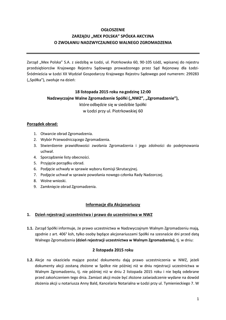 OGŁOSZENIE ZARZĄDU „MEX POLSKA” SPÓŁKA AKCYJNA O ZWOŁANIU NADZWYCZAJNEGO WALNEGO ZGROMADZENIA Zarząd „Mex Polska” S.A. z siedzibą w Łodzi, ul. Piotrkowska 60, 90-105 Łódź, wpisanej do rejestru przedsiębiorców Krajowego Rejestru Sądowego prowadzonego przez Sąd Rejonowy dla ŁodziŚródmieścia w Łodzi XX Wydział Gospodarczy Krajowego Rejestru Sądowego pod numerem: 299283 („Spółka”), zwołuje na dzień: 18 listopada 2015 roku na godzinę 12:00 Nadzwyczajne Walne Zgromadzenie Spółki („NWZ”, „Zgromadzenie”), które odbędzie się w siedzibie Spółki w Łodzi przy ul. Piotrkowskiej 60 Porządek obrad: 1. Otwarcie obrad Zgromadzenia. 2. Wybór Przewodniczącego Zgromadzenia. 3. Stwierdzenie prawidłowości zwołania Zgromadzenia i jego zdolności do podejmowania uchwał. 4. Sporządzenie listy obecności. 5. Przyjęcie porządku obrad. 6. Podjęcie uchwały w sprawie wyboru Komisji Skrutacyjnej. 7. Podjęcie uchwał w sprawie powołania nowego członka Rady Nadzorczej. 8. Wolne wnioski. 9. Zamknięcie obrad Zgromadzenia. Informacje dla Akcjonariuszy 1. Dzień rejestracji uczestnictwa i prawo do uczestnictwa w NWZ 1.1. Zarząd Spółki informuje, że prawo uczestnictwa w Nadzwyczajnym Walnym Zgromadzeniu mają, zgodnie z art. 4061 ksh, tylko osoby będące akcjonariuszami Spółki na szesnaście dni przed datą Walnego Zgromadzenia (dzień rejestracji uczestnictwa w Walnym Zgromadzeniu), tj. w dniu: 2 listopada 2015 roku 1.2. Akcje na okaziciela mające postać dokumentu dają prawo uczestniczenia w NWZ, jeżeli dokumenty akcji zostaną złożone w Spółce nie później niż w dniu rejestracji uczestnictwa w Walnym Zgromadzeniu, tj. nie później niż w dniu 2 listopada 2015 roku i nie będą odebrane przed zakończeniem tego dnia. Zamiast akcji może być złożone zaświadczenie wydane na dowód złożenia akcji u notariusza Anny Bald, Kancelaria Notarialna w Łodzi przy ul. Tymienieckiego 7. W 1 zaświadczeniu wskazuje się numery dokumentów akcji i stwierdza, że dokumenty akcji nie będą wydane przed upływem dnia rejestracji uczestnictwa w Walnym Zgromadzeniu. Na żądanie uprawnionego ze zdematerializowanych akcji Spółki zgłoszone nie wcześniej niż po ogłoszeniu o zwołaniu NWZ, tj. nie wcześniej niż w dniu 23 października 2015 roku i nie później niż w pierwszym dniu powszednim po dniu rejestracji uczestnictwa w Walnym Zgromadzeniu, tj. nie później niż w dniu 3 listopada 2015 roku, podmiot prowadzący rachunek papierów wartościowych wystawia imienne zaświadczenie o prawie uczestnictwa w NWZ Spółki. 1.3. Listę uprawnionych do uczestnictwa w NWZ, Spółka ustala na podstawie wykazu sporządzonego przez podmiot prowadzący depozyt papierów wartościowych zgodnie z przepisami o obrocie instrumentami finansowymi oraz złożonych w Spółce dokumentów akcji bądź zaświadczeń wydanych na dowód złożenia akcji u notariusza. 1.4. Lista akcjonariuszy uprawnionych do udziału w NWZ, zgodnie z art. 407 ksh zostanie wyłożona w Biurze Zarządu Spółki przy ul. Piotrkowskiej 60 w Łodzi przez trzy dni powszednie przed odbyciem NWZ tj. w dniach 13, 16 i 17 listopada 2015 roku w godzinach od 10.00 do 15.00. Akcjonariusze mogą przeglądać listę akcjonariuszy w Biurze Zarządu Spółki oraz żądać odpisu listy za zwrotem kosztów jego sporządzenia. W okresie trzech dni powszednich przed odbyciem NWZ, akcjonariusze Spółki mogą żądać przysłania im listy akcjonariuszy nieodpłatnie pocztą elektroniczną, podając adres, na który lista powinna być wysłana. Żądanie powinno zostać sporządzone w formie pisemnej, podpisane przez akcjonariusza lub przez osoby uprawnione do reprezentacji akcjonariusza oraz dostarczone osobiście do Biura Zarządu Spółki lub za pośrednictwem poczty elektronicznej na adres – [email protected] w formacie „pdf” lub innym formacie pozwalającym na jego odczytanie przez Spółkę lub wysłane faksem na nr +48 42 634 67 53. Do żądania powinny zostać dołączone kopie dokumentów potwierdzających tożsamość akcjonariusza lub osób działających w imieniu akcjonariusza, w tym: a. w przypadku akcjonariusza będącego osobą fizyczną – kopia dowodu osobistego, paszportu lub innego urzędowego dokumentu tożsamości akcjonariusza; albo b. w przypadku akcjonariusza innego niż osoba fizyczna – kopia odpisu z właściwego rejestru lub innego dokumentu potwierdzającego upoważnienie osoby fizycznej (osób fizycznych) do reprezentowania akcjonariusza na NWZ (np. nieprzerwany ciąg pełnomocnictw); lub c. w przypadku zgłoszenia żądania przez pełnomocnika – kopia dokumentu pełnomocnictwa podpisana przez akcjonariusza lub przez osoby uprawnione do reprezentowania akcjonariusza oraz kopia dowodu osobistego, paszportu lub innego urzędowego dokumentu tożsamości pełnomocnika lub w przypadku pełnomocnika innego niż osoba fizyczna – kopia odpisu z właściwego rejestru lub innego dokumentu potwierdzającego upoważnienie osoby fizycznej (osób fizycznych) do reprezentowania pełnomocnika na NWZ (np. nieprzerwany ciąg pełnomocnictw) oraz dowodu osobistego, paszportu lub innego urzędowego dokumentu tożsamości osoby fizycznej (osób fizycznych) upoważnionych do reprezentowania pełnomocnika na NWZ. 2 2. Procedury uczestnictwa w NWZ i wykonywania prawa głosu 2.1. Prawo do żądania umieszczenia określonych spraw w porządku obrad NWZ Zgodnie z art. 401 § 1 ksh, akcjonariusz lub akcjonariusze reprezentujący co najmniej jedną dwudziestą kapitału zakładowego Spółki są uprawnieni do żądania umieszczenia określonych spraw w porządku obrad Zgromadzenia. Żądanie powinno zostać zgłoszone Zarządowi Spółki nie później niż na dwadzieścia jeden dni przed terminem NWZ, tj. do dnia 28 października 2015 roku. Żądanie powinno zawierać uzasadnienie lub projekt uchwały dotyczącej proponowanego punktu porządku obrad. Żądanie w formie pisemnej może zostać 