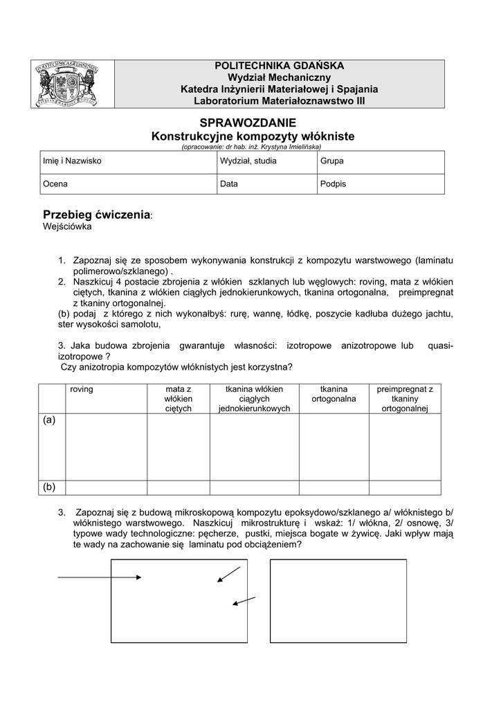 POLITECHNIKA GDAŃSKA Wydział Mechaniczny Katedra Inżynierii Materiałowej i Spajania Laboratorium Materiałoznawstwo III SPRAWOZDANIE Konstrukcyjne kompozyty włókniste (opracowanie: dr hab. inż. Krystyna Imielińska) Imię i Nazwisko Wydział, studia Grupa Ocena Data Podpis Przebieg ćwiczenia: Wejściówka 1. Zapoznaj się ze sposobem wykonywania konstrukcji z kompozytu warstwowego (laminatu polimerowo/szklanego) . 2. Naszkicuj 4 postacie zbrojenia z włókien szklanych lub węglowych: roving, mata z włókien ciętych, tkanina z włókien ciągłych jednokierunkowych, tkanina ortogonalna, preimpregnat z tkaniny ortogonalnej. (b) podaj z którego z nich wykonałbyś: rurę, wannę, łódkę, poszycie kadłuba dużego jachtu, ster wysokości samolotu, 3. Jaka budowa zbrojenia gwarantuje własności: izotropowe izotropowe ? Czy anizotropia kompozytów włóknistych jest korzystna? roving mata z włókien ciętych tkanina włókien ciągłych jednokierunkowych anizotropowe lub tkanina ortogonalna quasi- preimpregnat z tkaniny ortogonalnej (a) (b) 3. Zapoznaj się z budową mikroskopową kompozytu epoksydowo/szklanego a/ włóknistego b/ włóknistego warstwowego. Naszkicuj mikrostrukturę i wskaż: 1/ włókna, 2/ osnowę, 3/ typowe wady technologiczne: pęcherze, pustki, miejsca bogate w żywicę. Jaki wpływ mają te wady na zachowanie się laminatu pod obciążeniem? 3. Kajaki wykonuje się z dość ciężkich (jak na tworzywa sztuczne) kompozytów poliestrowo/ szklanych wzmacnianych matą szklana (gęstość 2,3 Mg/m3). Alternatywnie stosuje się laminaty wzmacniane organicznymi włóknami aramidowymi (poliamidu aromatycznego, znanego pod nazwą handlową Kevlar) o gęstości 1,44 Mg/m3. Wyjaśnij dlaczego wykorzystanie włókien aramidowych jest korzystniejsze i skąd wynikają wyjątkowe własności tych włókien ? Kompozyty strukturalne - Konstrukcje przekładkowe 1. Po obejrzeniu eksponatów i dokumentacji wypisz wykonane: Ścianka nadbudówki statku Poszycie kadłuba 30m jachtu Ścianka samochodu dostawczego Naszkicuj przekrój wybranej konstrukcji z jakich elementów mogą być narta Ścianka działowa szybkiego pociągu (TGV)