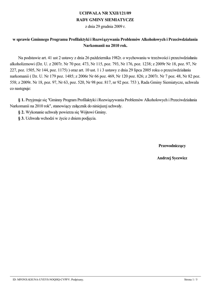 UCHWAŁA NR XXII/121/09 RADY GMINY SIEMIATYCZE z dnia 29 grudnia 2009 r. w sprawie Gminnego Programu Profilaktyki i Rozwiązywania Problemów Alkoholowych i Przeciwdziałania Narkomanii na 2010 rok. Na podstawie art. 41 ust 2 ustawy z dnia 26 października 1982r. o wychowaniu w trzeźwości i przeciwdziałaniu alkoholizmowi (Dz. U. z 2007r. Nr 70 poz. 473, Nr 115, poz. 793, Nr 176, poz. 1238; z 2009r Nr 18, poz. 97, Nr 227, poz. 1505, Nr 144, poz. 1175) ) oraz art. 10 ust. 1 i 3 ustawy z dnia 29 lipca 2005 roku o przeciwdziałaniu narkomanii ( Dz. U. Nr 179 poz. 1485; z 2006r Nr 66 poz. 469, Nr 120 poz. 826; z 2007r. Nr 7 poz. 48, Nr 82 poz. 558; z 2009r. Nr 18, poz. 97, Nr 63, poz. 520, Nr 98 poz. 817, nr 92 poz. 753 ), Rada Gminy Siemiatycze, uchwala co następuje: § 1. Przyjmuje się "Gminny Program Profilaktyki i Rozwiązywania Problemów Alkoholowych i Przeciwdziałania Narkomanii na 2010 rok", stanowiący załącznik do niniejszej uchwały. § 2. Wykonanie uchwały powierza się Wójtowi Gminy. § 3. Uchwała wchodzi w życie z dniem podjęcia. Przewodniczący Andrzej Sycewicz Załącznik do Uchwały Nr XXII/121/09 Rady Gminy Siemiatycze z dnia 29 grudnia 2009 r. GMINNY PROGRAM PROFILAKTYKI I ROZWIĄZYWANIA PROBLEMÓW ALKOHOLOWYCH I PRZECIWDZIALANIA NARKOMANII NA 2010 ROK. Rozdział 1 Zwiększenie dostępności i pomocy terapeutycznej i rehalilitacyjnej dla osób uzależnionych od alkoholu i narkotyków. 1) Zwiększenie dostępności pomocy terapeutycznej dla osób uzależnionych od alkoholu i narkotyków nastąpi poprzez: - zapewnienie możliwości korzystania z leczenia w Poradni Leczenia Uzależnień Alkoholowych i Współuzależnień po leczeniu ambulatoryjnym, kontynuacji terapii poprzez finansowanie ich udziału w programach terapeutycznych proponowanych przez zakłady lecznictwa odwykowego jak też pomoc w zakupie potrzebnych lekarstw, ID: MFONX-KSUNA-UYEYS-NOQHQ-CVPFV. Podpisany. Strona 1 / 5 - opłacenie kosztów powołania biegłego orzekającego w przedmiocie uzależnienia od alkoholu lub narkotyków. - dofinansowanie zajęć terapeutycznych, na wniosek osoby korzystającej z usług lub grup wsparcia. Andrzej Sycewicz Załącznik do Uchwały Nr XXII/121/09 Rady Gminy Siemiatycze z dnia 29 grudnia 2009 r. GMINNY PROGRAM PROFILAKTYKI I ROZWIĄZYWANIA PROBLEMÓW ALKOHOLOWYCH I PRZECIWDZIALANIA NARKOMANII NA 2010 ROK. Rozdział 1 Zwiększenie dostępności i pomocy terapeutycznej i rehalilitacyjnej dla osób uzależnionych od alkoholu i narkotyków. 1) Zwiększenie dostępności pomocy terapeutycznej dla osób uzależnionych od alkoholu i narkotyków nastąpi poprzez: - zapewnienie możliwości korzystania z leczenia w Poradni Leczenia Uzależnień Alkoholowych i Współuzależnień po leczeniu ambulatoryjnym, kontynuacji terapii poprzez finansowanie ich udziału w programach terapeutycznych proponowanych przez zakłady lecznictwa odwykowego jak też pomoc w zakupie potrzebnych lekarstw, - opłacenie kosztów powołania biegłego orzekającego w przedmiocie uzależnienia od alkoholu lub narkotyków. - dofinansowanie zajęć terapeutycznych, na wniosek osoby korzystającej z usług lub grup wsparcia. Rozdział 2 Udzielanie rodzinom pomocy psychspołecznej i prawnej. 2) Udzialanie rodzinom, w których występują problemy alkoholowe i uzależnienie od narkotyków pomocy psychospołecznej i prawnej, a w szczególności przed przemocą w rodzinie w sposób następujący: - przyjmowania zgłoszeń o występujących problemach, - wzywania na rozmowy osób uzależnionych, - kierowanie osób uzależnionych na badania, - występowania z wnioskami do Sądu Rejonowego. 3) Umożliwienie członkom rodzin z problemem uzależnień udziału w programach terapeutycznych. 4) Zapewnienie pacjentom z terenu Gminy Siemiatycze przeprowadzenia badań przesiewowych w zakładach opieki zdrowotnej. 5) Kierowanie do Poradni Uzależnień lub zakładu lecznictwa odwykowego osób dobrowolnie poddających się leczeniu odwykowemu. 6) Prowadzenie akcji informacyjnej o ośrodkach interwencji kryzysowej w województwie podlaskim, schroniskach realizujących programy pomocy psychologicznej i środowiskowej, telefony zaufania. 7) Realizacja projektu interwencji przemocy domowej "niebieska karta" MFONX-KSUNA-UYEYS-NOQHQ-CVPFV. Podpisany. 8)ID:Kierowanie osób do ośrodków interwencji kryzysowej. Strona 2 / 5 9) Udział w szkoleniach i seminariach przedstawicieli Gminnej Komisji Rozwiązywania Problemów Alkoholowych. 7) Realizacja projektu interwencji przemocy domowej "niebieska karta" 8) Kierowanie osób do ośrodków interwencji kryzysowej. 9) Udział w szkoleniach i seminariach przedstawicieli Gminnej Komisji Rozwiązywania Problemów Alkoholowych. 10) Wsparcie organizacyjne i finansowe świetlic funkcjonujących przy szkołach gminnych, realizujących programy profilaktyki uzależnień. 11) Wsparcie organizacyjne i finansowe placówek dziennego pobytu dzieci i młodzieży przy realizacji programów wychowawczych. 12) Finansowanie koniecznych programów socjoterapeutycznych dla dzieci z rodzin z problemem alkoholowym. 13. Dofinansowanie wypoczynku letniego dzieciom na obozach i innych form wypoczynku letniego. 14) Udzielenie informacji dotyczących możliwości uzyskania specjalistycznej pomocy osobom uzależnionym i ich rodzinom. 15) Umożliwienie korzystania z zajęć terapeutycznych osobom uzależnionym od narkotyków. 16) Systematyczna współpraca z Zespołem Opieki Zdrowotnej, a zwłaszcza z Poradnią Zdrowia Psychicznego, Poradnia Uzależnień, Szpitalem specjalistycznym dla Nerwowo i Psychicznie Chorych w Choroszczy umożliwiająca szybkie kierowanie na leczenie oraz dalszą specjalistyczną terapię. 17) Upowszechnienie poprzez umieszczenie w ogólnodostępnych miejscach informacji o numerach telefonów zaufania. Rozdział 3 Prowadzenie profilaktyki i edukacji dla dzieci i młodzieży. 18) Opracowanie i wdrożenie szkolnych projektów profilaktyki uzależnień w ramach programu wychowawczego szko