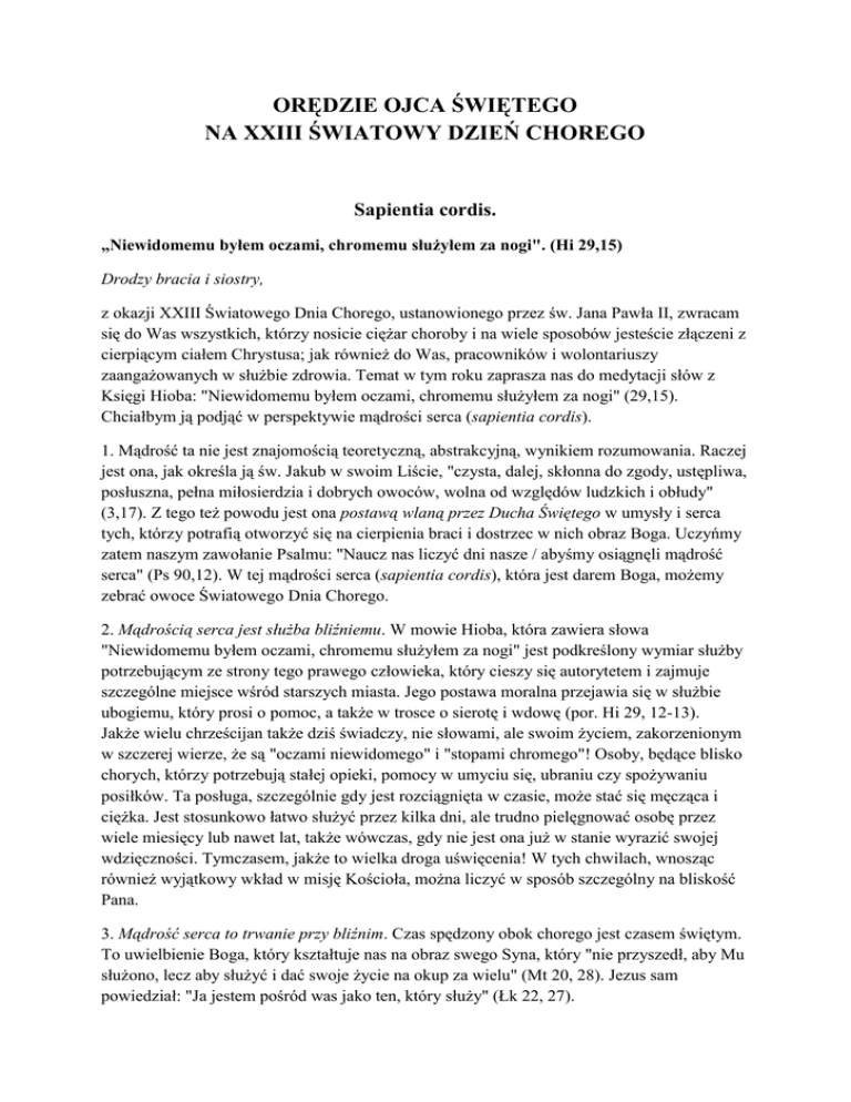ORĘDZIE OJCA ŚWIĘTEGO NA XXIII ŚWIATOWY DZIEŃ CHOREGO Sapientia cordis. „Niewidomemu byłem oczami, chromemu służyłem za nogi". (Hi 29,15) Drodzy bracia i siostry, z okazji XXIII Światowego Dnia Chorego, ustanowionego przez św. Jana Pawła II, zwracam się do Was wszystkich, którzy nosicie ciężar choroby i na wiele sposobów jesteście złączeni z cierpiącym ciałem Chrystusa; jak również do Was, pracowników i wolontariuszy zaangażowanych w służbie zdrowia. Temat w tym roku zaprasza nas do medytacji słów z Księgi Hioba: "Niewidomemu byłem oczami, chromemu służyłem za nogi" (29,15). Chciałbym ją podjąć w perspektywie mądrości serca (sapientia cordis). 1. Mądrość ta nie jest znajomością teoretyczną, abstrakcyjną, wynikiem rozumowania. Raczej jest ona, jak określa ją św. Jakub w swoim Liście, "czysta, dalej, skłonna do zgody, ustępliwa, posłuszna, pełna miłosierdzia i dobrych owoców, wolna od względów ludzkich i obłudy" (3,17). Z tego też powodu jest ona postawą wlaną przez Ducha Świętego w umysły i serca tych, którzy potrafią otworzyć się na cierpienia braci i dostrzec w nich obraz Boga. Uczyńmy zatem naszym zawołanie Psalmu: "Naucz nas liczyć dni nasze / abyśmy osiągnęli mądrość serca" (Ps 90,12). W tej mądrości serca (sapientia cordis), która jest darem Boga, możemy zebrać owoce Światowego Dnia Chorego. 2. Mądrością serca jest służba bliźniemu. W mowie Hioba, która zawiera słowa "Niewidomemu byłem oczami, chromemu służyłem za nogi" jest podkreślony wymiar służby potrzebującym ze strony tego prawego człowieka, który cieszy się autorytetem i zajmuje szczególne miejsce wśród starszych miasta. Jego postawa moralna przejawia się w służbie ubogiemu, który prosi o pomoc, a także w trosce o sierotę i wdowę (por. Hi 29, 12-13). Jakże wielu chrześcijan także dziś świadczy, nie słowami, ale swoim życiem, zakorzenionym w szczerej wierze, że są "oczami niewidomego" i "stopami chromego"! Osoby, będące blisko chorych, którzy potrzebują stałej opieki, pomocy w umyciu się, ubraniu czy spożywaniu posiłków. Ta posługa, szczególnie gdy jest rozciągnięta w czasie, może stać się męcząca i ciężka. Jest stosunkowo łatwo służyć przez kilka dni, ale trudno pielęgnować osobę przez wiele miesięcy lub nawet lat, także wówczas, gdy nie jest ona już w stanie wyrazić swojej wdzięczności. Tymczasem, jakże to wielka droga uświęcenia! W tych chwilach, wnosząc również wyjątkowy wkład w misję Kościoła, można liczyć w sposób szczególny na bliskość Pana. 3. Mądrość serca to trwanie przy bliźnim. Czas spędzony obok chorego jest czasem świętym. To uwielbienie Boga, który kształtuje nas na obraz swego Syna, który "nie przyszedł, aby Mu służono, lecz aby służyć i dać swoje życie na okup za wielu" (Mt 20, 28). Jezus sam powiedział: "Ja jestem pośród was jako ten, który służy" (Łk 22, 27). Prośmy z żywą wiarą Ducha Świętego, aby dał nam łaskę zrozumienia wartości towarzyszenia, często w sposób cichy, tym naszym siostrom i braciom, którzy, dzięki naszej bliskości i naszej życzliwości, poczują się bardziej kochani i umocnieni. Jakież wielkie kłamstwo kryje się natomiast w niektórych wyrażeniach, które kładą nacisk na tzw. "jakość życia", przekonując do uwierzenia, że życie poważnie dotknięte chorobą nie jest warte dalszej egzystencji! 4. Mądrość serca to wyjście poza siebie ku bliźniemu. Świat, w którym żyjemy zapomina niekiedy o szczególnej wartości, jaką ma czas spędzony przy łóżku chorego, gdyż jest się pochłoniętym przez pośpiech, nawał obowiązków, rzeczy do wykonania i w ten sposób łatwo zapomina się o wartości bezinteresownej opieki nad bliźnim. U źródeł takiej postawy jest często letnia wiara, która zapomniała o słowach Pana: "Wszystko to Mnieście uczynili" (Mt 25, 40). Dlatego chciałbym przypomnieć raz jeszcze, "absolutny priorytet, jakim jest wyjście poza siebie ku bratu", jako jedno z dwóch głównych przykazań stanowiących fundament wszelkich norm moralnych i jako najjaśniejszy znak przy dokonywaniu rozeznania na drodze duchowego rozwoju, w odpowiedzi na absolutnie bezinteresowny dar Boga. (Adhortacja Apostolska, Evangelii gaudium, 179). Z samej natury misyjnej Kościoła wypływa "czynna miłość wobec bliźniego, współczucie, które rozumie, towarzyszy i promuje" (tamże). 5. Mądrość serca oznacza być solidarnym z bliźnim bez osądzania go. Miłość potrzebuje czasu. Czasu, aby leczyć chorych i czasu na ich odwiedzanie. Czasu, aby zatrzymać się przy nich, jak przyjaciele Hioba: "Siedzieli z nim na ziemi siedem dni i siedem nocy, nikt nie wyrzekł słowa, bo widzieli ogrom jego bólu"(Hi 2,13). Przyjaciele Hioba jednakże ukrywali w sobie negatywny osąd o nim: myśleli, że jego nieszczęście było karą Bożą za popełnioną winę. Natomiast prawdziwa miłość jest dzieleniem się bez osądzania, bez usiłowania nawracania drugiego; jest wolna od fałszywej pokory, która w gruncie rzeczy szuka uznania i chełpi się z dokonanego czynu. Doświadczenie Hioba znajduje swoją autentyczną odpowiedź tylko w Krzyżu Jezusa, najwyższym akcie solidarności Boga z nami, zupełnie darmowym, bezgranicznie miłosiernym. I ta właśnie odpowiedź miłości na dramat ludzkiego cierpienia, zwłaszcza cierpienia niezawinionego, pozostaje na zawsze wpisana w ciało Chrystusa zmartwychwstałego, w te Jego chwalebne rany, które są zgorszeniem dla wiary, ale są również sprawdzianem wiary (por. Homilia podczas Kanonizacji Jana XXIII i Jana Pawła II, 27 kwietnia 2014 r.). Nawet wówczas, gdy choroba, samotność i niepełnosprawność przeważają w naszym życiu, będącym darem dla innych, doświadczenie bólu może stać się uprzywilejowanym czasem łaski i źródłem do uzyskania i umocnienia mądrości serca. W ten sposób staje się zrozumia
