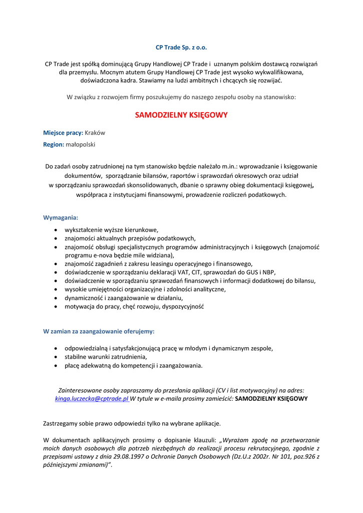 CP Trade Sp. z o.o. CP Trade jest spółką dominującą Grupy Handlowej CP Trade i uznanym polskim dostawcą rozwiązań dla przemysłu. Mocnym atutem Grupy Handlowej CP Trade jest wysoko wykwalifikowana, doświadczona kadra. Stawiamy na ludzi ambitnych i chcących się rozwijać. W związku z rozwojem firmy poszukujemy do naszego zespołu osoby na stanowisko: SAMODZIELNY KSIĘGOWY Miejsce pracy: Kraków Region: małopolski Do zadań osoby zatrudnionej na tym stanowisko będzie należało m.in.: wprowadzanie i księgowanie dokumentów, sporządzanie bilansów, raportów i sprawozdań okresowych oraz udział w sporządzaniu sprawozdań skonsolidowanych, dbanie o sprawny obieg dokumentacji księgowej, współpraca z instytucjami finansowymi, prowadzenie rozliczeń podatkowych. Wymagania: wykształcenie wyższe kierunkowe, znajomości aktualnych przepisów podatkowych, znajomość obsługi specjalistycznych programów administracyjnych i księgowych (znajomość programu e-nova będzie mile widziana), znajomość zagadnień z zakresu leasingu operacyjnego i finansowego, doświadczenie w sporządzaniu deklaracji VAT, CIT, sprawozdań do GUS i NBP, doświadczenie w sporządzaniu sprawozdań finansowych i informacji dodatkowej do bilansu, wysokie umiejętności organizacyjne i zdolności analityczne, dynamiczność i zaangażowanie w działaniu, motywacja do pracy, chęć rozwoju, dyspozycyjność W zamian za zaangażowanie oferujemy: odpowiedzialną i satysfakcjonującą pracę w młodym i dynamicznym zespole, stabilne warunki zatrudnienia, płacę adekwatną do kompetencji i zaangażowania. Zainteresowane osoby zapraszamy do przesłania aplikacji (CV i list motywacyjny) na adres: [email protected] W tytule w e-maila prosimy zamieścić: SAMODZIELNY KSIĘGOWY Zastrzegamy sobie prawo odpowiedzi tylko na wybrane aplikacje. W dokumentach aplikacyjnych prosimy o dopisanie klauzuli: „Wyrażam zgodę na przetwarzanie moich danych osobowych dla potrzeb niezbędnych do realizacji procesu rekrutacyjnego, zgodnie z przepisami ustawy z dnia 29.08.1997 o Ochronie Danych Osobowych (Dz.U.z 2002r. Nr 101, poz.926 z późniejszymi zmianami)”.