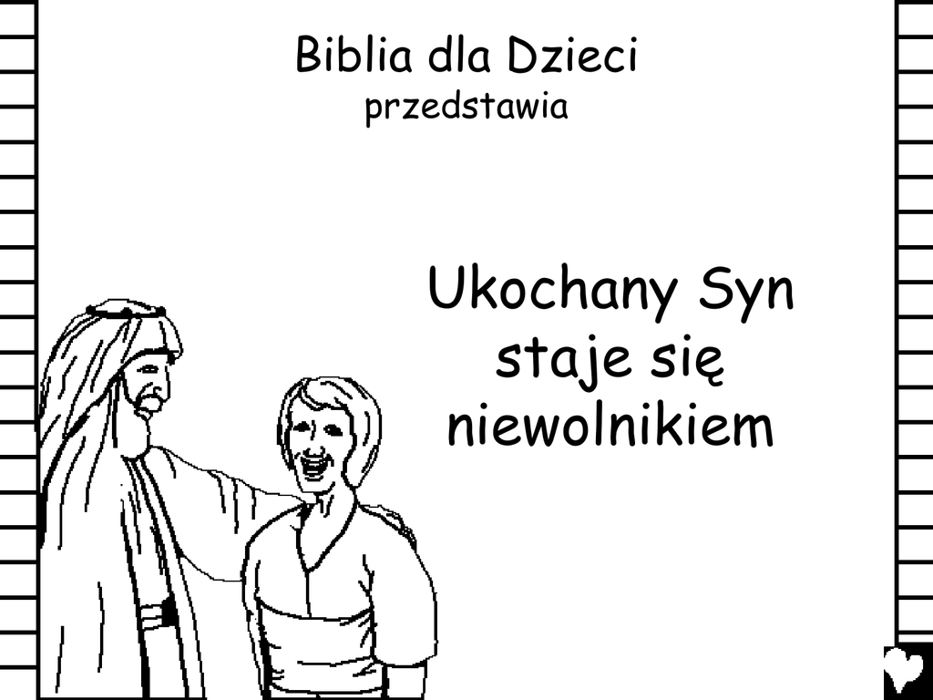 Biblia dla Dzieci przedstawia Ukochany Syn staje się niewolnikiem Autor: Edward Hughes Ilustracje: Byron Unger; Lazarus Redakcja: M. Kerr; Sarah S. Tłumaczenie: Katarzyna Gablewska Druk i oprawa: Bible for Children www.M1914.org BFC PO Box 3 Winnipeg, MB R3C 2G1 Canada ©2011 Bible for Children, Inc. Kopiowanie, wypożyczanie, drukowanie tej opowieści jest dozwolone za wyjątkiem wykorzystania jej w celach zarobkowych. Izaak był bardzo szczęśliwy. Jego syn Jakub powrócił do domu. Nawet jego brat Ezaw, który kiedyś zagroził mu śmiercią, powitał go serdecznie. Jednakże synowie Jakuba byli nieszczęśliwi z powodu ich młodszego brata Józefa, który był ulubionym synem Jakuba. Kiedy Józef opowiadał swoje sny, jego bracia znienawidzili go jeszcze bardziej. „Mój snop zboża podniósł się, a snopy moich braci mu się kłaniały” opowiadał Józef. Ten sen oznaczał, że Józef będzie kiedyś potężniejszy od swoich braci. W drugim śnie Józefa to gwiazdy, księżyc i nawet słońce składały mu pokłon. Rozzłościło to nawet jego ojca Jakuba, że Józef wywyższa się nad swych rodziców i braci. Pewnego dnia Jakub wysłał Józefa na łąkę, na której jego bracia wypasali swe stada. Bracia zobaczyli Józefa z daleka i nerwowo szeptali „Zabijmy tego marzyciela!” Biedny Józef nie mógł przypuszczać jakie niebezpieczeństwo czyha na niego. Ruben, najstarszy z braci nie zgadzał się z resztą, powiedział „Nie możemy przelewać krwi! Zobaczcie, jest tu taki głęboki dół, wepchniemy go tam i zostawimy Józefa na pewną śmierć!” Ruben chciał ocalić Józefa późną nocą kiedy wszyscy już zasną. Kiedy więc nadszedł Józef, jego bracia pochwycili go i zdjęli mu kolorowy płaszcz, jaki nosił. Był to prezent od Jakuba dla jego ulubionego syna. Bracia wrzucili Józefa w głąb okropnego dołu. Kiedy Ruben na chwilę odszedł, zjawiła się karawana wielbłądów zmierzająca do odległego Egiptu. „Sprzedajmy im Józefa!” krzyknął do braci Juda. Bracia dobili targu z kupcami i sprzedali Józefa za dwadzieścia srebrników. Przerażony i zrozpaczony Józef bezradnie szedł za kołyszącym się wielbłądem, który ciągnął go za sobą, coraz dalej od rodziny i ojczyzny. „Czy to jest płaszcz Józefa? Znaleźliśmy go na pustyni, jest cały zakrwawiony!” Okrutni bracia wmówili ojcu, że jakieś dzikie zwierzę zaatakowało i zabiło jego ukochanego syna. Zrozpaczony Jakub z żalu porwał swoje ubranie i opłakiwał swego syna. Nikt nie mógł go pocieszyć przez długi czas. Tymczasem w Egipcie Józef musiał być przerażony, samotny. Być może tęsknił za domem, ale nie mógł uciec. Był teraz niewolnikiem w domu Potyfara, bardzo ważnego Egipcjanina. Potyfar zauważył, że Józef był oddanym i godnym zaufania pracownikiem. Pewnego dnia Potyfar powiedział Józefowi „We wszystkim co robisz masz powodzenie. Bóg jest z tobą, dlatego chcę abyś został zarządcą mojego domu. Zajmować się będziesz wszystkimi moimi interesami i będziesz zarządzał całą moją służbą.” Pan Bóg obdarzył Potyfara dobrymi zbiorami i wielkim bogactwem z powodu Józefa. A Józef choć był teraz ważnym człowiekiem, nadal ufał Bogu i wiernie Mu służył. Wkrótce jednak Józef znów znalazł się w tarapatach. Otóż żona Potyfara była złą i przebiegłą kobietą . Zaproponowała Józefowi, żeby zajął miejsce jej męża. Józef od razu odmówił, bo nie chciał zgrzeszyć ani przeciw Bogu ani przeciw Potyfarowi. Kiedy jednak kobieta starała się go do tego zmusić, Józef uciekł. Niestety kobieta schwyciła i zabrała jego płaszcz. Wróciła do swego męża i skłamała „Twój niewolnik chciał mnie zaatakować! To jego płaszcz!” Rozzłościło to Potyfara. Być może wiedział, że jego żona kłamie, ale musiał coś z tym zrobić. Co zrobił? Potyfar wtrącił Józefa do więzienia. Pomimo tego, że był niewinny, Józef nie był ani zły ani nie stał się zgorzkniały. Każde trudne zdarzenie uczyło go, że bez względu na to gdzie jest, jeśli on będzie czcić Boga, to Bóg uczci Józefa, nawet w więzieniu. Ukochany Syn staje się niewolnikiem Opowieść z Bożego Słowa, Biblii na podstawie Księga Rodzaju 37, Księga Rodzaju 39 „Wykład słów Twoich oświeca.” Psalm 119:30 Koniec 7 60 Ta biblijna historia mówi o naszym cudownym Bogu. On nas stworzył i pragnie, abyśmy Go poznawali. Bóg wie, że robimy złe rzeczy i nazywa je grzechem. Karą za grzech jest śmierć, ale Bóg ukochał nas tak bardzo, że posłał Swojego Syna, Jezusa, na śmierć na krzyżu, żeby został ukarany za nasze grzechy. Potem Jezus powrócił do życia i wrócił do domu do Nieba! Jeśli uwierzysz w Jezusa i poprosisz Go o przebaczenie twoich grzechów, On to zrobi! Przyjdzie i zamieszka w tobie teraz, a ty będziesz żył z Nim na zawsze. Jeżeli chcesz odwrócić się od swoich grzechów, powiedz Bogu tak: Drogi Boże, wierzę, że Jezus umarł za mnie, a teraz znowu żyje. Proszę, przyjdź do mojego życia, przebacz mi moje grzechy, tak żebym mógł mieć teraz nowe życie, i żebym pewnego dnia mógł iść do Ciebie i być z Tobą na zawsze. Pomóż mi żyć dla Ciebie jako Twoje dziecko. Amen. Codziennie czytaj Biblię i rozmawiaj z Bogiem! Jan 3:16