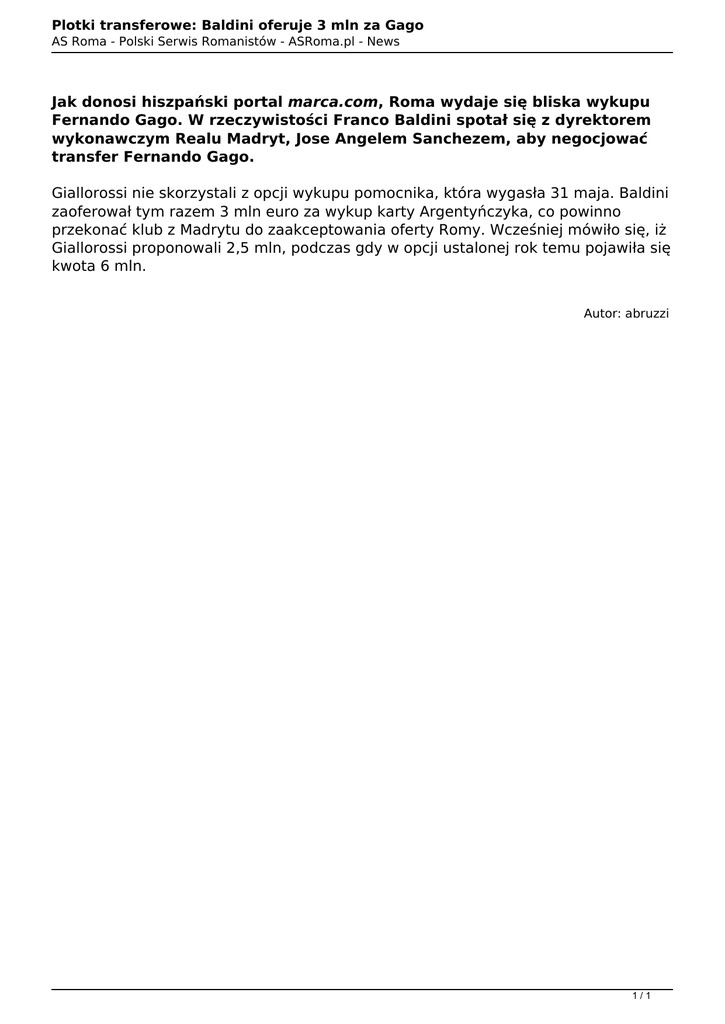 Plotki transferowe: Baldini oferuje 3 mln za Gago AS Roma - Polski Serwis Romanistów - ASRoma.pl - News Jak donosi hiszpański portal marca.com, Roma wydaje się bliska wykupu Fernando Gago. W rzeczywistości Franco Baldini spotał się z dyrektorem wykonawczym Realu Madryt, Jose Angelem Sanchezem, aby negocjować transfer Fernando Gago. Giallorossi nie skorzystali z opcji wykupu pomocnika, która wygasła 31 maja. Baldini zaoferował tym razem 3 mln euro za wykup karty Argentyńczyka, co powinno przekonać klub z Madrytu do zaakceptowania oferty Romy. Wcześniej mówiło się, iż Giallorossi proponowali 2,5 mln, podczas gdy w opcji ustalonej rok temu pojawiła się kwota 6 mln. Autor: abruzzi 1/1 Powered by TCPDF (www.tcpdf.org)