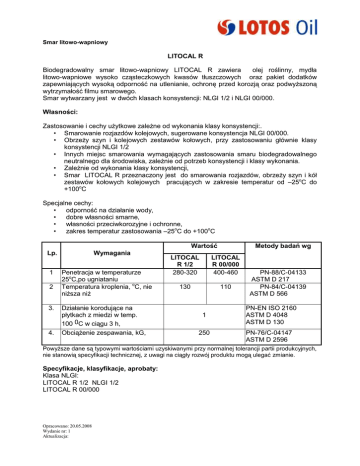 Smar litowo-wapniowy LITOCAL R Biodegradowalny smar litowo-wapniowy LITOCAL R zawiera olej roślinny, mydła litowo-wapniowe wysoko cząsteczkowych kwasów tłuszczowych oraz pakiet dodatków zapewniających wysoką odporność na utlenianie, ochronę przed korozją oraz podwyższoną wytrzymałość filmu smarowego. Smar wytwarzany jest w dwóch klasach konsystencji: NLGI 1/2 i NLGI 00/000. Własności: Zastosowanie i cechy użytkowe zależne od wykonania klasy konsystencji:. • Smarowanie rozjazdów kolejowych, sugerowane konsystencja NLGI 00/000. • Obrzeży szyn i kolejowych zestawów kołowych, przy zastosowaniu głównie klasy konsystencji NLGI 1/2 • Innych miejsc smarowania wymagających zastosowania smaru biodegradowalnego neutralnego dla środowiska, zależnie od potrzeb konsystencji i klasy wykonania. • Zależnie od wykonania klasy konsystencji, • Smar LITOCAL R przeznaczony jest do smarowania rozjazdów, obrzeży szyn i kół zestawów kołowych kolejowych pracujących w zakresie temperatur od –25oC do +100oC Specjalne cechy: • odporność na działanie wody, • dobre własności smarne, • własności przeciwkorozyjne i ochronne, • zakres temperatur zastosowania –25oC do +100oC Wartość Lp. 1 2 3. 4. Wymagania Penetracja w temperaturze 25oC,po ugniataniu Temperatura kroplenia, oC, nie niższa niż Działanie korodujące na płytkach z miedzi w temp. 100 0C w ciągu 3 h, Obciążenie zespawania, kG, Metody badań wg LITOCAL R 1/2 280-320 LITOCAL R 00/000 400-460 130 110 1 250 PN-88/C-04133 ASTM D 217 PN-84/C-04139 ASTM D 566 PN-EN ISO 2160 ASTM D 4048 ASTM D 130 PN-76/C-04147 ASTM D 2596 Powyższe dane są typowymi wartościami uzyskiwanymi przy normalnej tolerancji partii produkcyjnych, nie stanowią specyfikacji technicznej, z uwagi na ciągły rozwój produktu mogą ulegać zmianie. Specyfikacje, klasyfikacje, aprobaty: Klasa NLGI: LITOCAL R 1/2 NLGI 1/2 LITOCAL R 00/000 Opracowano: 20.05.2008 Wydanie nr: 1 Aktualizacja: Opakowanie: 10 kg, 40 kg, 180 kg Postępowanie ze smarem: Smar nie zawiera składników niebezpiecznych stwarzających bezpośrednie zagrożenie dla zdrowia organizmów żywych i środowiska. Składowanie: Opakowania z produktem winny być trzymane pod dachem w pomieszczeniach zamkniętych lub jeśli nie jest to możliwe przykryte. Produktu nie należy przechowywać w warunkach temperatur wyższych niż 60C, wystawionych na działanie promieni słonecznych lub na bardzo niskie temperatury. Zdrowie, bhp, środowisko: Informacje o produkcie dotyczące zdrowia, bhp, i wpływu na środowisko są zawarte w Karcie Bezpieczeństwa. W dokumencie tym podano szczegóły dotyczące ewentualnych zagrożeń, przestrogi i środki pierwszej pomocy wraz z omówieniem wpływu na środowisko i sposobem utylizacji produktu zużytego. LOTOS Oil S.A. nie ponosi żadnej odpowiedzialności za wykorzystywanie produktu niezgodne z przeznaczeniem lub z innymi niż podano środkami ostrożności Opracowano: 20.05.2008 Wydanie nr: 1 Aktualizacja: