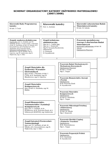 SCHEMAT ORGANIZACYJNY KATEDRY INŻYNIERII MATERIAŁOWEJ (2007/2008) Kierownik Rady Programowej katedry Dr hab. J. Ćwiek Zespoły naukowo-dydaktyczne Nauczyciele: prof. A. Zieliński, prof. W. Serbiński, dr hab. J. Ćwiek, dr hab. J. Hucińska, dr hab. K. Imielińska, dr hab. M. Szkodo, dr K. Krzysztofowicz, dr St. Rymkiewicz, dr H. Smoleńska, dr B. Świeczko-Żurek Doktoranci (studia dzienne): mgr M. Błaszkiewicz, mgr M. Budzik, mgr G. Gajowiec, mgr M. Jażdżewska, mgr B. Majkowska, mgr A. Sitko Kierownik katedry Prof. A. Zieliński Dr hab. M. Szkodo Zespół technicznoadministracyjny Mgr inż. L. Targan, kier. Mgr inż. J. Stryjewski Mgr B. Szczęsna-Raczkowska (Sekretariat) G. Wołoszyk H. Szymikowski Zespół Materiałów dla Środowisk i Warunków Ekstremalnych Kier. dr hab. J. Hucińska, dr hab. J. Ćwiek, dr H. Smoleńska, mgr M. Błaszkiewicz, mgr G. Gajowiec Zespół Materiałów Kompozytowych Kier. dr hab. K. Imielińska, mgr M. Budzik Kierownik Laboratorium Badań Materiałowych katedry Pracownie specjalistyczne tworzące Laboratorium Badań Materiałowych Kierownik Laboratorium: dr hab. M. Szkodo Opiekunowie Pracowni Pracownia Badań Mechanicznych i Mechaniczno-Korozyjnych Opiekunowie Pracowni: Dr hab. J. Ćwiek Mgr L. Targan Pracownia Biomateriałów, Korozji i Powłok Opiekunowie: Dr B. Świeczko-Żurek H. Szymikowski Pracownia Materiałów Kompozytowych Opiekunowie: Dr hab. K. Imielińska Mgr L. Targan Zespół Biomateriałów, Nanomateriałów i Symulacji Komputerowych Kier. prof. A. Zieliński, dr St. Rymkiewicz, dr B. Świeczko-Żurek, dr S. Sobieszczyk (KMiWM), mgr Jażdżewska Zespół Inżynierii Powierzchni i Nanotechnologii Kier. prof. W. Serbiński, dr hab. M. Szkodo, dr K. Krzysztofowicz, mgr B. Majkowska, mgr A. Sitko Pracownia Mikroskopii Świetlnej i Elektronowej Opiekunowie: Dr hab. M. Szkodo Mgr J. Stryjewski Pracownia Obróbki Cieplnej i Pomiarów Twardości Opiekunowie: Dr K. Krzysztofowicz Mgr L. Targan Pracownia Preparatyki Próbek Opiekunowie: Dr H. Smoleńska H. Szymikowski