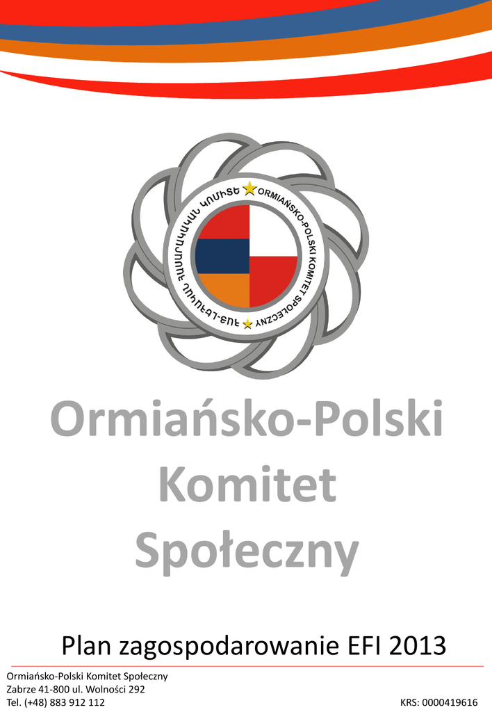 Ormiaosko-Polski Komitet Społeczny Plan zagospodarowanie EFI 2013 Ormiaosko-Polski Komitet Społeczny Zabrze 41-800 ul. Wolności 292 Tel. (+48) 883 912 112 KRS: 0000419616 W ramach zagospodarowania EFI na 2012-2014 z zakresu: opracowywanie i wdrażanie procesu integracji nowo przybyłych obywateli paostw trzecich w paostwach członkowskich; zgodnego z wymogami grantodawcy, na rzecz: a) organizowania programów i zajęd mających na celu wprowadzenie nowo przybyłych obywateli paostw trzecich do społeczeostwa kraju przyjmującego i umożliwiających im uzyskanie podstawowej wiedzy dotyczącej języka, historii, instytucji, aspektów społeczno-gospodarczych, życia kulturalnego oraz podstawowych norm i wartości społeczeostwa kraju przyjmującego, a także uzupełnianie już istniejących programów i zajęd tego rodzaju; b) opracowywania i poprawy jakości takich programów i zajęd organizowanych na poziomie lokalnym i regionalnym, z położeniem szczególnego nacisku na kształtowanie świadomości obywatelskiej; c) skuteczniejszego docierania takich programów i zajęd do poszczególnych grup, takich jak osoby pozostające na utrzymaniu osób podlegających procedurom przyjmowania imigrantów, dzieci, kobiety, osoby starsze, niepiśmienne lub niepełnosprawne; d) zwiększenia elastyczności takich programów i zajęd, w szczególności w oparciu o kursy oferowane w niepełnym wymiarze godzin, moduły przyspieszone, systemy kształcenia na odległośd lub naukę przez internet oraz podobne modele szkolenia umożliwiające obywatelom paostw trzecich ukooczenie takich programów i zajęd przy jednoczesnym kontynuowaniu pracy lub nauki; e) opracowywania i realizację takich programów lub zajęd, ukierunkowanych na młodych obywateli paostw trzecich stojących przed konkretnymi problemami społecznymi i kulturowymi związanymi z kwestiami tożsamości; f) opracowywania takich programów lub zajęd zachęcających do przyjmowania i wspomagających proces integracji wysoko wykwalifikowanych i wykwalifikowanych obywateli paostw trzecich Ormiaosko-Polski Komitet Społeczny w ramach środków funduszu planuje przedsięwziąd: 1. Realizację Tygodnia Kultury Ormiaoskiej; tutaj: wydarzenia kulturalne różne oraz spektakle muzyczne, sceniczne, etc., 2. Prowadzenie Ormiaoskiej Biblioteki Narodowej im. Hakoba Meghaparta; tutaj: udostępnianie mniejszości ważnych pozycji literackich, naukowych, edukacyjnych. 3. Zorganizowanie trzech konferencji (a nie więcej niż pięciu); tutaj: wymiana informacji, konsultacja dobrych praktyk, kreowanie spójnych polityk. Wsparte: • Prowadzeniem badao terenowych oraz opracowaniem wniosków z nich płynących; tutaj: badania PAPI, x2B, focus grup, sondaże. • Publikowaniem realizowanych zadao na platformie wirtualnej; tutaj: wortal. • Publikowaniem realizowanych zadao w postaci wydawania dwujęzycznego periodyku, tutaj: wydawnictwo tradycyjne, papierowe; w założeniu bezpłatne dla klienta Ormiaosko-Polski Komitet Społeczny Zabrze 41-800 ul. Wolności 292 Tel. (+48) 883 912 112 KRS: 0000419616 PKS Tydzieo Kultury Ormiaoskiej Ormiaosko-Polski Komitet Społeczny ze swojej strony zapewni: a) zespoły artystyczne, orkiestrę filharmonii, prelegentów, etc. b) niekompletny zespół obsługi imprez okolicznościowych, np. animatorów dla najmłodszych, części obsługi c) niekompletny zespół obsługi imprez masowych d) wprowadzenie do specyfiki obyczajów, kultury ormiaoskiej W realizacji zadania konieczne będzie wsparcie na gruncie: a) organizacji, zabezpieczeniu, prowadzeniu imprez masowych b) zabezpieczenia zasobów np. zaplecza cateringowego c) uzupełnienia zespołów roboczych Realizacja zadania polegad ma na: Zorganizowaniu cyklu wydarzeo kulturalnych, odnoszących się do tradycji i sztuki ormiaoskiej. Poszczególne wydarzenia odbywad się będą ma terenie miasta Zabrze, przy udziale artystów, instrumentalistów, aktorów. Do promocji kultury ormiaoskiej pragniemy wykorzystad deski Teatru Nowego, scenę Filharmonii Zabrzaoskiej a także zrealizowad wydarzenia w plenerze. Szacunkowe koszty realizacji zadania: W zależności od szczegółowo opracowanych działao mających wejśd w skład Tygodnia Kultury Ormiaoskiej, koszty organizacji będą ulegad zmianie. Ze względu na warunki konieczne do zaaranżowania wydarzenia, takie jak miejsca hotelowe dla gości, transport artystów i sprzętu, faktyczny koszt przedsięwzięcia na razie nie może zostad skalkulowany. Ormiaosko-Polski Komitet Społeczny Zabrze 41-800 ul. Wolności 292 Tel. (+48) 883 912 112 KRS: 0000419616 PKS Ormiaoska Biblioteka Narodowa im. Hakoba Meghaparta Ormiaosko-Polski Komitet Społeczny ze swojej strony zapewni: a) zbiór około 3000 książek w języku narodowym Ormian, zbiór materiałów edukacyjnych: podręczniki, dwiczenia, beletrystyka dla dzieci i dorosłych b) dwujęzycznego, wykfalifikowanego bibliotekarza c) opłacony, nieurządzony lokal miejski W realizacji zadania konieczne będzie wsparcie na gruncie: a) wyposażenia biblioteki w podstawowe sprzęty: alokacja i zabezpieczenie zbioru oraz komputery b) powiększanie zbioru o pozycje w języku polskim i ormiaoskim c) adaptacji lokalu do prowadzenia biblioteki Realizacja zadania polegad ma na: Stworzeniu i udostępnieniu przedstawicielom społeczności ormiaoskiej publicznej instytucji gromadzącej, przechowującej i udostępniającej posiadane materiały biblioteczne. Ma stanowid miejsce w którym będzie można uzupełniad wiedzę, poszerzad zasób informacji na tematy związane z okolicznościami wejścia w nowe środowisko (nowe społeczeostwo). Jednak przede wszystkim (na drodze konsultacji, dobrego słowa) stworzyd warunki do odnalezienia się w nowej sytuacji. Szacunkowe koszty realizacji zadania: Ze względu na liczne materiały dotąd zgromadzone przez Ormiaosko-Polski Komitet Społeczny, przyznany lokal miejski oraz zaangażowane członkinie Komitetu, koszty prowadzenia biblioteki (o nieujednoliconym je