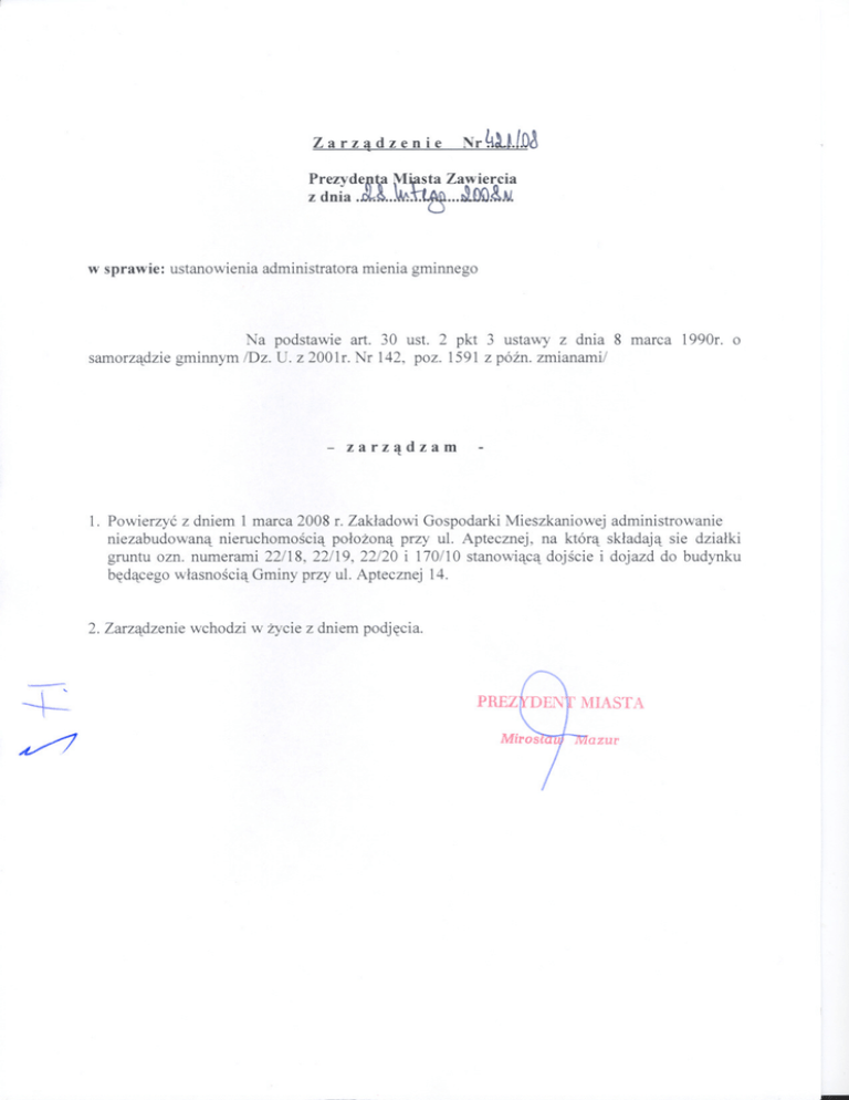 Zarz~dzenie ~~ PrezydeR-\a~~~a" Zawiercia z dnia .~~..lAl..\.~...J.ooA}J. w sprawie: ustanowienia administratora mienia gminnego Na podstawie art. 30 ust. 2 pkt 3 ustawy z dnia 8 marca 1990r. o samorzadzie gminnym /Dz. U. z 2001r. Nr 142, poz. 1591 z póznozmianami/ - zarzadzam l. Powierzyc z dniem l marca 2008 r. Zakladowi Gospodarki Mieszkaniowej administrowanie niezabudowana nieruchomoscia polozona przy ul. Aptecznej, na która skladaja sie dzialki gruntu ozn. numerami 22/18, 22/19, 22/20 i 170/10 stanowiaca dojscie i dojazd do budynku bedacego wlasnoscia Gminy przy ul. Aptecznej 14. 2. Zarzadzenie wchodzi w zycie z dniem podjecia. ~ ~ - ARKUSZ 14 / '. " '. \1, ---- ] . 169 1'7 155 om Stal 25 I " I r J ~ I I ~ U . O ~ I~ ~~_LJ/70~O .;; - - - - - _"I -., -I li JMJ 3 tJ c: tJ -<Il Q. .- - - -q: ~ 170 "6 R- rvb 169 18 175 176 48 1