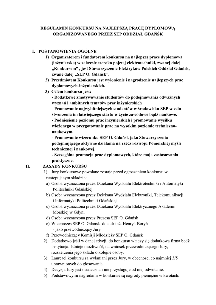 REGULAMIN KONKURSU NA NAJLEPSZĄ PRACĘ DYPLOMOWĄ ORGANIZOWANEGO PRZEZ SEP ODDZIAŁ GDAŃŚK I. POSTANOWIENIA OGÓLNE 1) Organizatorem i fundatorem konkursu na najlepszą pracę dyplomową (inżynierską) w zakresie szeroko pojętej elektrotechniki, zwanej dalej „Konkursem” , jest Stowarzyszenie Elektryków Polskich Oddział Gdańsk, zwane dalej „SEP O. Gdańsk”. 2) Przedmiotem Konkursu jest wyłonienie i nagrodzenie najlepszych prac dyplomowych-inżynierskich. 3) Celem konkursu jest: - Dodatkowe zmotywowanie studentów do podejmowania odważnych wyznań i ambitnych tematów prac inżynierskich - Promowanie najwybitniejszych studentów w środowisku SEP w celu stworzenia im łatwiejszego startu w życie zawodowe bądź naukowe. - Podniesienie poziomu prac inżynierskich i promowanie wysiłku włożonego w przygotowanie prac na wysokim poziomie technicznonaukowym. - Promowanie wizerunku SEP O. Gdańsk jako Stowarzyszenia podejmującego aktywne działania na rzecz rozwoju Pomorskiej myśli technicznej i naukowej. - Szczególna promocja prac dyplomowych, które mają zastosowania praktyczne. II. ZASADY KONKURSU 1) Jury konkursowe powołane zostaje przed ogłoszeniem konkursu w następującym składzie: a) Osoba wyznaczona przez Dziekana Wydziału Elektrotechniki i Automatyki Politechniki Gdańskiej b) Osoba wyznaczona przez Dziekana Wydziału Elektroniki, Telekomunikacji i Informatyki Politechniki Gdańskiej c) Osoba wyznaczona przez Dziekana Wydziału Elektrycznego Akademii Morskiej w Gdyni d) Osoba wyznaczona przez Prezesa SEP O. Gdańsk e) Wiceprezes SEP O. Gdańsk doc. dr inż. Henryk Boryń - jako przewodniczący Jury f) Przewodniczący Komisji Młodzieży SEP O. Gdańsk 2) Dodatkowo jeśli w danej edycji, do konkursu włączy się dodatkowa firma bądź instytucja. Istnieje możliwość, na wniosek przewodniczącego Jury, rozszerzenia jego składu o kolejne osoby. 3) Laureaci konkursu są wyłaniani przez Jury, w obecności co najmniej 3/5 uprawnionych do głosowania. 4) Decyzja Jury jest ostateczna i nie przysługuje od niej odwołanie. 5) Podstawowymi nagrodami w konkursie są nagrody pieniężne w kwotach: I - miejsce 5000 zł brutto, II – miejsce 3000 zł brutto, III – miejsce 2000 zł. 6) Oprócz nagród podstawowych jest możliwość przekazania dodatkowych nagród w postaci płatnych staży, bądź nagród rzeczowych przekazanych przez firmy-partnerów konkursu. 7) Zgodnie z art. 30 ust. 1 pkt 2 ustawy z dnia 26 lipca 1991 r. o podatku dochodowym od osób fizycznych (Dz. U. z 2012 r. Nr 361 z późn. zm.) Organizator konkursu odprowadzi do Urzędu Skarbowego należny zryczałtowany podatek dochodowy w wysokości 10% nagrody pieniężnej, który zostanie potrącony z wartości nagrody. 8) Nagrody wraz z dyplomami zostaną wręczone na corocznych Gdańskich Dniach Elektryki bądź na inauguracji roku akademickiego Wydziału, z którego pochodzi laureat danej edycji konkursu. Informacja o miejscu i czasie ogłoszenia wyników zostanie przekazana laureatom z miesięcznym wyprzedzeniem. III. WYMAGANIA 1. Uczestnikami konkursu mogą być studenci, którzy w danym roku akademickim, w którym organizowany jest konkurs są studentami semestru dyplomowego na następujących Wydziałach trójmiejskich uczelni wyższych: - Wydział Elektryczny Akademii Morskiej z Gdyni - Wydział Elektrotechniki i Automatyki Politechniki Gdańskiej - Wydział Elektroniki, Telekomunikacji i Informatyki Politechniki Gdańskiej 2. Zgłoszenia do udziału w konkursie dokonuje autor za zgodą promotora pracy nie później niż do 30-tego marca danego roku kalendarzowego. 3. Zgłaszane mogą być prace obronione w danym roku akademickim, którego dotyczy konkurs, przed datą 30-tego marca. 4. W konkursie brać udział mogą prace, które uzyskały ocenę co najmniej 4,5. Szczególnie promowane są prace, które mają zastosowanie praktyczne. 5. Do konkursu zgłaszane mogą być jedynie prace napisane i obronione w języku polskim. 6. Zgłoszeń należy dokonywać poprzez złożenie w Biurze SEP O. Gdańsk wypełnionego formularza zgłoszeniowego, który stanowi załącznik do tego regulaminu. Dodatkowo należy złożyć wersję elektroniczną pracy w formacie pdf. 7. W kwestiach nie rozstrzygniętych tym regulaminem decyduje Jury konkursowe zwykłą większością głosów. 8. Organizator konkursu zastrzega sobie prawo do wprowadzenia zmian w regulaminie. 9. Przekazane materiały i formularz nie zostają zwrócone po zakończeniu konkursu lecz są archiwizowane w celu dokumentacji przebiegu konkursu. 10. Prace oceniane są według ustalonego kryterium punktowania przyjętego i zatwierdzonego przez Jury przed ogłoszeniem konkursu. Kryterium to zawiera proporcjonalny podział wag punktowych w poszczególnych aspektach takich jak: innowacyjność, praktyczne zastosowanie, stopień zgłębienia problemu itp. 11. Prace nie spełniające wymogów formalnych oraz złożone po terminie nie będą rozpatrywane.