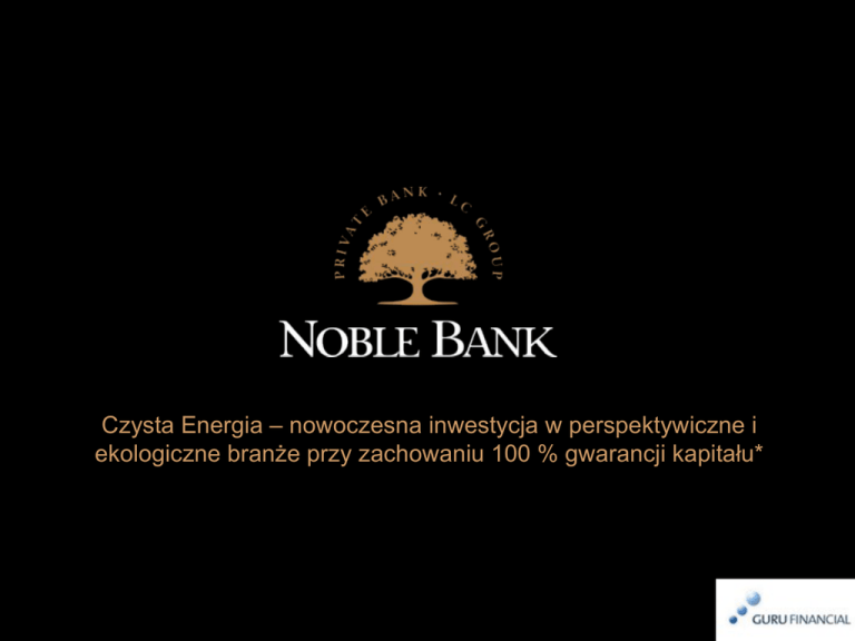 Czysta Energia – nowoczesna inwestycja w perspektywiczne i ekologiczne branże przy zachowaniu 100 % gwarancji kapitału* Charakterystyka produktu Jak wygląda sytuacja finansowa typowego Polaka? Produkt oparty o indeksy: S&P Global Clean Energy Index S&P Global Water Index Okres inwestycji: 4 lata Gwarancja kapitału:* 100% Historyczny zysk**: średni 69% brutto, maksymalny 100% brutto Potencjalny zysk: nieograniczony Partycypacja we wzroście: 81 % netto (odpowiada to partycypacji brutto 100%) Minimalna kwota: 10.000 zł Okres subskrypcji: 18.08.2008 - 30.09.2008 Ryzyko walutowe: brak Forma prawna: polisa, dzięki której produkt zwolniony jest z podatku Belki*** Uśrednianie wyniku: średnia z 4 rocznych obserwacji Do czasu zakupienia opcji: pieniądze wcześniej wpłacone oprocentowane są 7% p.a. Możliwość zaciągnięcia kredytu w MetroBanku na min. 80.000 zł na 71 - 88% wartości inwestycji pod zabezpieczenie cesji z tego produktu Jak wygląda sytuacja finansowa typowego Polaka? S&P Global Clean Energy Index Indeks skupiający 30 firm z całego świata działających w sektorze czystej energii. Prowadzony przez Standard&Poor`s - jedną z najbardziej znanych na świecie agencji ratingowych i instytucji tworzących indeksy. Najważniejsze informacje o indeksie: • Zmiany w indeksie zachodzą raz w roku w trzeci piątek listopada • W tym dniu żadna ze spółek nie może stanowić więcej niż 5% indeksu • Udział spółek ważony jest kapitalizacją • Ilość spółek 30 • Ilość krajów 9 Udział spółek z danego kraju w indeksie Kraj Liczba spółek Waga USA 10 31,34% Chiny 5 17,92% Hiszpania 3 13,01% Niemcy 4 12,91% Brazylia 3 9,48% Dania 1 5,55% Norwegia 1 4,68% Francja 2 4,03% Australia 1 1,08% Produkcja Energii Technologie i wyposażenie 10 spółek o największym udziale w indeksie Spółka Kraj Waga Sektor First Solar Inc USA 5,57% Technologie i wyposażenie Vestas Wind Systems A/S Dania 5,55% Technologie i wyposażenie Archer-Daniels-Midland USA 5,48% Produkcja Energii MEMC Electronic Materials USA 5,45% Technologie i wyposażenie Suntech Power Holdings Chiny 5,24% Technologie i wyposażenie Q-Cells AG Niemcy 5,00% Technologie i wyposażenie Sunpower Corp. USA 4,93% Technologie i wyposażenie Gamesa Corp Tecnologica SA Hiszpania 4,71% Technologie i wyposażenie Renewable Energy Corporation AS Norwegia 4,68% Technologie i wyposażenie Solarworld AG Niemcy 4,55% Technologie i wyposażenie Jak wygląda sytuacja finansowa typowego Polaka? S&P Global Water Index Indeks skupiający 50 firm z całego świata działających w sektorze związanym z wodą. Prowadzony przez Standard&Poor`s - jedną z najbardziej znanych na świecie agencji ratingowych i instytucji tworzących indeksy. Najważniejsze informacje o indeksie: • Zmiany w indeksie zachodzą raz w roku w trzeci piątek listopada • W tym dniu żadna ze spółek nie może stanowić więcej niż 10% indeksu • Udział spółek ważony jest kapitalizacją • Ilość spółek 50 • Ilość krajów 15 Udział spółek z danego kraju w indeksie Kraj Liczba spółek Waga USA 21 33,40% Francja 2 18,91% W.Brytania 5 13,94% Szwajcaria 2 8,19% Włochy 3 5,80% Japonia 3 5,19% Finlandia 2 4,69% Hiszpania 1 2,38% Brazylia 1 2,14% pozostałe 10 5,36% Wyposażenie i materiały Produkcja i infrastruktura 10 spółek o największym udziale w indeksie Spółka Kraj Waga Sektor Suez SA Francja 9,51% Produkcja i infrastruktura Veolia Environnement Francja 9,40% Produkcja i infrastruktura United Utilities Plc W.Brytania 5,42% Produkcja i infrastruktura Danaher Corp. USA 5,08% Wyposażenie i materiały Geberit AG Szwajcaria 5,07% Wyposażenie i materiały ITT Corporation USA 4,75% Wyposażenie i materiały Kurita Water Industries Ltd Japonia 4,18% Wyposażenie i materiały Nalco Holdings Inc USA 4,08% Wyposażenie i materiały Itron Inc USA 3,51% Wyposażenie i materiały Pentair Inc USA 3,13% Wyposażenie i materiały Jak wygląda sytuacja finansowa typowego Polaka? Wyniki historyczne indeksów od początku ich istnienia Szczególną uwagę zwraca bardzo wysoka powtarzalność wysokich stóp zwrotu. Dodatkowo indeks Global Water charakteryzuje się wysoką odpornością na dekoniunkturę. Historyczne wyniki indeksów od początku ich istnienia S&P Global Clean Energy Index S&P Global Water Index 2008-03-16 2007-11-16 2007-07-16 2007-03-16 2006-11-16 2006-07-16 2006-03-16 2005-11-16 2005-07-16 2005-03-16 2004-11-16 2004-07-16 2004-03-16 2003-11-16 2003-07-16 2003-03-16 2002-11-16 2002-07-16 2002-03-16 2001-11-16 4500 4000 3500 3000 2500 2000 1500 1000 500 0 Fakty o energii odnawialnej (1) Jak wygląda sytuacja finansowa typowego Polaka? • W ciągu najbliższych siedmiu lat UE zwiększy o 50% wydatki na badania związane z alternatywnymi źródłami energii • Do 2020 roku udział energii pozyskiwanej z odnawialnych źródeł ma w UE wynieść 20% (obecnie 6,4%) a emisja CO2 ma zostać ograniczona o 20% w stosunku do stanu wyjściowego z 1990r. • Wartość rynku wytworzonej energii odnawialnej w UE wyniosła w 2007r. 30 mld EUR • Energia wiatrowa dostarcza obecnie 3,7% elektryczności w UE i ma sięgnąć 12-14% w 2020r., co oznacza konieczność inwestycji w 9,5 GW rocznie przez 13 kolejnych lat (plus 6,8 GW poza granicami UE). W 2007r. moce te wzrosły o 8,5 GW • W 2020r. roku energia elektryczna z wiatru ma zaspokajać energetyczne potrzeby 107 mln gospodarstw domowych w UE (49% obecnie istniejących). Spełnienie tych celów oznacza wydatki na poziomie 17 mld EUR średniorocznie. W latach 2011-2020 mają one wynieść łącznie 120 mld EUR • Inwestycje w energię wiatrową sięgną do 2020r. 34% wydatków na nowe moce ogółem Fakty o energii odnawialnej (2) Jak wygląda sytuacja finansowa typowego Polaka? • Wzrost powierzchni baterii słonecznych w UE sięga powyżej 40% rocznie (w 2006r. było to 3 mln m2 zainstalowanych baterii, wobec 1 mln w 1999r.) • Łączna powierzchnia baterii solarnych ma wzrosnąć