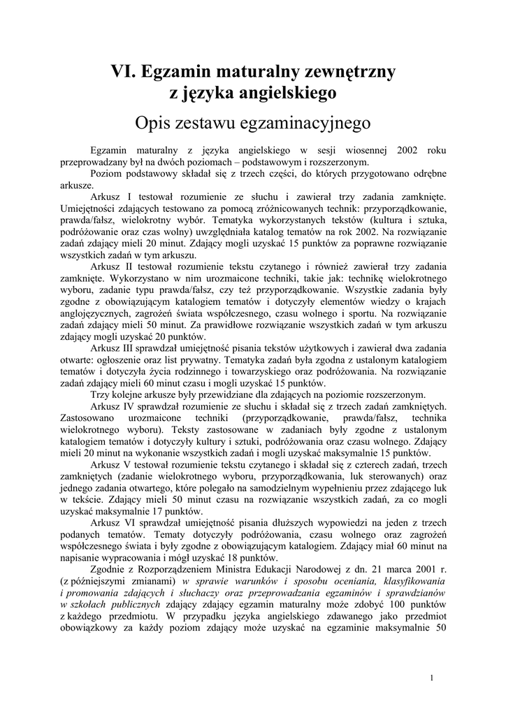 VI. Egzamin maturalny zewnętrzny z języka angielskiego Opis zestawu egzaminacyjnego Egzamin maturalny z języka angielskiego w sesji wiosennej 2002 roku przeprowadzany był na dwóch poziomach – podstawowym i rozszerzonym. Poziom podstawowy składał się z trzech części, do których przygotowano odrębne arkusze. Arkusz I testował rozumienie ze słuchu i zawierał trzy zadania zamknięte. Umiejętności zdających testowano za pomocą zróżnicowanych technik: przyporządkowanie, prawda/fałsz, wielokrotny wybór. Tematyka wykorzystanych tekstów (kultura i sztuka, podróżowanie oraz czas wolny) uwzględniała katalog tematów na rok 2002. Na rozwiązanie zadań zdający mieli 20 minut. Zdający mogli uzyskać 15 punktów za poprawne rozwiązanie wszystkich zadań w tym arkuszu. Arkusz II testował rozumienie tekstu czytanego i również zawierał trzy zadania zamknięte. Wykorzystano w nim urozmaicone techniki, takie jak: technikę wielokrotnego wyboru, zadanie typu prawda/fałsz, czy też przyporządkowanie. Wszystkie zadania były zgodne z obowiązującym katalogiem tematów i dotyczyły elementów wiedzy o krajach anglojęzycznych, zagrożeń świata współczesnego, czasu wolnego i sportu. Na rozwiązanie zadań zdający mieli 50 minut. Za prawidłowe rozwiązanie wszystkich zadań w tym arkuszu zdający mogli uzyskać 20 punktów. Arkusz III sprawdzał umiejętność pisania tekstów użytkowych i zawierał dwa zadania otwarte: ogłoszenie oraz list prywatny. Tematyka zadań była zgodna z ustalonym katalogiem tematów i dotyczyła życia rodzinnego i towarzyskiego oraz podróżowania. Na rozwiązanie zadań zdający mieli 60 minut czasu i mogli uzyskać 15 punktów. Trzy kolejne arkusze były przewidziane dla zdających na poziomie rozszerzonym. Arkusz IV sprawdzał rozumienie ze słuchu i składał się z trzech zadań zamkniętych. Zastosowano urozmaicone techniki (przyporządkowanie, prawda/fałsz, technika wielokrotnego wyboru). Teksty zastosowane w zadaniach były zgodne z ustalonym katalogiem tematów i dotyczyły kultury i sztuki, podróżowania oraz czasu wolnego. Zdający mieli 20 minut na wykonanie wszystkich zadań i mogli uzyskać maksymalnie 15 punktów. Arkusz V testował rozumienie tekstu czytanego i składał się z czterech zadań, trzech zamkniętych (zadanie wielokrotnego wyboru, przyporządkowania, luk sterowanych) oraz jednego zadania otwartego, które polegało na samodzielnym wypełnieniu przez zdającego luk w tekście. Zdający mieli 50 minut czasu na rozwiązanie wszystkich zadań, za co mogli uzyskać maksymalnie 17 punktów. Arkusz VI sprawdzał umiejętność pisania dłuższych wypowiedzi na jeden z trzech podanych tematów. Tematy dotyczyły podróżowania, czasu wolnego oraz zagrożeń współczesnego świata i były zgodne z obowiązującym katalogiem. Zdający miał 60 minut na napisanie wypracowania i mógł uzyskać 18 punktów. Zgodnie z Rozporządzeniem Ministra Edukacji Narodowej z dn. 21 marca 2001 r. (z późniejszymi zmianami) w sprawie warunków i sposobu oceniania, klasyfikowania i promowania zdających i słuchaczy oraz przeprowadzania egzaminów i sprawdzianów w szkołach publicznych zdający zdający egzamin maturalny może zdobyć 100 punktów z każdego przedmiotu. W przypadku języka angielskiego zdawanego jako przedmiot obowiązkowy za każdy poziom zdający może uzyskać na egzaminie maksymalnie 50 1 punktów. Aby spełnić wymagania Ministerstwa należy więc przemnożyć punkty przyznane na egzaminie przez dwa. W przypadku egzaminu z języka angielskiego zdawanego jako przedmiot wybrany suma punktów uzyskanych na egzaminie z obu poziomów wynosi 100, tak więc nie ma potrzeby przeliczania ich. Siatka arkuszy egzaminacyjnych Poziom podstawowy Arkusz I - Rozumienie ze słuchu Tabela nr 1. Charakterystyka zadań Sprawdzane umiejętności szczegółowe (wg oznaczeń w syllabusie) Liczba punktów zamknięte przyporządkowanie 3, 5 5 Nr zad. Temat z katalogu Rodzaj tekstu 1. kultura i sztuka zapowiedzi / informacje o programach podróżowanie instrukcje zamknięte prawda / fałsz 5, 6 4 czas wolny wywiad zamknięte wielokrotny wybór 1, 5 ,6 6 2. 3. Rodzaj zadania Technika Arkusz II - Rozumienie tekstu czytanego Tabela nr 2. Charakterystyka zadań Nr zad. 4. 5. 6. Temat z katalogu Rodzaj tekstu Rodzaj zadania Technika elementy tekst wiedzy publicystyczny/ prawda / fałsz o krajach opowiadanie zamknięte wielokrotny wybór języka docelowego zagrożenia zamknięte wywiad / współczesnego przyporządkowanie komentarz świata tekst zamknięte czas wolny, publicystyczny/ przyporządkowanie sport wywiad Sprawdzane umiejętności szczegółowe (wg oznaczeń w syllabusie) Liczba punktów 1, 5, 12 8 3, 5, 6 6 3, 5, 6 2 Arkusz III - Wypowiedź pisemna Tabela nr 3. Charakterystyka zadań Nr zad. Temat z katalogu Rodzaj tekstu Rodzaj zadania 7. życie rodzinne i towarzyskie ogłoszenie otwarte 8. podróżowanie list prywatny otwarte Technika pisanie sterowane – krótki tekst użytkowy pisanie sterowane – dłuższy tekst użytkowy Sprawdzane umiejętności szczegółowe (wg oznaczeń w syllabusie) Liczba punktów 1, 3, 5, 9, 12 5 1, 4, 5, 6, 9, 11, 12 10 Poziom rozszerzony Arkusz IV - Rozumienie ze słuchu Tabela nr 4. Charakterystyka zadań Nr zad. Temat z katalogu 9. życie rodzinne i towarzyskie 10. kultura i sztuka 11. zagrożenia współczesnego świata Rodzaj tekstu fragment literatury, dialog reportaż radiowy, dyskusja, wywiad Rodzaj zadania Technika zamknięte prawda / fałsz Sprawdzane umiejętności Liczba szczegółowe(wg punktów oznaczeń w syllabusie) zamknięte wielokrotny wybór zamknięte selektywne przyporządkowanie 5, 7 5 5, 7, 8, 10 5 5, 7 5 Arkusz V - Rozumienie tekstu czytanego Tabela nr 5. Charakterystyka zadań Nr zad. 12. 13. 14. 15. Temat z katalogu Rodzaj tekstu Rodzaj zadania Technika Sprawdzane umiejętności szczegółowe(wg oznaczeń w syllabusie) dom tekst literacki zamknięte wielokrotny wybór