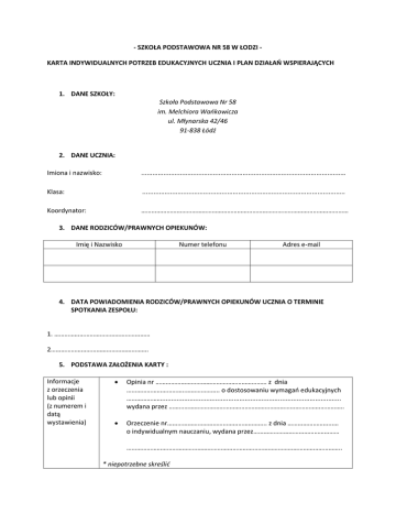 - SZKOŁA PODSTAWOWA NR 58 W ŁODZI KARTA INDYWIDUALNYCH POTRZEB EDUKACYJNYCH UCZNIA I PLAN DZIAŁAO WSPIERAJĄCYCH 1. DANE SZKOŁY: Szkoła Podstawowa Nr 58 im. Melchiora Waokowicza ul. Młynarska 42/46 91-838 Łódź 2. DANE UCZNIA: Imiona i nazwisko: ............................................................................................................... Klasa: .............................................................................................................. Koordynator: …………………………………………………………………………………………………………… 3. DANE RODZICÓW/PRAWNYCH OPIEKUNÓW: Imię i Nazwisko Numer telefonu Adres e-mail 4. DATA POWIADOMIENIA RODZICÓW/PRAWNYCH OPIEKUNÓW UCZNIA O TERMINIE SPOTKANIA ZESPOŁU: 1. ………………………………………………… 2…………………………………………………. 5. PODSTAWA ZAŁOŻENIA KARTY : Informacje z orzeczenia lub opinii (z numerem i datą wystawienia) Opinia nr ………………………………………………………… z dnia ……………………………..……………….. o dostosowaniu wymagao edukacyjnych …………………................................................................................................. wydana przez ………………………………………………………………………………………….. Orzeczenie nr………………………………………………….. z dnia ……………………...… o indywidualnym nauczaniu, wydana przez…………………………………………… ……………………………………………………………………………………………………………….. * niepotrzebne skreślid Stwierdzona potrzeba objęcia ucznia pomocą psychologicznopedagogiczną Podstawą założenia karty jest potrzeba objęcia ucznia/uczennicy pomocą psychologiczno-pedagogiczną wynikającą z diagnozy szkolnej. 6. KATEGORIA SPECJALNYCH POTRZEB: (zaznaczyć właściwe ) Dysgrafia Dysortografia Dyskalkulia Dysleksja Zagrożenie dysleksją Zaniedbania środowiskowe Zagrożenie niedostosowaniem społecznym Szczególne uzdolnienia Niepowodzenia edukacyjne Sytuacja kryzysowa lub traumatyczna Choroba przewlekła Zaburzenia komunikacji językowej Trudności adaptacyjne Niedostosowanie społeczne Inne …………………………………… 7. ROZPOZNANIE PEDAGOGICZNE: 8. ZAKRES POMOCY PSYCHOLOGICZNO-PEDAGOGICZNEJ: 9. ZALECENIA ZESPOŁU: Formy pomocy psychologiczno-pedagogicznej Sposoby/działania realizowane z uczniem Wymiar godzin Okres udzielania pomocy psychologicznopedagogicznej Osoba odpowiedzialna Zajęcia rozwijające uzdolnienia Zajęcia dydaktycznowyrównawcze Zajęcia korekcyjnokompensacyjne Zajęcia logopedyczne Gimnastyka korekcyjna Zajęcia socjoterapeutyczne Porady i konsultacje 10. USTALENIA DYREKTORA SZKOŁY: Formy pomocy psychologiczno-pedagogicznej Zajęcia rozwijające uzdolnienia Zajęcia dydaktycznowyrównawcze Zajęcia korekcyjnokompensacyjne Zajęcia logopedyczne Gimnastyka korekcyjna Zajęcia socjoterapeutyczne Porady i konsultacje Sposoby/działania realizowane z uczniem Wymiar godzin Okres udzielania pomocy psychologicznopedagogicznej Osoba odpowiedzialna Data i podpis dyrektora szkoły Zapoznałam / em się z decyzją dyrektora szkoły odnośnie sposobu, okresu i wymiaru godzin udzielanej mojemu dziecku pomocy psychologiczno-pedagogicznej w roku szkolnym ……………………………………………………………………….. i wyrażam zgodę na udział mojego dziecka w/ w zajęciach: .............................................................................................................. Data i podpis rodziców/ prawnych opiekunów 11. OCENA EFEKTYWNOŚCI POMOCY UDZIELANEJ UCZNIOWI: Data oceny Ocena podjętych działao I semestr Data oceny Ocena podjętych działao II semestr 12. PODPISY CZŁONKÓW ZESPOŁU I OSÓB UCZESTNICZĄCYCH W SPOTKANIU: Data spotkania ……………………………………………… Podpisy rodziców/prawnych opiekunów ucznia: 1. …………………………………………………………………….. 2. …………………………………………………………………….. Imię i nazwisko Instytucja lub organizacja Stanowisko Podpis PLAN DZIAŁAO WSPIERAJĄCYCH: Cele do osiągnięcia w zakresie pomocy psychologicznopedagogicznej Działania realizowane z uczniem (harmonogram, plan pracy) Metody pracy z uczniem Zakres dostosowania wymagao edukacyjnych do potrzeb rozwojowych i edukacyjnych oraz możliwości psychofizycznych ucznia Działania wspierające rodziców ucznia Zakres współdziałania z instytucjami