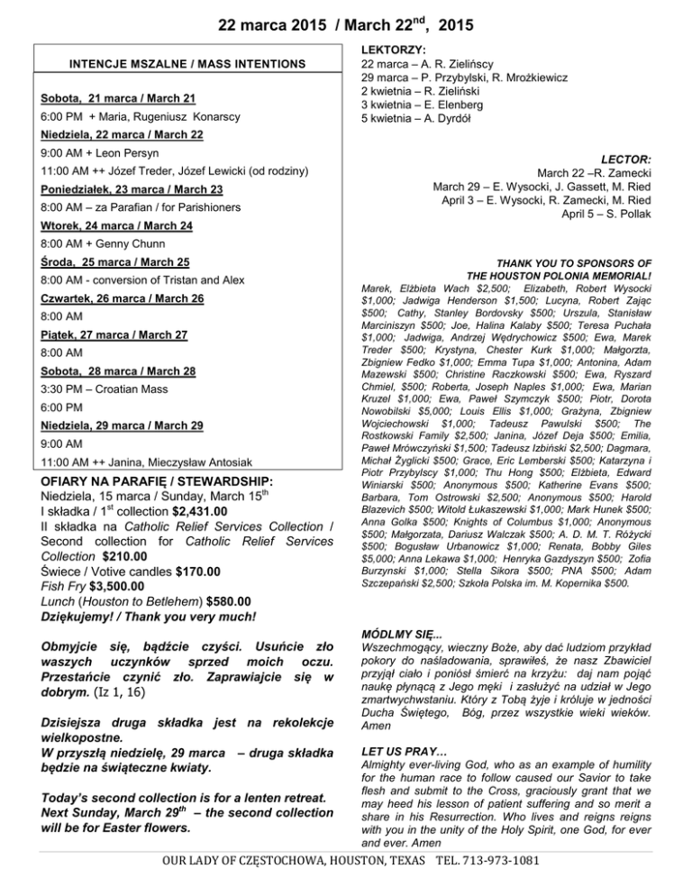 22 marca 2015 / March 22nd, 2015 INTENCJE MSZALNE / MASS INTENTIONS Sobota, 21 marca / March 21 6:00 PM + Maria, Rugeniusz Konarscy LEKTORZY: 22 marca – A. R. Zielińscy 29 marca – P. Przybylski, R. Mrożkiewicz 2 kwietnia – R. Zieliński 3 kwietnia – E. Elenberg 5 kwietnia – A. Dyrdół Niedziela, 22 marca / March 22 9:00 AM + Leon Persyn 11:00 AM ++ Józef Treder, Józef Lewicki (od rodziny) Poniedziałek, 23 marca / March 23 8:00 AM – za Parafian / for Parishioners LECTOR: March 22 –R. Zamecki March 29 – E. Wysocki, J. Gassett, M. Ried April 3 – E. Wysocki, R. Zamecki, M. Ried April 5 – S. Pollak Wtorek, 24 marca / March 24 8:00 AM + Genny Chunn Środa, 25 marca / March 25 8:00 AM - conversion of Tristan and Alex Czwartek, 26 marca / March 26 8:00 AM Piątek, 27 marca / March 27 8:00 AM Sobota, 28 marca / March 28 3:30 PM – Croatian Mass 6:00 PM Niedziela, 29 marca / March 29 9:00 AM 11:00 AM ++ Janina, Mieczysław Antosiak OFIARY NA PARAFIĘ / STEWARDSHIP: Niedziela, 15 marca / Sunday, March 15th I składka / 1st collection $2,431.00 II składka na Catholic Relief Services Collection / Second collection for Catholic Relief Services Collection $210.00 Świece / Votive candles $170.00 Fish Fry $3,500.00 Lunch (Houston to Betlehem) $580.00 Dziękujemy! / Thank you very much! Obmyjcie się, bądźcie czyści. Usuńcie zło waszych uczynków sprzed moich oczu. Przestańcie czynić zło. Zaprawiajcie się w dobrym. (Iz 1, 16) Dzisiejsza druga składka jest na rekolekcje wielkopostne. W przyszłą niedzielę, 29 marca – druga składka będzie na świąteczne kwiaty. Today’s second collection is for a lenten retreat. Next Sunday, March 29th – the second collection will be for Easter flowers. THANK YOU TO SPONSORS OF THE HOUSTON POLONIA MEMORIAL! Marek, Elżbieta Wach $2,500; Elizabeth, Robert Wysocki $1,000; Jadwiga Henderson $1,500; Lucyna, Robert Zając $500; Cathy, Stanley Bordovsky $500; Urszula, Stanisław Marciniszyn $500; Joe, Halina Kalaby $500; Teresa Puchała $1,000; Jadwiga, Andrzej Wędrychowicz $500; Ewa, Marek Treder $500; Krystyna, Chester Kurk $1,000; Małgorzta, Zbigniew Fedko $1,000; Emma Tupa $1,000; Antonina, Adam Mazewski $500; Christine Raczkowski $500; Ewa, Ryszard Chmiel, $500; Roberta, Joseph Naples $1,000; Ewa, Marian Kruzel $1,000; Ewa, Paweł Szymczyk $500; Piotr, Dorota Nowobilski $5,000; Louis Ellis $1,000; Grażyna, Zbigniew Wojciechowski $1,000; Tadeusz Pawulski $500; The Rostkowski Family $2,500; Janina, Józef Deja $500; Emilia, Paweł Mrówczyński $1,500; Tadeusz Izbiński $2,500; Dagmara, Michał Żyglicki $500; Grace, Eric Lemberski $500; Katarzyna i Piotr Przybylscy $1,000; Thu Hong $500; Elżbieta, Edward Winiarski $500; Anonymous $500; Katherine Evans $500; Barbara, Tom Ostrowski $2,500; Anonymous $500; Harold Blazevich $500; Witold Łukaszewski $1,000; Mark Hunek $500; Anna Golka $500; Knights of Columbus $1,000; Anonymous $500; Małgorzata, Dariusz Walczak $500; A. D. M. T. Różycki $500; Bogusław Urbanowicz $1,000; Renata, Bobby Giles $5,000; Anna Lekawa $1,000; Henryka Gazdyszyn $500; Zofia Burzynski $1,000; Stella Sikora $500; PNA $500; Adam Szczepański $2,500; Szkoła Polska im. M. Kopernika $500. MÓDLMY SIĘ... Wszechmogący, wieczny Boże, aby dać ludziom przykład pokory do naśladowania, sprawiłeś, że nasz Zbawiciel przyjął ciało i poniósł śmierć na krzyżu: daj nam pojąć naukę płynącą z Jego męki i zasłużyć na udział w Jego zmartwychwstaniu. Który z Tobą żyje i króluje w jedności Ducha Świętego, Bóg, przez wszystkie wieki wieków. Amen LET US PRAY… Almighty ever-living God, who as an example of humility for the human race to follow caused our Savior to take flesh and submit to the Cross, graciously grant that we may heed his lesson of patient suffering and so merit a share in his Resurrection. Who lives and reigns reigns with you in the unity of the Holy Spirit, one God, for ever and ever. Amen OUR LADY OF CZĘSTOCHOWA, HOUSTON, TEXAS TEL. 713-973-1081 22 marca 2015 / March 22nd, 2015 PAPIEŻ FRANCISZEK NA WIELKI POST Miłość Boża, która przełamuje to śmiertelne zamknięcie w sobie, jakim jest obojętność, jest nam ukazywana przez Kościół poprzez jego nauczanie, a przede wszystkim poprzez jego świadectwo. Można jednak dawać świadectwo jedynie o czymś, czego wcześniej doświadczyliśmy. Chrześcijanin to człowiek, który pozwala Bogu, aby go przyoblókł w swoją dobroć i swoje miłosierdzie, aby go przyoblókł w Chrystusa, żeby stał się tak jak On sługą Boga i ludzi. Papież Franciszek NA SKAŁĘ MNIE WPROWADŹ ZBYT DLA MNIE WYSOKĄ… (por. Ps 61, 3) Tymi słowami z obrazka prymicyjnego ks. Zbigniewa Reguckiego, witamy go wśród nas i żegnamy! Dziękujemy za przeprowadzone rekolekcje wielkopostne oraz za wszystkie chwile spędzone razem. Życzymy Księdzu największego powodzenia w prowadzeniu parafii św. Jadwigi Królowej w Poznaniu. Będziemy także wdzięczni za przekazanie naszych pozdrowień ks. Kamilowi Żyłczyńskiemu. PROGRAM NA TRIDUUM PASCHALNE I OKTAWĘ WIELKANOCY Bardzo proszę o zabranie ze sobą do domu programu na Triduum Pachalne i oktawę Wielkanocy. Ten program jest także dostępny na stronie internetowej parafii. W tym roku podtrzymujemy zwyczaj odprawienia rezurekcji w Wielką Sobotę, o godz. 9:00 PM. FISH FRY Tradycyjnie w czasie Wielkiego Postu w naszej sali parafialnej można spożyć postny posiłek. Piątkowa ryba (Fish Fry) jest serwowana w godz. 5:30-8:00 PM. Zapraszamy! HOUSTON DLA BETLEJEM Dziękujemy wszystkim dobrodziejom kampanii Houston dla Betlejem. Zebraliśmy $3,320.00. Wkrótce jedna z parafianek przekaże te pieniądze bezpośrednio do Betlejem. MESSAGE OF POPE FRANCIS FOR LENT The love of God breaks through that fatal withdrawal into ourselves which is indifference. The Church offers us this love of God by her teaching and especially by her witness. But we can only bear witness to what we ourselves have expe