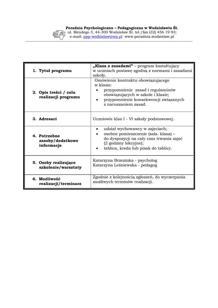 Poradnia Psychologiczno – Pedagogiczna w Wodzisławiu Śl. ul. Mendego 3, 44-300 Wodzisław Śl. tel./fax (32) 456 19 93; e-mail: [email protected] www.poradnia.wodzislaw.pl 1. Tytuł programu 2. Opis treści / celu realizacji programu 3. Adresaci 4. Potrzebne zasoby/dodatkowe informacje 5. Osoby realizujące szkolenie/warsztaty 6. Możliwość realizacji/terminarz „Klasa z zasadami” – program kształtujący w uczniach postawę zgodną z normami i zasadami szkoły. Omówienie kontraktu obowiązującego w klasie: przypomnienie zasad i regulaminów obowiązujących w szkole i klasie; przypomnienie konsekwencji związanych z naruszaniem zasad. Uczniowie klas I - VI szkoły podstawowej. udział wychowawcy w zajęciach; osobne pomieszczenie (sala. klasa) – do dyspozycji na cały czas trwania zajęć (2 godziny lekcyjne); tablica, kreda lub pisak do tablicy. Katarzyna Brzezinka - psycholog Katarzyna Leśniewska - pedagog Zgodnie z kolejnością zgłoszeń, do wyczerpania możliwych terminów realizacji.