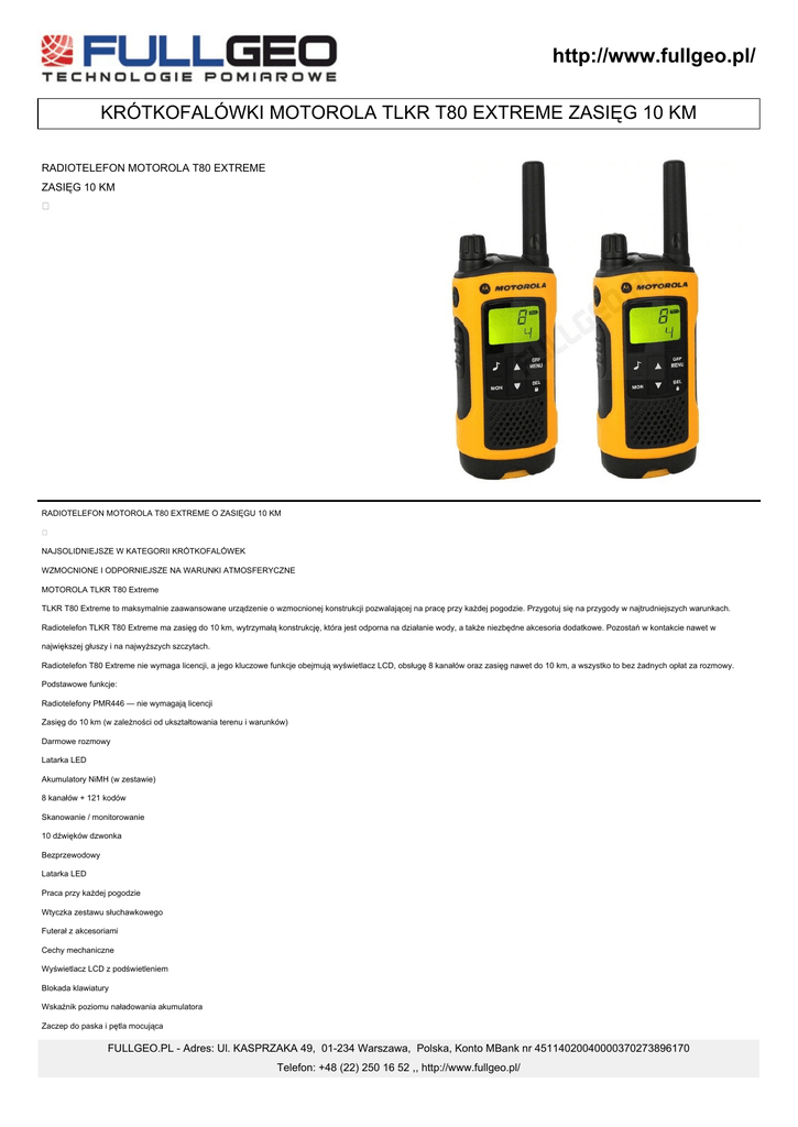 http://www.fullgeo.pl/ KRÓTKOFALÓWKI MOTOROLA TLKR T80 EXTREME ZASIĘG 10 KM RADIOTELEFON MOTOROLA T80 EXTREME ZASIĘG 10 KM RADIOTELEFON MOTOROLA T80 EXTREME O ZASIĘGU 10 KM NAJSOLIDNIEJSZE W KATEGORII KRÓTKOFALÓWEK WZMOCNIONE I ODPORNIEJSZE NA WARUNKI ATMOSFERYCZNE MOTOROLA TLKR T80 Extreme TLKR T80 Extreme to maksymalnie zaawansowane urządzenie o wzmocnionej konstrukcji pozwalającej na pracę przy każdej pogodzie. Przygotuj się na przygody w najtrudniejszych warunkach. Radiotelefon TLKR T80 Extreme ma zasięg do 10 km, wytrzymałą konstrukcję, która jest odporna na działanie wody, a także niezbędne akcesoria dodatkowe. Pozostań w kontakcie nawet w największej głuszy i na najwyższych szczytach. Radiotelefon T80 Extreme nie wymaga licencji, a jego kluczowe funkcje obejmują wyświetlacz LCD, obsługę 8 kanałów oraz zasięg nawet do 10 km, a wszystko to bez żadnych opłat za rozmowy. Podstawowe funkcje: Radiotelefony PMR446 — nie wymagają licencji Zasięg do 10 km (w zależności od ukształtowania terenu i warunków) Darmowe rozmowy Latarka LED Akumulatory NiMH (w zestawie) 8 kanałów + 121 kodów Skanowanie / monitorowanie 10 dźwięków dzwonka Bezprzewodowy Latarka LED Praca przy każdej pogodzie Wtyczka zestawu słuchawkowego Futerał z akcesoriami Cechy mechaniczne Wyświetlacz LCD z podświetleniem Blokada klawiatury Wskaźnik poziomu naładowania akumulatora Zaczep do paska i pętla mocująca FULLGEO.PL - Adres: Ul. KASPRZAKA 49, 01-234 Warszawa, Polska, Konto MBank nr 45114020040000370273896170 Telefon: +48 (22) 250 16 52 ,, http://www.fullgeo.pl/ Moc 500 mW http://www.fullgeo.pl/ Odporna na wilgoć obudowa IPX4 Powiadomienia 10 dźwięków dzwonka Alarm wibracyjny Dźwięki klawiatury Potwierdzenie rozmowy / Bip Zestaw zawiera: Radiotelefon MOTOROLA TLKR T80 Extreme (2 szt.) Klips montażowy do paska (2 szt.) Pakiet akumulatorów niklowo-wodorkowych NiMH (2 szt.) Zasilacz (1 szt.) Ładowarka stacjonarna (1 szt.) Mikrofonogłośnik kamuflowany (2 szt.) Pasek na rękę Motorola (2 szt.) Walizka transportowa Motorola (1 szt.) Podręcznik użytkownika TLKR T80 Extreme Gwarancja 12 miesięcy FV lub paragon FULLGEO.PL - Adres: Ul. KASPRZAKA 49, 01-234 Warszawa, Polska, Konto MBank nr 45114020040000370273896170 Telefon: +48 (22) 250 16 52 ,, http://www.fullgeo.pl/ http://www.fullgeo.pl/ FULLGEO.PL - Adres: Ul. KASPRZAKA 49, 01-234 Warszawa, Polska, Konto MBank nr 45114020040000370273896170 Telefon: +48 (22) 250 16 52 ,, http://www.fullgeo.pl/