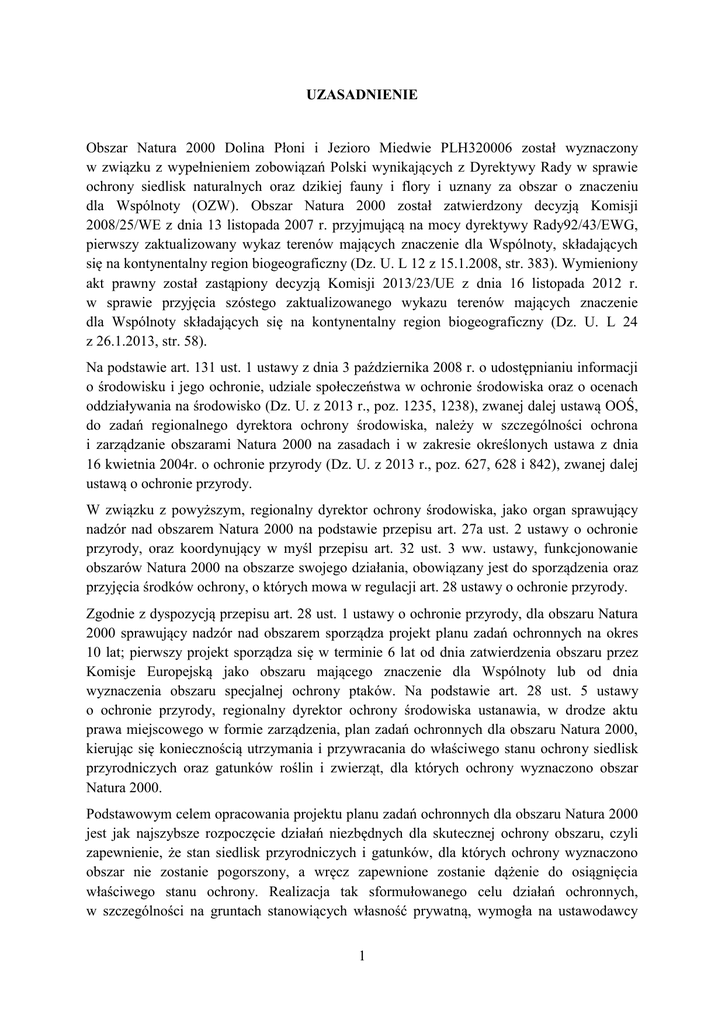 UZASADNIENIE Obszar Natura 2000 Dolina Płoni i Jezioro Miedwie PLH320006 został wyznaczony w związku z wypełnieniem zobowiązań Polski wynikających z Dyrektywy Rady w sprawie ochrony siedlisk naturalnych oraz dzikiej fauny i flory i uznany za obszar o znaczeniu dla Wspólnoty (OZW). Obszar Natura 2000 został zatwierdzony decyzją Komisji 2008/25/WE z dnia 13 listopada 2007 r. przyjmującą na mocy dyrektywy Rady92/43/EWG, pierwszy zaktualizowany wykaz terenów mających znaczenie dla Wspólnoty, składających się na kontynentalny region biogeograficzny (Dz. U. L 12 z 15.1.2008, str. 383). Wymieniony akt prawny został zastąpiony decyzją Komisji 2013/23/UE z dnia 16 listopada 2012 r. w sprawie przyjęcia szóstego zaktualizowanego wykazu terenów mających znaczenie dla Wspólnoty składających się na kontynentalny region biogeograficzny (Dz. U. L 24 z 26.1.2013, str. 58). Na podstawie art. 131 ust. 1 ustawy z dnia 3 października 2008 r. o udostępnianiu informacji o środowisku i jego ochronie, udziale społeczeństwa w ochronie środowiska oraz o ocenach oddziaływania na środowisko (Dz. U. z 2013 r., poz. 1235, 1238), zwanej dalej ustawą OOŚ, do zadań regionalnego dyrektora ochrony środowiska, należy w szczególności ochrona i zarządzanie obszarami Natura 2000 na zasadach i w zakresie określonych ustawa z dnia 16 kwietnia 2004r. o ochronie przyrody (Dz. U. z 2013 r., poz. 627, 628 i 842), zwanej dalej ustawą o ochronie przyrody. W związku z powyższym, regionalny dyrektor ochrony środowiska, jako organ sprawujący nadzór nad obszarem Natura 2000 na podstawie przepisu art. 27a ust. 2 ustawy o ochronie przyrody, oraz koordynujący w myśl przepisu art. 32 ust. 3 ww. ustawy, funkcjonowanie obszarów Natura 2000 na obszarze swojego działania, obowiązany jest do sporządzenia oraz przyjęcia środków ochrony, o których mowa w regulacji art. 28 ustawy o ochronie przyrody. Zgodnie z dyspozycją przepisu art. 28 ust. 1 ustawy o ochronie przyrody, dla obszaru Natura 2000 sprawujący nadzór nad obszarem sporządza projekt planu zadań ochronnych na okres 10 lat; pierwszy projekt sporządza się w terminie 6 lat od dnia zatwierdzenia obszaru przez Komisje Europejską jako obszaru mającego znaczenie dla Wspólnoty lub od dnia wyznaczenia obszaru specjalnej ochrony ptaków. Na podstawie art. 28 ust. 5 ustawy o ochronie przyrody, regionalny dyrektor ochrony środowiska ustanawia, w drodze aktu prawa miejscowego w formie zarządzenia, plan zadań ochronnych dla obszaru Natura 2000, kierując się koniecznością utrzymania i przywracania do właściwego stanu ochrony siedlisk przyrodniczych oraz gatunków roślin i zwierząt, dla których ochrony wyznaczono obszar Natura 2000. Podstawowym celem opracowania projektu planu zadań ochronnych dla obszaru Natura 2000 jest jak najszybsze rozpoczęcie działań niezbędnych dla skutecznej ochrony obszaru, czyli zapewnienie, że stan siedlisk przyrodniczych i gatunków, dla których ochrony wyznaczono obszar nie zostanie pogorszony, a wręcz zapewnione zostanie dążenie do osiągnięcia właściwego stanu ochrony. Realizacja tak sformułowanego celu działań ochronnych, w szczególności na gruntach stanowiących własność prywatną, wymogła na ustawodawcy 1 decyzje o nadaniu planu zadań ochronnych normy prawnej ustanawianej, w formie zarządzenia jako akt prawa miejscowego. Szczegółowy tryb sporządzania projektu planu zadań ochronnych oraz zakres prac koniecznych do wykonania na potrzeby przygotowania projektu planu, określa rozporządzenia Ministra Środowiska z dnia 17 lutego 2010 r. w sprawie sporządzania projektu planu zadań ochronnych dla obszaru Natura 2000 (Dz. U. Nr 34, poz. 184 z 2010 r. ze zm.), a także rozporządzenie Ministra Środowiska z dnia 17 kwietnia 2012 r. zmieniające rozporządzenie w sprawie sporządzenia projektu planu zadań ochronnych dla obszaru Natura 2000 (Dz. U. z 2012 r. poz. 506). Zgodnie z art. 28 ust. 10 ustawy o ochronie przyrody, projekt planu zadań ochronnych dla obszaru Natura 2000 zawiera: 1) opis granic obszaru i mapę obszaru Natura 2000; 2) identyfikację istniejących i potencjalnych zagrożeń dla zachowania właściwego stanu ochrony siedlisk przyrodniczych oraz gatunków roślin i zwierząt i ich siedlisk będących przedmiotami ochrony; 3) cele działań ochronnych; 4) określenie działań ochronnych ze wskazaniem podmiotów odpowiedzialnych za ich wykonanie i obszarów ich wdrażania, w tym w szczególności działań dotyczących: ochrony czynnej siedlisk przyrodniczych, gatunków roślin i zwierząt oraz ich siedlisk, b) monitoringu stanu przedmiotów ochrony oraz monitoringu realizacji celów, o których mowa w pkt 3, c) uzupełnienia stanu wiedzy o przedmiotach ochrony i uwarunkowaniach ich ochrony; a) 5) wskazania do zmian w istniejących studiach uwarunkowań i kierunków zagospodarowania przestrzennego, miejscowych planach zagospodarowania przestrzennego, planach zagospodarowania przestrzennego województw oraz planach zagospodarowania przestrzennego morskich wód wewnętrznych, morza terytorialnego i wyłącznej strefy ekonomicznej dotyczące eliminacji lub ograniczenia zagrożeń wewnętrznych lub zewnętrznych, jeżeli są niezbędne dla utrzymania lub odtworzenia właściwego stanu ochrony siedlisk przyrodniczych oraz gatunków roślin i zwierząt i ich siedlisk, dla których ochrony wyznaczono obszar Natura 2000; 6) wskazanie terminu sporządzenia, w razie potrzeby, planu ochrony dla części lub całości obszaru (art. 28 ust.10 ustawy). Przy opracowaniu projektu planu zadań ochronnych dla obszaru mającego znaczenie dla Wspólnoty Dolina Płoni i Jezioro Miedwie PLH320006, kierowano się także oprócz wyżej przytoczonych aktów prawa, wytycznymi Generalnej Dyrekcji Ochrony Środowiska z dnia 12 grudnia 2012 r. w sprawie opracowania palu zadań ochronnych dla obszaru Natura 2000 oraz Instrukcją wypełniania Standardowego Formularza Danych obszar