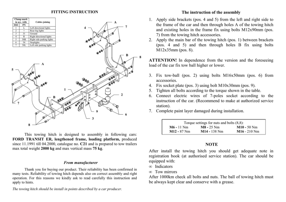 FITTING INSTRUCTION Clamp mark in acc. with ISO PN 1 L 2 + 3 31 4 R 5 58R 6 54 7 58L The instruction of the assembly 1. Apply side brackets (pos. 4 and 5) from the left and right side to the frame of the car and then through holes A of the towing hitch and existing holes in the frame fix using bolts M12x90mm (pos. 7) from the towing hitch accessories. 2. Apply the main bar of the towing hitch (pos. 1) between brackets (pos. 4 and 5) and then through holes B fix using bolts M12x35mm (pos. 8). A Cables joining 7 4 Left directional lights Rear fog lights Ground Right directional lights Right side parking lights Stoplights Left side parking lights B A 8 ATTENTION! In dependence from the version and the foreseeing load of the car fix tow ball higher or lower. 5 1 2 B 7 9 6 3. Fix tow-ball (pos. 2) using bolts M16x50mm (pos. 6) from accessories. 4. Fix socket plate (pos. 3) using bolt M10x30mm (pos. 9). 5. Tighten all bolts according to the torque shown in the table. 6. Connect electric wires of 7-poles socket according to the instruction of the car. (Recommend to make at authorized service station). 7. Complete paint layer damaged during installation. 3 8 This towing hitch is designed to assembly in following cars: FORD TRANSIT ER, lengthened frame, loading platform, produced since 11.1991 till 04.2000, catalogue no. C21 and is prepared to tow trailers max total weight 2000 kg and max vertical mass 75 kg. From manufacturer Thank you for buying our product. Their reliability has been confirmed in many tests. Reliability of towing hitch depends also on correct assembly and right operation. For this reasons we kindly ask to read carefully this instruction and apply to hints. The towing hitch should be install in points described by a car producer. Torque settings for nuts and bolts (8,8): M6 - 11 Nm M8 - 25 Nm M10 - 50 Nm M12 - 87 Nm M14 - 138 Nm M16 - 210 Nm NOTE After install the towing hitch you should get adequate note in registration book (at authorised service station). The car should be equipped with: • Indicators • Tow mirrors After 1000km check all bolts and nuts. The ball of towing hitch must be always kept clear and conserve with a grease. PPUH AUTO-HAK S.J. Towing hitch accessories: Produkcja Zaczepów Kulowych Henryk & Zbigniew Nejman 76-200 SŁUPSK ul. Słoneczna 16K tel/fax (059) 8-414-414; 8-414-413 E-mail: [email protected] www.autohak.com.pl Towing hitch (without electrical set) Class: A50-X Cat. no. C21 Designed for: Manufacturer: FORD Model: TRANSIT ER Type: lengthened frame, loading platform produced since 11.1991 till 04.2000 Technical data: D-value: 12,49 kN maximum trailer weight: 2000 kg maximum vertical cup mass: 75 kg Approval number according to Directive 94/20/EC: e20*94/20*0412*00 Foreword This towing hitch is designed according to rules of safety traffic regulations. The towing hitch is a safety component and can be install only by qualified personnel. Any alteration or conversion of the towing hitch is prohibited and would lead to cancellation of design certification. Remove insulating compound and underseal from vehicle (if present) in the area of the matting surfaces of the towing hitch. The vehicle manufacturer’s specifications regarding trailer mass and max. vertical cup mass are decisive for driving whereat values for the towing hitch cannot be exceeded. D-value formula: Max trailer weight [kg] x Max vehicle weight [kg] Max trailer weight [kg] + Max vehicle weight [kg] X 9,81 = 1000 D [kN] INSTRUKCJA MontaŜu i eksploatacji zaczepu kulowego Kolejność czynności przy montaŜu 1. PrzyłoŜyć wsporniki boczne zaczepu (poz. 4 i 5) z prawej i lewej strony do ramy samochodu, a następnie poprzez otwory zaczepu A oraz istniejące otwory w ramie skręcić śrubami M12x90mm (poz. 7) z wyposaŜenia. 2. Pomiędzy zamontowane wsporniki odpowiednio przyłoŜyć belkę główną zaczepu (poz. 1), a następnie poprzez otwory B skręcić śrubami M12x35mm (poz. 8) z wyposaŜenia. A Oznaczenie zacisku wg ISO PN 1 L 2 + 3 31 4 R 5 58R 6 54 7 58L 7 4 Łączenie przewodów Kierunkowskazy lewe Tylne światła przeciwmgłowe Masa Kierunkowskazy prawe Światła pozycyjne prawe Światła hamowania Światła pozycyjne lewe B A 5 2 7 9 UWAGA! W zaleŜności od wersji i przewidywanego obciąŜenia samochodu zamontować część kulistą wyŜej lub niŜej. 3. Przykręcić część kulistą zaczepu (poz. 2) śrubami M16x50mm (poz. 6) z wyposaŜenia. 4. Przykręcić blachę pod gniazdo (poz. 3) śrubą M10x30mm (poz. 9). 5. Dokręcić wszystkie śruby z momentem jak pokazano w tabeli. 6. Podłączyć przewody gniazdka 7 – bieg. do instalacji elektrycznej zgodnie z instrukcją fabryczną samochodu (zaleca się wykonanie w ASO). 7. Uzupełnić ewentualne ubytki powłoki malarskiej zaczepu powstałe w trakcie montaŜu. 1 B 8 6 3 8 Zaczep kulowy przeznaczony jest do zamontowania w samochodzie: FORD TRANSIT ER, przedłuŜona rama, skrzyniowy, produkowanym od 11.1991r. do 04.2000r., nr katalogowy C21 i słuŜy do ciągnięcia przyczep o masie całkowitej 2000 kg i nacisku na kulę max 75 kg. OD PRODUCENTA Dziękujemy za wybór produkowanego przez naszą firmę zaczepu kulowego. Jego niezawodność została potwierdzona licznymi testami oraz opiniami zadowolonych klientów. JednakŜe niezawodność zaczepów kulowych jest zaleŜna równieŜ od prawidłowego montaŜu oraz prawidłowej eksploatacji. Z tego powodu prosimy Państwa o staranne przeczytanie niniejszej instrukcji montaŜu oraz przestrzeganie właściwych wskazówek. Zaczep naleŜy zamontować w miejscach do tego celu przeznaczonych przez producenta samochodu. Zalecany moment skręcający dla śrub i nakrętek 8,8: M6 - 11 Nm M8 - 25 Nm M10 - 50 Nm M12 - 87 Nm M14 - 138 Nm M16 - 210 Nm UWAGA Po zamontowaniu zaczepu kulowego naleŜy uzyskać wpis w dowodzie rejestracyjnym pojazdu na „stacji kontroli pojazdów” właściwej dla miejsca zamieszkania. Samochód powinien być wyposaŜony w : -kierunkowskazy boczne -lusterka boc