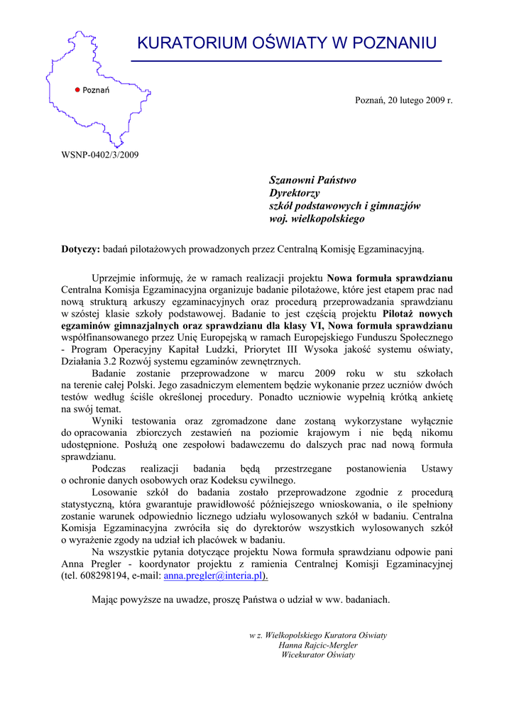 KURATORIUM OŚWIATY W POZNANIU Poznań, 20 lutego 2009 r. WSNP-0402/3/2009 Szanowni Państwo Dyrektorzy szkół podstawowych i gimnazjów woj. wielkopolskiego Dotyczy: badań pilotażowych prowadzonych przez Centralną Komisję Egzaminacyjną. Uprzejmie informuję, że w ramach realizacji projektu Nowa formuła sprawdzianu Centralna Komisja Egzaminacyjna organizuje badanie pilotażowe, które jest etapem prac nad nową strukturą arkuszy egzaminacyjnych oraz procedurą przeprowadzania sprawdzianu w szóstej klasie szkoły podstawowej. Badanie to jest częścią projektu Pilotaż nowych egzaminów gimnazjalnych oraz sprawdzianu dla klasy VI, Nowa formuła sprawdzianu współfinansowanego przez Unię Europejską w ramach Europejskiego Funduszu Społecznego - Program Operacyjny Kapitał Ludzki, Priorytet III Wysoka jakość systemu oświaty, Działania 3.2 Rozwój systemu egzaminów zewnętrznych. Badanie zostanie przeprowadzone w marcu 2009 roku w stu szkołach na terenie całej Polski. Jego zasadniczym elementem będzie wykonanie przez uczniów dwóch testów według ściśle określonej procedury. Ponadto uczniowie wypełnią krótką ankietę na swój temat. Wyniki testowania oraz zgromadzone dane zostaną wykorzystane wyłącznie do opracowania zbiorczych zestawień na poziomie krajowym i nie będą nikomu udostępnione. Posłużą one zespołowi badawczemu do dalszych prac nad nową formuła sprawdzianu. Podczas realizacji badania będą przestrzegane postanowienia Ustawy o ochronie danych osobowych oraz Kodeksu cywilnego. Losowanie szkół do badania zostało przeprowadzone zgodnie z procedurą statystyczną, która gwarantuje prawidłowość późniejszego wnioskowania, o ile spełniony zostanie warunek odpowiednio licznego udziału wylosowanych szkół w badaniu. Centralna Komisja Egzaminacyjna zwróciła się do dyrektorów wszystkich wylosowanych szkół o wyrażenie zgody na udział ich placówek w badaniu. Na wszystkie pytania dotyczące projektu Nowa formuła sprawdzianu odpowie pani Anna Pregler - koordynator projektu z ramienia Centralnej Komisji Egzaminacyjnej (tel. 608298194, e-mail: [email protected]). Mając powyższe na uwadze, proszę Państwa o udział w ww. badaniach. w z. Wielkopolskiego Kuratora Oświaty Hanna Rajcic-Mergler Wicekurator Oświaty