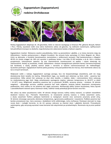 Zygopetalum (Zygopetalum) rodzina Orchidaceae Rodzaj Zygopetalum obejmuje ok. 20 gatunków, które w naturze występują w Ameryce Płd. głównie Brazylii, Boliwii i Peru. Pokrój, wysokość roślin oraz okres kwitnienia zależy od gatunku. Są roślinami naziemnymi, epifitycznymi lub petrofitami (rosnące na skałach), mają fantastycznie zabarwione kwiaty o ładnym zapachu. Zygopetalum mackaii. Wytwarza owalne pseudobulwy, które są jasnozielone i gładkie, a w miarę starzenia stają się żółtozielone i bardzo pomarszczone z długimi bruzdami. Na szczycie bulw wyrastają 2-3 liście długości ok. 50cm. Liście są skórzaste, o kształcie lancetowatym, jasnozielone z widocznymi nerwami. Pęd kwiatostanowy o długości 40-50 cm (może osiągać do 100 cm) wyrasta u podstawy bulwy i ma kilka (5-10) kwiatów o ф ok. 6cm o bardzo przyjemnym, intensywnym zapachu. Są one równomiernie rozmieszczone na pędzie i często otwierają się równocześnie. Kwiaty są woskowe, trwałe, żółtozielone z dużymi nieregularnymi plamami barwy czerwono-brązowej lub bordowej o dużej, płaskiej warżce (biała z nerwami w kolorze ciemnoczerwonym do niebieskiego). Są bardzo pachnące. Zygopetalum kwitnie późną jesienią i zimą (od października do marca), choć kwitnienie zdarza się też w innych terminach. Większość roślin z rodzaju Zygopetalum wymaga jasnego, lecz nie bezpośredniego oświetlenia, jeśli nie mają dostatecznej ilości światła nie kwitną. Wskaźnikiem tego, czy światło jest właściwe są liście roślin - powinny być jasnozielone. Żółty odcień liści wskazuje na zbyt silne światło, a miękkie, słabe i ciemnozielone liście wskazują na niedostateczną jego ilość. Mają umiarkowane wymagania cieplne, zalecane temperatury to 18-22°C w dzień i 14-16°C nocą. Wilgotność powietrza powinna być w granicach 50-80%, wczesną wiosną - mniejsza. W okresie wegetacji - aktywnego wzrostu, podłoże powinno być stale wilgotne, jesienią jednak stopniowo zmniejszamy podlewanie, choć rośliny te nie powinny być nigdy zasuszane. Wytwarzają obfity system korzeniowy, który łącznie z pseudobulwami stanowi spory rezerwuar wody, nadmiar wody powoduje gnicie korzeni oraz liści. Nie zaleca się także spryskiwania roślin. W okresie silnego wzrostu rośliny należy nawozić, co tydzień niewielkimi dawkami nawozu (np.: Florowit). Stwierdzono, że stosowanie jesienią nawozu o niskiej zawartości azotu, a dużej zawartości fosforu polepsza kwitnienie w następnym sezonie oraz wzmacnia przyrosty przed zimą. W okresie zimowego spoczynku obniżamy temperaturę, ograniczamy podlewanie i nawożenie. Podłoże powinno być bardzo przewiewne (np.: kora sosnowa z dodatkiem torfu włóknistego, mchu torfowca). Ponieważ storczyki te mają raczej duże i rozległe korzenie, to do ich uprawy zalecane są również duże i głębokie doniczki. Przesadzanie wykonujemy, gdy zaczynają wyrastać nowe korzenie lub natychmiast po przekwitnięciu. Rozmnaża się je przez podział bulw. Miejski Ogród Botaniczny w Zabrzu www.mob-zabrze.pl