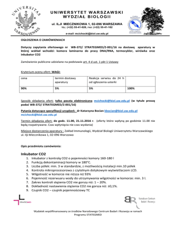 UNIWERSYTET WARSZAWSKI WYDZI AŁ BIOLOGII ul. ILJI MIECZNIKOWA 1, 02-096 WARSZAWA TEL: (+22) 55-41-028, FAX: (+22) 55-41-102 e-mail: [email protected] OGŁOSZENIA O ZAMÓWIENIACH Dotyczy zapytania ofertowego nr WB-372/ STRATEGMED/Z-001/16 na dostawę aparatury w której wskład wchodzi: komora laminarna do pracy DNA/RNA, termocykler, wirówka oraz inkubator CO2 Zamówienie publiczne udzielane na podstawie art. 4 d ust. 1 pkt 1 Ustawy Kryterium oceny ofert: WAGI: cena termin dostawy aparatury Reakcja serwisu do 24 h od zgłoszenia usterki 90% 5% 5% 100% Sposób składania ofert: tylko poczta elektroniczna [email protected] (w tytule proszę podać WB-372/ STRATEGMED/Z-001/16) Pytania dotyczące specyfikacji urządzeń: dr Katarzyna Bocian [email protected] [email protected] Termin składania ofert: do godz. 11.00, 21.11.2016 r. (oferty które wpłyną po godzinie 11.00 nie będą rozpatrywane. Czas wpłynięcia nie czas wysłania) Miejsce dostarczenia aparatury : Zakład Immunologii, Wydział Biologii Uniwersytetu Warszawskiego ul. Ilji Miecznikowa 1, 02-096 Warszawa Opis przedmiotu zamówienia: Inkubator CO2 1. 2. 3. 4. 5. 6. 7. 8. 9. Inkubator z kontrolą CO2 o pojemności komory 160-180 l Funkcją dekontaminacji komory w 180°C. Liczba półek: min. 3 w standardzie, z możliwością instalacji min.10 półek Kontrola mikroprocesorowa z czytelnym dotykowym wyświetlaczem LCD. Wilgotność w komorze nie niższa niż 93% Pojemność rezerwuaru wody do utrzymywania wilgotności w komorze: min. 3 l. Zakres kontroli stężenia CO2 nie gorszy niż: 1 – 20%. Dokładność nastawienia stężenia CO2 nie gorsza niż: ±0,1%. Czujnik CO2 – czujnik pojemnościowy TC Wydatek współfinansowany ze środków Narodowego Centrum Badań i Rozwoju w ramach Programu STATEGMED 10. Zakres temperatur nie gorszy niż: od temp. otoczenia +3°C do +55°C. 11. Jednorodność przestrzenna temperatury w komorze nie gorsza niż: < ±0,3°C. 12. Fluktuacja temperatury(°C) ±0,1 w 37 °C 13. Dokładność nastawienia temperatury nie gorsza niż: ±0,1°C. 14. Minimalna / maksymalna dopuszczalna temperatura otoczenia w zakresie min.: 18 – 34°C. 15. Maksymalne wymiary zewnętrzne (szer. x głęb. x wys.): 650×900×900 16. Moc nominalna: do 600 W 17. Do inkubatora dedykowana zmieniarka na 2 butle CO2 PRODUCENT TYP URZĄDZENIA CENA netto/brutto Długość gwarancji Termin dostawy Reakacja serwisu ............................................................................................... ................................................................................................ .................................................................................................. ...................................................................................................... ................................................................................................... ................................................................................................... Komora laminarna do pracy DNA/RNA 1. Komora do pracy sterylnej 2. Ściany ze szkła 3. Ściana tylna ze stali nierdzewnej 4. Blat roboczy ze stali nierdzewnej 5. Wbudowana otwarta lampa UV nie gorsza niż 1 x 25W. 6. Poziom promieniowana UV nie większa niż 15 mW/cm²/sek. 7. Timer 0-24 godz. lub tryb pracy ciągłej. 8. Lampa światła białego nie gorsza niż 1xTLD-15W. 9. Grubość ścian bocznych nie mniejsza niż 4 mm. 10. Grubość panelu frontowego górnego nie mniejsza niż 8 mm. 11. Grubość okna frontowego nie mniejsza niż 4 mm. 12. Przepuszczalność optyczna nie mniejsza niż 95 %. 13. Ochrona przeciw UV > 96 %. 14. Wymiary obszaru roboczego nie mniejsze niż 650 x 470 mm. 15. Automatyczne wyłączanie lampy UV po otwarciu okna. 16. Wymiary nie większe niż (SxGxW) 690 x 520 x 560 mm Wydatek współfinansowany ze środków Narodowego Centrum Badań i Rozwoju w ramach Programu STATEGMED 17. Pobór energii nie większy niż 70 W PRODUCENT TYP URZĄDZENIA CENA netto/brutto Długość gwarancji Termin dostawy Reakacja serwisu ............................................................................................... ................................................................................................ .................................................................................................. ...................................................................................................... ................................................................................................... ................................................................................................... Wirówka z chłodzeniem 1. Siła wirowania wirówki z rotorem wychylnym o pojemności 4 x 400 ml - RCF 4149 x g (4700 rpm); 2. Maksymalna prędkośc wirowania (z rotorem kątowym ) 15200 rpm (25830 x g) 3. Automatyczne powiadamianie w przypadku źle wyważonego rotora; 4. Minimum 9 prędkości rozpędzania i 10 prędkości hamowania 5. Rotor wychylny z czterema pojemnikami oraz dedykowanymi do pojemników rotora adapterami, w których mieści się, co najmniej: 16 probówek typu Falcon 50ml 36 probówek typu Falcon 15ml 76 probówek 5/7ml, o średnicy 12x75 mm o maksymalnej prędkości wirowania nie mniejszej niż 4 149 x g (4700 rpm). Rotor wraz z koszami, adapterami oraz pokrywami można sterylizować w autoklawie Możliwość zastosowania pokrywek nieprzepuszczających aerozoli do bezpiecznego wirowania niebezpiecznych próbek; 6. Rotor wychylny z dwoma wieszakami na mikropłytki, pojemność co najmniej 6 standardowych mikropłytek. Maksymalna prędkość wirowania 2 272 x g (4 000 rpm). 7. Regulacja od 0-maksymalna rotora ze skokiem co 100 rpm 8. Wirówka wyposażona w system wstępnego schładzania komory 9. Możliwość ustawienia temperatury komory w zakresie od -10 do +40 st. C 10.Czynnik chłodniczy wolny od CFC 11.Możliwość ustawiania zarówno wartości rpm jak i rcf; 12.Funkcja szybkiego zwirowania 13.Mo