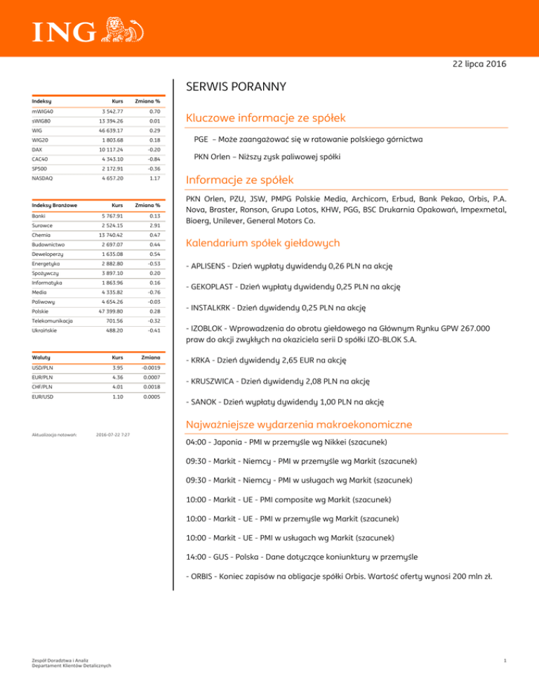22 lipca 2016 SERWIS PORANNY Indeksy Kurs Zmiana % mWIG40 3 542.77 0.70 sWIG80 13 394.26 0.01 WIG 46 639.17 0.29 WIG20 1 803.68 0.18 10 117.24 -0.20 CAC40 4 343.10 -0.84 SP500 2 172.91 -0.36 NASDAQ 4 657.20 1.17 Kurs Zmiana % Banki 5 767.91 0.13 Surowce 2 524.15 2.91 Chemia 13 740.42 0.47 Budownictwo 2 697.07 0.44 Deweloperzy 1 635.08 0.54 Energetyka 2 882.80 -0.53 Spożywczy 3 897.10 0.20 Informatyka 1 863.96 0.16 Media 4 335.82 -0.76 DAX Indeksy Branżowe Paliwowy 4 654.26 -0.03 47 399.80 0.28 Telekomunikacja 701.56 -0.32 Ukraińskie 488.20 -0.41 Waluty Kurs Zmiana USD/PLN 3.95 -0.0019 EUR/PLN 4.36 0.0007 CHF/PLN 4.01 0.0018 EUR/USD 1.10 0.0005 Polskie Kluczowe informacje ze spółek PGE – Może zaangażować się w ratowanie polskiego górnictwa PKN Orlen – Niższy zysk paliwowej spółki Informacje ze spółek PKN Orlen, PZU, JSW, PMPG Polskie Media, Archicom, Erbud, Bank Pekao, Orbis, P.A. Nova, Braster, Ronson, Grupa Lotos, KHW, PGG, BSC Drukarnia Opakowań, Impexmetal, Bioerg, Unilever, General Motors Co. Kalendarium spółek giełdowych - APLISENS - Dzień wypłaty dywidendy 0,26 PLN na akcję - GEKOPLAST - Dzień wypłaty dywidendy 0,25 PLN na akcję - INSTALKRK - Dzień dywidendy 0,25 PLN na akcję - IZOBLOK - Wprowadzenia do obrotu giełdowego na Głównym Rynku GPW 267.000 praw do akcji zwykłych na okaziciela serii D spółki IZO-BLOK S.A. - KRKA - Dzień dywidendy 2,65 EUR na akcję - KRUSZWICA - Dzień dywidendy 2,08 PLN na akcję - SANOK - Dzień wypłaty dywidendy 1,00 PLN na akcję Najważniejsze wydarzenia makroekonomiczne Aktualizacja notowań: 2016-07-22 7:27 04:00 - Japonia - PMI w przemyśle wg Nikkei (szacunek) 09:30 - Markit - Niemcy - PMI w przemyśle wg Markit (szacunek) 09:30 - Markit - Niemcy - PMI w usługach wg Markit (szacunek) 10:00 - Markit - UE - PMI composite wg Markit (szacunek) 10:00 - Markit - UE - PMI w przemyśle wg Markit (szacunek) 10:00 - Markit - UE - PMI w usługach wg Markit (szacunek) 14:00 - GUS - Polska - Dane dotyczące koniunktury w przemyśle - ORBIS - Koniec zapisów na obligacje spółki Orbis. Wartość oferty wynosi 200 mln zł. Zespół Doradztwa i Analiz Departament Klientów Detalicznych 1 22 lipca 2016 Kluczowe informacje ze spółek Informacje ze spółek PGE – Może zaangażować się w ratowanie polskiego górnictwa Zarząd i rada nadzorcza PKN Orlen wyrazili zgodę na realizację projektu budowy instalacji metatezy w Zakładzie Produkcyjnym w Płocku - podał koncern w komunikacie. Koszt inwestycji wyniesie około 400 mln zł. W procesie restrukturyzacji KHW być może potrzebny będzie 3 podmiot - powiedział w Sejmie wiceminister energii Grzegorz Tobiszowski. Dodał, że środki konieczne do restrukturyzacji zwiększyły się z 300 mln zł do 700 mln zł. Ostatnio pojawiały się informacje, że Węglokoks, nie będzie w stanie wziąć głównego ciężaru restrukturyzacji kopalń. Drugi podmiot, który zapowiedział uczestnictwo w restrukturyzacji to Enea. Natomiast trwają poszukiwania 3 partnera, w związku z tym, że jak to ujął wiceminister finansów Tobiszowski "W trakcie przeglądu sytuacji okazało się, że środki konieczne do restrukturyzacji zwiększyły się z 300 mln zł do 700 mln zł". Prawdopodobnym partnerem może być PGE, które mocno traciło na czwartkowej sesji. Mniej prawdopodobne jest zaangażowanie Tauronu, który sam jest już mocno zadłużony. PKN Orlen – Niższy zysk paliwowej spółki Zysk netto grupy PKN Orlen, przypadający akcjonariuszom jednostki dominującej, wzrósł w drugim kwartale 2016 roku do 1,608 mld zł z 1,367 mld zł przed rokiem. Wynik okazał się o 3,4 proc. niższy od prognoz analityków na poziomie 1,664 mld zł. PKN Orlen zyskiwał mocno w ostatnich kwartałach na spadających cenach ropy naftowej. PKN Orlen zajmuje się przetwórstwem ropy, a więc niższe ceny surowca pozwalały na zmniejszenie kosztów jednocześnie utrzymywać bardzo wysokie marże. Od początku roku widzimy jednak umacnianie się ropy naftowej, co może niekorzystnie się odbić w najbliższym czasie na spółce (jeżeli sytuacja będzie postępowała). Polski Koncern Naftowy Orlen chce pozostać spółką dywidendową - poinformował w czwartek dziennikarzy Sławomir Jędrzejczyk, wiceprezes PKN Orlen odpowiadając na pytanie, czy w nowej strategii mogą nastąpić jakieś zmiany odnośnie polityki dzielenia się zyskiem z akcjonariuszami. Polski Koncern Naftowy Orlen szacuje swoje roszczenia z tytułu pożaru w rafinerii w Litvinowie na około 2 mld zł - poinformował w czwartek Sławomir Jędrzejczyk, wiceprezes PKN Orlen. Polski Koncern Naftowy Orlen testuje różne gatunki ropy, w tym tę z Iranu i nie wyklucza, że w niedługim czasie może ona trafić do rafinerii płockiego koncernu - poinformował na czwartkowej konferencji prasowej Sławomir Jędrzejczyk, wiceprezes PKN Orlen. W drugim kwartale 2016 roku zysk EBITDA LIFO segmentu downstream PKN Orlenu wyniósł 2,291 mld zł wobec 2,712 mld zł rok wcześniej - poinformowała spółka w raporcie kwartalnym. W trzecim kwartale 2016 roku marża rafineryjna PKN Orlen spada do 4,3 dolara na baryłce a dyferencjał Ural/Brent zniżkuje do 2,2 dolarów na baryłce. Marża petrochemiczna zniżkuje natomiast do 964 euro za tonę - poinformował PKN Orlen w prezentacji. PKN Orlen do końca roku chce zakończyć prace nad nową pięcioletnią strategią na lata 2017-2021 - powiedział podczas telekonferencji Sławomir Jędrzejczyk, wiceprezes PKN Orlen. Polski Koncern Naftowy Orlen zamierza systematycznie wygaszać swoją budżetową markę ''Bliska'', jednak na razie nie ma wyznaczonej daty do kiedy taka likwidacja miałaby się zakończyć - poinformował w czwartek dziennikarzy Sławomir Jędrzejczyk, wiceprezes płockiego koncernu. Chcemy być najbardziej innowacyjną grupą finansową w Europie i zwiększać nasze udziały w rynku bankowym i ubezpieczeniowym - mówi PAP prezes PZU Michał Krupiński. ''Przyglądamy się potencjalnym