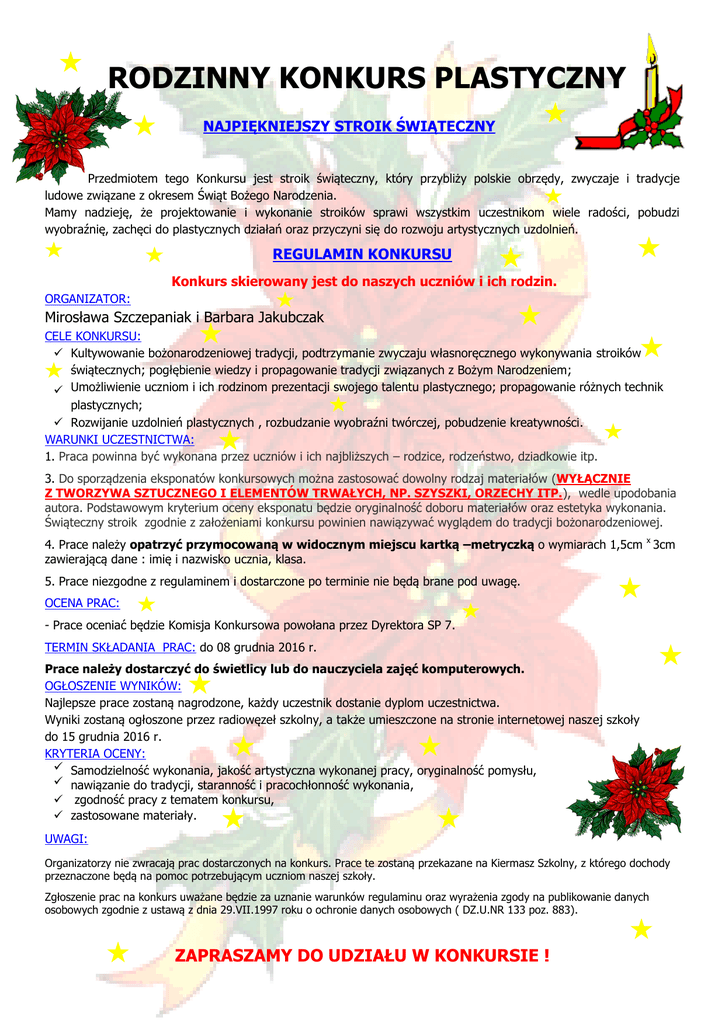 RODZINNY KONKURS PLASTYCZNY NAJPIĘKNIEJSZY STROIK ŚWIĄTECZNY Przedmiotem tego Konkursu jest stroik świąteczny, który przybliży polskie obrzędy, zwyczaje i tradycje ludowe związane z okresem Świąt Bożego Narodzenia. Mamy nadzieję, że projektowanie i wykonanie stroików sprawi wszystkim uczestnikom wiele radości, pobudzi wyobraźnię, zachęci do plastycznych działań oraz przyczyni się do rozwoju artystycznych uzdolnień. REGULAMIN KONKURSU Konkurs skierowany jest do naszych uczniów i ich rodzin. ORGANIZATOR: Mirosława Szczepaniak i Barbara Jakubczak CELE KONKURSU: Kultywowanie bożonarodzeniowej tradycji, podtrzymanie zwyczaju własnoręcznego wykonywania stroików świątecznych; pogłębienie wiedzy i propagowanie tradycji związanych z Bożym Narodzeniem; Umożliwienie uczniom i ich rodzinom prezentacji swojego talentu plastycznego; propagowanie różnych technik plastycznych; Rozwijanie uzdolnień plastycznych , rozbudzanie wyobraźni twórczej, pobudzenie kreatywności. WARUNKI UCZESTNICTWA: 1. Praca powinna być wykonana przez uczniów i ich najbliższych – rodzice, rodzeństwo, dziadkowie itp. 3. Do sporządzenia eksponatów konkursowych można zastosować dowolny rodzaj materiałów (WYŁĄCZNIE Z TWORZYWA SZTUCZNEGO I ELEMENTÓW TRWAŁYCH, NP. SZYSZKI, ORZECHY ITP.), wedle upodobania autora. Podstawowym kryterium oceny eksponatu będzie oryginalność doboru materiałów oraz estetyka wykonania. Świąteczny stroik zgodnie z założeniami konkursu powinien nawiązywać wyglądem do tradycji bożonarodzeniowej. 4. Prace należy opatrzyć przymocowaną w widocznym miejscu kartką –metryczką o wymiarach 1,5cm x 3cm zawierającą dane : imię i nazwisko ucznia, klasa. 5. Prace niezgodne z regulaminem i dostarczone po terminie nie będą brane pod uwagę. OCENA PRAC: - Prace oceniać będzie Komisja Konkursowa powołana przez Dyrektora SP 7. TERMIN SKŁADANIA PRAC: do 08 grudnia 2016 r. Prace należy dostarczyć do świetlicy lub do nauczyciela zajęć komputerowych. OGŁOSZENIE WYNIKÓW: Najlepsze prace zostaną nagrodzone, każdy uczestnik dostanie dyplom uczestnictwa. Wyniki zostaną ogłoszone przez radiowęzeł szkolny, a także umieszczone na stronie internetowej naszej szkoły do 15 grudnia 2016 r. KRYTERIA OCENY: Samodzielność wykonania, jakość artystyczna wykonanej pracy, oryginalność pomysłu, nawiązanie do tradycji, staranność i pracochłonność wykonania, zgodność pracy z tematem konkursu, zastosowane materiały. UWAGI: Organizatorzy nie zwracają prac dostarczonych na konkurs. Prace te zostaną przekazane na Kiermasz Szkolny, z którego dochody przeznaczone będą na pomoc potrzebującym uczniom naszej szkoły. Zgłoszenie prac na konkurs uważane będzie za uznanie warunków regulaminu oraz wyrażenia zgody na publikowanie danych osobowych zgodnie z ustawą z dnia 29.VII.1997 roku o ochronie danych osobowych ( DZ.U.NR 133 poz. 883). ZAPRASZAMY DO UDZIAŁU W KONKURSIE !