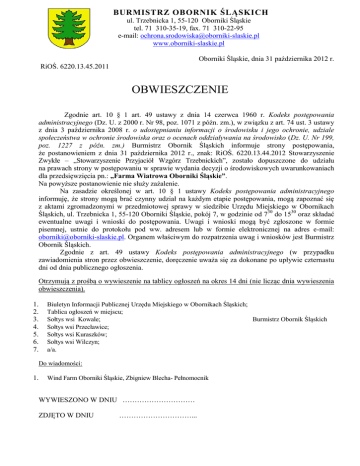 BURMISTRZ OBORNIK ŚLĄSKICH ul. Trzebnicka 1, 55-120 Oborniki Śląskie tel. 71 310-35-19, fax. 71 310-22-95 e-mail: [email protected] www.oborniki-slaskie.pl Oborniki Śląskie, dnia 31 października 2012 r. RiOŚ. 6220.13.45.2011 OBWIESZCZENIE Zgodnie art. 10 § 1 art. 49 ustawy z dnia 14 czerwca 1960 r. Kodeks postępowania administracyjnego (Dz. U. z 2000 r. Nr 98, poz. 1071 z późn. zm.), w związku z art. 74 ust. 3 ustawy z dnia 3 października 2008 r. o udostępnianiu informacji o środowisku i jego ochronie, udziale społeczeństwa w ochronie środowiska oraz o ocenach oddziaływania na środowisko (Dz. U. Nr 199, poz. 1227 z późn. zm.) Burmistrz Obornik Śląskich informuje strony postępowania, że postanowieniem z dnia 31 października 2012 r., znak: RiOŚ. 6220.13.44.2012 Stowarzyszenie Zwykłe – „Stowarzyszenie Przyjaciół Wzgórz Trzebnickich”, zostało dopuszczone do udziału na prawach strony w postępowaniu w sprawie wydania decyzji o środowiskowych uwarunkowaniach dla przedsięwzięcia pn.: „Farma Wiatrowa Oborniki Śląskie”. Na powyższe postanowienie nie służy zażalenie. Na zasadzie określonej w art. 10 § 1 ustawy Kodeks postępowania administracyjnego informuję, że strony mogą brać czynny udział na każdym etapie postępowania, mogą zapoznać się z aktami zgromadzonymi w przedmiotowej sprawy w siedzibie Urzędu Miejskiego w Obornikach Śląskich, ul. Trzebnicka 1, 55-120 Oborniki Śląskie, pokój 7, w godzinie od 730 do 1530 oraz składać ewentualne uwagi i wnioski do postępowania. Uwagi i wnioski mogą być zgłoszone w formie pisemnej, ustnie do protokołu pod ww. adresem lub w formie elektronicznej na adres e-mail: [email protected]. Organem właściwym do rozpatrzenia uwag i wniosków jest Burmistrz Obornik Śląskich. Zgodnie z art. 49 ustawy Kodeks postępowania administracyjnego (w przypadku zawiadomienia stron przez obwieszczenie, doręczenie uważa się za dokonane po upływie czternastu dni od dnia publicznego ogłoszenia. Otrzymują z prośbą o wywieszenie na tablicy ogłoszeń na okres 14 dni (nie licząc dnia wywieszenia obwieszczenia). Biuletyn Informacji Publicznej Urzędu Miejskiego w Obornikach Śląskich; Tablica ogłoszeń w miejscu; Sołtys wsi Kowale; Burmistrz Obornik Śląskich Sołtys wsi Przecławice; Sołtys wsi Kuraszków; Sołtys wsi Wilczyn; a/a. 1. 2. 3. 4. 5. 6. 7. Do wiadomości: Wind Farm Oborniki Śląskie, Zbigniew Blecha- Pełnomocnik 1. WYWIESZONO W DNIU ………………………… ZDJĘTO W DNIU …………………………...