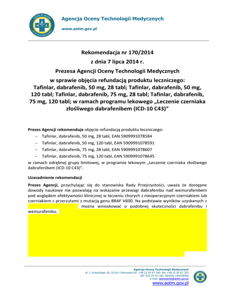 Rekomendacja nr 170/2014 z dnia 7 lipca 2014 Tafinlar, dabrafenib