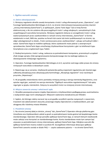 I. Ogólne warunki umowy A. Zakres obowiązywania 1. Niniejszy regulamin określa zasady korzystania z treści i usług oferowanych przez „Operatora”, czyli Funstage Spielewebseiten Betriebsges.m.b.H, na stronie internetowej (nazywanej poniżej również „stroną internetową GameTwist”), w aplikacjach „Game Twist Apps” lub w innej formie elektronicznej, o ile nie ustalono dla poszczególnych treści i usług odrębnych, samodzielnych i/lub uzupełniających warunków korzystania. Niniejszy regulamin dotyczy w szczególności treści i usług wykorzystywanych przez użytkowników w ramach strony internetowej „GameTwist” w formie wiadomości e-mail, SMS-ów, postów na forach lub czacie lub treści publikowanych na stronie, np. zdjęć udostępnianych w dziale „Treści zamieszczane przez użytkowników”, zakupu wirtualnych dóbr i walut. GameTwist Apps to mobilne aplikacje, które użytkownik może pobrać u zewnętrznych sprzedawców; GameTwist Apps umożliwiają Użytkownikowi korzystanie z gier na telefonach typu Smartphone oraz urządzeniach typu Tablet. 2. Rodzaj korzystania z treści i usług, zwłaszcza za pośrednictwem komputera, przenośnych urządzeń i/lub innego sprzętu i/lub oprogramowania komputerowego nie ma żadnego wpływu na obowiązywanie niniejszego regulaminu. 3. Operator, Funstage Spielewebseiten Betriebsges.m.b.H, wyraźnie zastrzega sobie prawo do zmiany niniejszych warunków w dowolnym czasie. 4. Rejestrując się w serwisie, Użytkownik potwierdza pełną znajomość regulaminu jak również jego całkowitą akceptację przez aktywację pola kontrolnego „Akceptuję regulamin” oraz naciśnięcie przycisku „Rejestracja”. 5. W przypadku stwierdzenia różnic pomiedzy niniejszą wersją a wersją niemiecką Regulaminu, oraz opisów reguł gier, ważność ma wersja niemiecka "Ogólnych warunków regulaminowych" lub opisy reguł gier w języku niemieckim. Dotyczy to wszystkich treści na niniejszej stronie internetowej. B. Miejsce zawarcia umowy i właściwość sądu 1. Wszelkie powiązania prawne między Operatorem a Użytkownikiem podlegają prawu austriackiemu z wyłączeniem jego norm odsyłających. Miejscem wykonania świadczenia jest Wiedeń. 2. Sądem, do którego należy zwracać się w przypadku wszelkich sporów związanych z zawarciem, trwaniem lub zakończeniem stosunku prawnego między Operatorem a Użytkownikiem, jest sąd okręgowy dla I dzielnicy miasta Wiednia. C. Przedmiot umowy 1. Na stronie (zwanej dalej w skrócie „stroną” lub „GameTwist”) Operator oferuje platformę gier. Umożliwia ona Użytkownikom udział w grach za pośrednictwem konta gościa lub bezpłatnego konta standardowego. Operator oferuje ponadto aplikacje GameTwist App, w ramach których Użytkownik może założyć oraz korzystać ze standardowego konta. Konto standardowe może tym samym być używane za pośrednictwem strony internetowej, aplikacji GameTwist App. Odrębne warunki dla aplikacji GameTwist można znaleźć w punkcie M. Szczegółowe informacje dotyczące aplikacji GameTwist zawarte zostały w dziale FAQ — często zadawane pytania — na stronie GameTwist. 2. Operator może według własnego uznania uzależnić dostęp do platformy gier, jak również do poszczególnych gier, aplikacji GameTwist App oraz oferowanych w nich treści i/lub świadczeń od określonych warunków (np. posiadania określonego rodzaju konta) – w poszczególnych wypadkach warunki te zostaną ogłoszone na stronie. Dostęp do platformy gier oraz poszczególnych gier, aplikacji GameTwist App oraz oferowanych w nich treści i/lub usług może ponadto zostać w dowolnym czasie tymczasowo lub trwale ograniczony. Odpowiednia informacja na ten temat zostanie opublikowana na stronie internetowej. 3. Operator zastrzega sobie prawo do bieżącego poszerzania, modyfikowania i uzupełniania oferty. D. Warunki uczestnictwa 1. Prawo do uczestnictwa w grach i korzystania z usług oferowanych na stronie, w GameTwist App przysługuje wyłącznie w zakresie faktycznie oferowanym przez Operatora oraz z uwzględnieniem wszystkich warunków i ograniczeń ustanowionych przez Operatora. Ww. ograniczenia i/lub warunki mogą obowiązywać wszystkich użytkowników, grupy użytkowników lub pojedynczych użytkowników. Zakres usług oferowany w ramach GameTwist App nie odpowiada zakresowi usług oferowanych na stronie internetowej oraz umieszczonych na niej gier. 2. Wyłączną odpowiedzialność za konfigurację techniczną urządzenia docelowego Użytkownika ponosi Użytkownik. Ze szczegółami zalecanej konfiguracji można zapoznać się w zakładce „Pomoc” w punkcie FAQ — często zadawane pytania. Operator oferuje Użytkownikowi bezpłatną pomoc udzielaną pocztą elektroniczną oraz pomoc odpłatną w formie infolinii. Użytkownikowi nie przysługuje prawo stałego dostępu do infolinii, ani też do otrzymania w określonym terminie odpowiedzi na pytanie przesłane pocztą elektroniczną. Opłaty za korzystanie z infolinii opublikowane są na stronie. 3. Inne oferowane bezpłatnie świadczenia dodatkowe nie są częścią świadczenia, do którego zobowiązany jest Operator, a ich oferta może zostać wycofana przez niego w dowolnym czasie. E. Zgłoszenie / rejestracja 1. Konto gościa: 1.1 Konto gościa umożliwia ograniczone użytkowanie konta mające na celu wypróbowanie gier standardowych na GameTwist bez rejestracji i wybrania nazwy użytkownika. Korzystanie z narzędzi komunikacyjnych na GameTwist nie jest możliwe z kontem gościa. Również w GameTwist App możliwe jest konto gościa, które nazywane jest „Guest Account“. To konto umożliwia korzystanie z GameTwist App, ogranicza jednak możliwość otrzymania darmowych twistów. Twisty zakupione w ramach Guest Accounts zostają po rejestracji zostać dodane do konta standardowego. 1.2 Dostęp do gier ogranicza się do próbnych partii standardowych gier w pokojach dla początkujących. 2. Konto stan