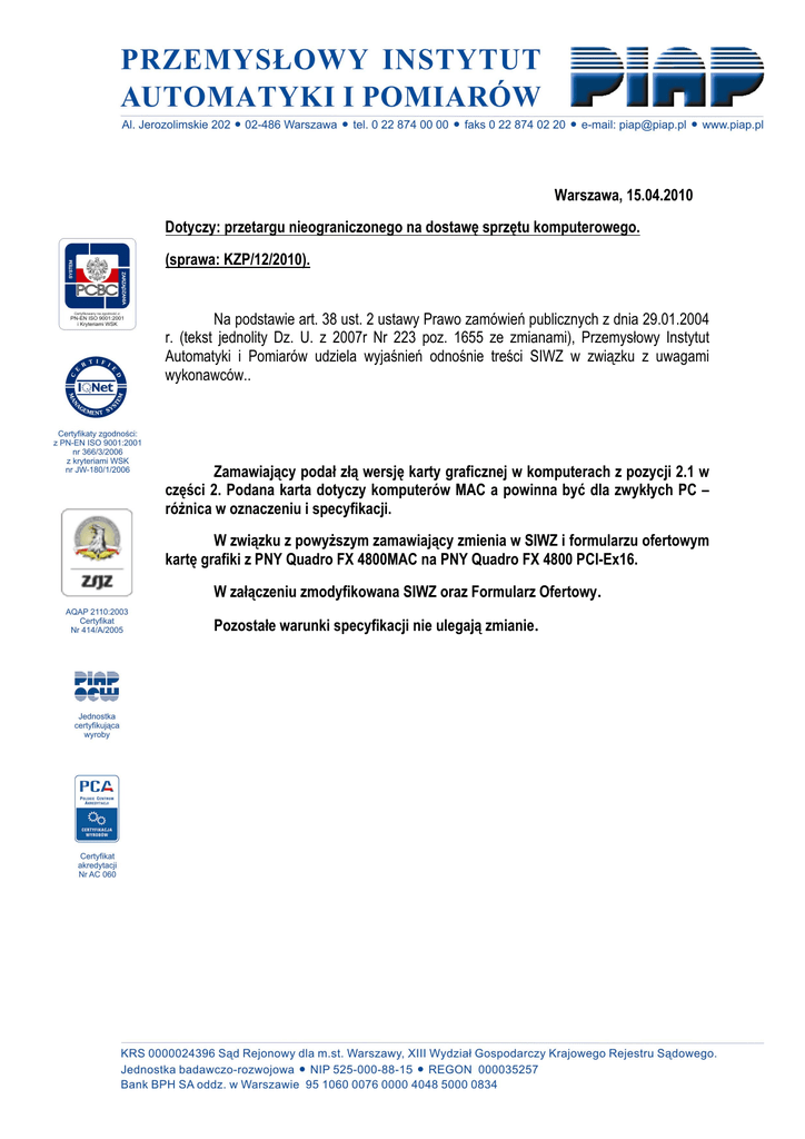 Warszawa, 15.04.2010 Dotyczy: przetargu nieograniczonego na dostawę sprzętu komputerowego. (sprawa: KZP/12/2010). Na podstawie art. 38 ust. 2 ustawy Prawo zamówień publicznych z dnia 29.01.2004 r. (tekst jednolity Dz. U. z 2007r Nr 223 poz. 1655 ze zmianami), Przemysłowy Instytut Automatyki i Pomiarów udziela wyjaśnień odnośnie treści SIWZ w związku z uwagami wykonawców.. Zamawiający podał złą wersję karty graficznej w komputerach z pozycji 2.1 w części 2. Podana karta dotyczy komputerów MAC a powinna być dla zwykłych PC – różnica w oznaczeniu i specyfikacji. W związku z powyższym zamawiający zmienia w SIWZ i formularzu ofertowym kartę grafiki z PNY Quadro FX 4800MAC na PNY Quadro FX 4800 PCI-Ex16. W załączeniu zmodyfikowana SIWZ oraz Formularz Ofertowy. Pozostałe warunki specyfikacji nie ulegają zmianie.