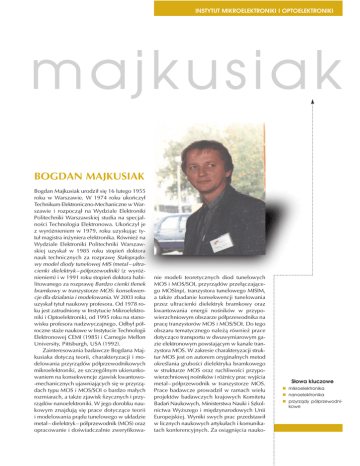 INSTYTUT MIKROELEKTRONIKI I OPTOELEKTRONIKI majkusiak BOGDAN MAJKUSIAK Bogdan Majkusiak urodził się 16 lutego 1955 roku w Warszawie. W 1974 roku ukończył Technikum Elektroniczno-Mechaniczne w Warszawie i rozpoczął na Wydziale Elektroniki Politechniki Warszawskiej studia na specjalności Technologia Elektronowa. Ukończył je z wyróżnieniem w 1979, roku uzyskując tytuł magistra inżyniera elektronika. Również na Wydziale Elektroniki Politechniki Warszawskiej uzyskał w 1985 roku stopień doktora nauk technicznych za rozprawę Stałoprądowy model diody tunelowej MIS (metal – ultracienki dielektryk – półprzewodnik) (z wyróżnieniem) i w 1991 roku stopień doktora habilitowanego za rozprawę Bardzo cienki tlenek bramkowy w tranzystorze MOS: konsekwencje dla działania i modelowania. W 2003 roku uzyskał tytuł naukowy profesora. Od 1978 roku jest zatrudniony w Instytucie Mikroelektroniki i Optoelektroniki, od 1995 roku na stanowisku profesora nadzwyczajnego. Odbył półroczne staże naukowe w Instytucie Technologii Elektronowej CEMI (1985) i Carnegie Mellon University, Pittsburgh, USA (1992). Zainteresowania badawcze Bogdana Majkusiaka dotyczą teorii, charakteryzacji i modelowania przyrządów półprzewodnikowych mikroelektroniki, ze szczególnym ukierunkowaniem na konsekwencje zjawisk kwantowo-mechanicznych ujawniających się w przyrządach typu MOS i MOS/SOI o bardzo małych rozmiarach, a także zjawisk fizycznych i przyrządów nanoelektroniki. W jego dorobku naukowym znajdują się prace dotyczące teorii i modelowania prądu tunelowego w układzie metal – dielektryk – półprzewodnik (MOS) oraz opracowanie i doświadczalnie zweryfikowa- nie modeli teoretycznych diod tunelowych MOS i MOS/SOI, przyrządów przełączającego MOS(np), tranzystora tunelowego MISIM, a także zbadanie konsekwencji tunelowania przez ultracienki dielektryk bramkowy oraz kwantowania energii nośników w przypowierzchniowym obszarze półprzewodnika na pracę tranzystorów MOS i MOS/SOI. Do tego obszaru tematycznego należą również prace dotyczące transportu w dwuwymiarowym gazie elektronowym powstającym w kanale tranzystora MOS. W zakresie charakteryzacji struktur MOS jest on autorem oryginalnych metod określania grubości dielektryka bramkowego w strukturze MOS oraz ruchliwości przypowierzchniowej nośników i różnicy prac wyjścia metal – półprzewodnik w tranzystorze MOS. Prace badawcze prowadził w ramach wielu projektów badawczych krajowych Komitetu Badań Naukowych, Ministerstwa Nauki i Szkolnictwa Wyższego i międzynarodowych Unii Europejskiej. Wyniki swych prac przedstawił w licznych naukowych artykułach i komunikatach konferencyjnych. Za osiągnięcia nauko- Słowa kluczowe n mikroelektronika n nanoelektronika n przyrządy półprzewodnikowe INSTYTUT MIKROELEKTRONIKI I OPTOELEKTRONIKI M we otrzymał Nagrodę Ministra Nauki i Szkolnictwa Wyższego oraz wielokrotnie Nagrodę Rektora Politechniki Warszawskiej. Tematykę swych prac badawczych wprowadzał do dydaktyki, opracowując i uruchamiając oryginalne wykłady: „Fizyczne podstawy przetwarzania informacji”, „Podstawy fizyczne nanoelektroniki”, „Charakteryzacja struktur i technologii mikroelektronicznych”. Prowadził też wykłady z zakresu podstaw elektroniki półprzewodnikowej i przyrządów półprzewodnikowych, w języku polskim i w języku angielskim. Pracę naukową i dydaktyczną łączył z intensywną działalnością organizacyjną. W latach 1993 –1996 był członkiem Rady Programowej i członkiem Komisji ds. Studiów w Języku Angielskim, w latach 1996–1999 koordynatorem Rad Programowych na Wydziale Elektroniki i Technik Informacyjnych, od 1996 roku członkiem Komisji ds. Kształcenia, od 1999 roku członkiem Senackiej Komisji ds. Badań Naukowych, był też członkiem lub przewodniczącym licznych komisji doraźnych. W latach 1993 –1996 był kierownikiem specjalności Mikroelektronika. W latach 1996– –1999 pełnił na Wydziale Elektroniki i Technik Informacyjnych funkcję prodziekana ds. nauczania, a w kadencji 1999 –2002 funkcję prodziekana ds. ogólnych. W 2010 roku został kierownikiem specjalności Mikroelektronika, fotonika i nanotechnologie. Był członkiem komitetów naukowych krajowych i międzynarodowych konferencji, jak np.: INFOS 2005 w Leuven, INFOS 2007 w Atenach, INFOS 2009 w Cambidge, INFOS 2011 w Grenoble, IWCE 2010 w Pizie. Jest żonaty, ma dwóch synów.