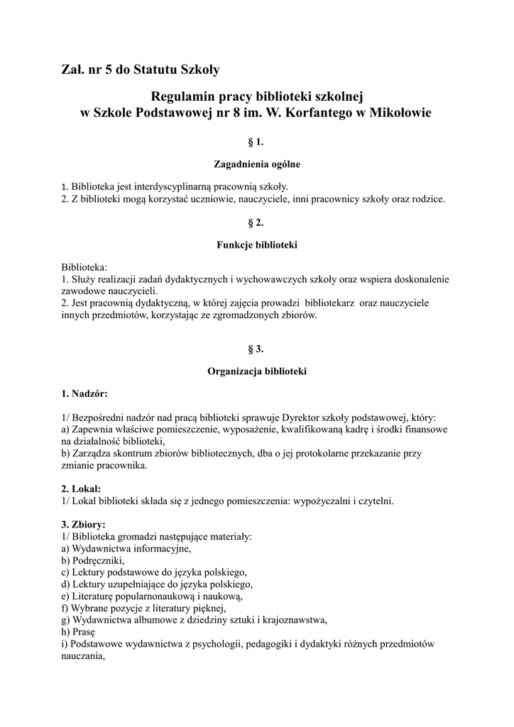 Zał. nr 5 do Statutu Szkoły Regulamin pracy biblioteki szkolnej w Szkole Podstawowej nr 8 im. W. Korfantego w Mikołowie § 1. Zagadnienia ogólne 1. Biblioteka jest interdyscyplinarną pracownią szkoły. 2. Z biblioteki mogą korzystać uczniowie, nauczyciele, inni pracownicy szkoły oraz rodzice. § 2. Funkcje biblioteki Biblioteka: 1. Służy realizacji zadań dydaktycznych i wychowawczych szkoły oraz wspiera doskonalenie zawodowe nauczycieli. 2. Jest pracownią dydaktyczną, w której zajęcia prowadzi bibliotekarz oraz nauczyciele innych przedmiotów, korzystając ze zgromadzonych zbiorów. § 3. Organizacja biblioteki 1. Nadzór: 1/ Bezpośredni nadzór nad pracą biblioteki sprawuje Dyrektor szkoły podstawowej, który: a) Zapewnia właściwe pomieszczenie, wyposażenie, kwalifikowaną kadrę i środki finansowe na działalność biblioteki, b) Zarządza skontrum zbiorów bibliotecznych, dba o jej protokolarne przekazanie przy zmianie pracownika. 2. Lokal: 1/ Lokal biblioteki składa się z jednego pomieszczenia: wypożyczalni i czytelni. 3. Zbiory: 1/ Biblioteka gromadzi następujące materiały: a) Wydawnictwa informacyjne, b) Podręczniki, c) Lektury podstawowe do języka polskiego, d) Lektury uzupełniające do języka polskiego, e) Literaturę popularnonaukową i naukową, f) Wybrane pozycje z literatury pięknej, g) Wydawnictwa albumowe z dziedziny sztuki i krajoznawstwa, h) Prasę i) Podstawowe wydawnictwa z psychologii, pedagogiki i dydaktyki różnych przedmiotów nauczania, b) Prasa i księgozbiór podręczny udostępniane są w czytelni. 4. Pracownicy: 1/ Biblioteką szkolną kieruje nauczyciel bibliotekarz, b) Zasady zatrudniania nauczycieli bibliotekarzy określają odrębne przepisy. 5. Czas pracy biblioteki: 1/ Biblioteka udostępnia swoje zbiory w czasie trwania zajęć dydaktycznych zgodnie z organizacją roku szkolnego, 2/ Okres udostępniania zostaje odpowiednio skrócony w czasie przeprowadzania w bibliotece skontrum, 3/ Dni i godziny pracy biblioteki będą szczegółowo określane przez dyrektora szkoły na dany rok. 4. Finansowanie wydatków: 1/ Wydatki pokrywane są z budżetu szkoły, 2/ Wysokość kwoty na potrzeby biblioteki ustalona jest na początku roku kalendarzowego, 3/ Propozycje wydatków na uzupełnienie zbiorów zatwierdza dyrektor szkoły, 4/ Działalność biblioteki może być dotowana przez Radę Rodziców i innych ofiarodawców. § 4. Zadania i obowiązki nauczyciela bibliotekarza 1. Praca pedagogiczna : W ramach pracy pedagogicznej nauczyciel bibliotekarz obowiązany jest do: 1/ Udostępniania zbiorów w wypożyczalni i czytelni, 2/ Indywidualnego doradztwa w doborze lektury, 3/ Udzielania informacji, 4/ Prowadzenia zajęć z edukacji czytelniczej i medialnej przy współpracy z wychowawcami i nauczycielami poszczególnych przedmiotów, 5/ Prowadzenia zespołu uczniów współpracujących z biblioteką i pomagających bibliotekarzowi w pracy, 6/ Informowania nauczycieli i wychowawców na podstawie obserwacji pedagogicznej i prowadzonej statystyki o poziomie czytelnictwa w poszczególnych klasach, 7/ Prowadzenia różnych form upowszechniania czytelnictwa. Ponadto: 8/ Odpowiada za stan i wykorzystanie powierzonych mu zbiorów, 9/ Współpracuje z wychowawcami i nauczycielami poszczególnych przedmiotów, 10/ Opiekuje się zespołem uczniów współpracujących z biblioteką i pomagających bibliotekarzowi w pracy, 11/ Sporządza plan pracy oraz okresowe i roczne sprawozdanie z pracy, 12/ Prowadzi dzienną, miesięczną, semestralną oraz roczną statystykę wypożyczeń, dziennik pracy biblioteki, księgi inwentarzowe, rejestry ubytków, ewidencję wypożyczeń, 13/ Doskonali warsztat pracy. 2. Praca organizacyjno – techniczna: W ramach prac organizacyjnych i technicznych nauczyciel bibliotekarz obowiązany jest do: 1/ Gromadzenia zbiorów 2/ Ewidencji zbiorów – zgodnie z obowiązującymi przepisami, 3/ Opracowania zbiorów (klasyfikowanie, katalogowanie, opracowanie techniczne), 4/Selekcji zbiorów (materiałów zbędnych i zniszczonych), 5/Organizacji udostępniania zbiorów, 6/ Organizacji warsztatu informacyjnego (wydzielania księgozbioru podręcznego, prowadzenie katalogów). § 5. Organizacja udostępniania zbiorów. 1. Czytelnicy mają prawo do bezpłatnego korzystania z księgozbioru biblioteki. 2. Korzystając z biblioteki, zobowiązani są do dbałości o wypożyczone książki. 3. Zbiory biblioteki udostępniane są w roku szkolnym od 6 września do 10 czerwca w godzinach wyszczególnionych na drzwiach i gazetkach. 3. Czytelnik ma wolny dostęp do półek. 4. Jednorazowo można wypożyczyć 2 książki na okres 14-tu dni, ale w uzasadnionych przypadkach biblioteka może ograniczyć lub zwiększyć liczbę wypożyczeń z podaniem terminu ich zwrotu. 5. Uczniowie przygotowujący się do konkursów i olimpiad mają prawo do wypożyczenia większej liczby książek. 6. Czytelnik może wypożyczać książki wyłącznie na swoje nazwisko. Książek wypożyczonych w bibliotece nie należy pożyczać innym osobom. 7. Czytelnik może prosić o zarezerwowanie potrzebnej mu pozycji (rezerwacja książek realizowana według kolejności zgłoszeń). 8. Księgozbiór podręczny ( słowniki, encyklopedie, leksykony, wydawnictwa albumowe) udostępnia się tylko w czytelni, a pozostałe książki i czasopisma można wypożyczać do domu. 9. Korzystających z czytelni wpisujemy do dziennika biblioteki szkolnej. 10. W stosunku do czytelników przetrzymujących książki mogą być zastosowane kary: uwagi negatywne, nagana wychowawcy klasy, okresowe wstrzymanie wypożyczenia. 11. Czytelnik powinien zwrócić uwagę na stan książki przed wypożyczeniem, a bibliotekarz przy zwrocie książki. 12.Czytelnik zobowiązany jest odkupić zagubioną lub zniszczoną książkę, ewentualnie dostarczyć inną, ale uzgodnioną z bibliotekarzem. 13. Wszystkie wypożyczone książki powinny być zwrócone przed końcem roku szkolnego do dnia 10 czerwc