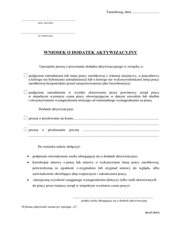 Tarnobrzeg, dnia .............................. ........................................................... imię i nazwisko .......................................................... nr ewidencyjny WNIOSEK O DODATEK AKTYWIZACYJNY Uprzejmie proszę o przyznanie dodatku aktywizacyjnego w związku z: podjęciem zatrudnienia lub innej pracy zarobkowej z własnej inicjatywy, u pracodawcy u którego nie byłem(am) zatrudniony(a) lub u którego nie wykonywałem(am) innej pracy zarobkowej bezpośrednio przed zarejestrowaniem jako bezrobotny(a). podjęciem zatrudnienia w wyniku skierowania przez powiatowy urząd pracy w niepełnym wymiarze czasu pracy obowiązującym w danym zawodzie lub służbie i otrzymywaniem wynagrodzenia niższego od minimalnego wynagrodzenia za pracę. Dodatek aktywizacyjny: proszę o przelewanie na konto.............................................................................................. ............................................................................................................................................... proszę o przekazanie pocztą .................................................................................... ............................................................................................................................................... Do wniosku należy dołączyć: podpisane oświadczenie osoby ubiegającej się o dodatek aktywizacyjny, kserokopię umowy o pracę lub umowy o wykonywanie innej pracy zarobkowej, potwierdzoną za zgodność z oryginałem lub oryginał umowy do wglądu, albo zaświadczenie określające datę rozpoczęcia i zakończenia pracy, miesięczną wysokość osiąganego wynagrodzenia (dotyczy tylko osób skierowanych do pracy przez tutejszy urząd w niepełnym wymiarze czasu pracy). ........................................................................................ podpis osoby ubiegającej się o dodatek aktywizacyjny Wybraną odpowiedź zaznaczyć wpisując „X”. [01.07.2013] OŚWIADCZENIE OSOBY UBIEGAJĄCEJ SIĘ O DODATEK AKTYWIZACYJNY I. Zostałem(am) poinformowany(a), że do wniosku o dodatek aktywizacyjny należy dołączyć: kserokopię umowy o pracę lub umowy o wykonywanie innej pracy zarobkowej, potwierdzoną za zgodność z oryginałem lub oryginał umowy do wglądu albo zaświadczenie określające: datę rozpoczęcia zatrudnienia lub innej pracy zarobkowej, datę rozpoczęcia i końca zatrudnienia, jeśli jest to umowa na czas określony lub zastępstwo itp., miesięczną wysokość osiąganego wynagrodzenia (dotyczy tylko osób skierowanych do pracy przez tutejszy urząd w niepełnym wymiarze czasu pracy). Nie uzupełnienie niniejszego wniosku w terminie miesiąca od daty jego złożenia o w/wym dokument, niezbędny do ustalenia uprawnień do dodatku aktywizacyjnego, spowoduje pozostawienie wniosku o przyznanie dodatku aktywizacyjnego bez rozpoznania. Osoby, które przedstawiły dokument potwierdzający podjęcie pracy w chwili wyrejestrowania z ewidencji osób bezrobotnych nie są zobligowane do doręczenia w/wym załącznika. Zostałem(am) pouczony(a), że prawo do dodatku aktywizacyjnego przysługuje od dnia złożenia wniosku o dodatek aktywizacyjny wraz ze wskazanym wyżej załącznikiem (jednak nie wcześniej niż od dnia podjęcia pracy). II. Świadomy(a) odpowiedzialności karnej wynikającej z art. 233 § 1 Kodeksu Karnego za składanie fałszywych oświadczeń, oświadczam że zostałem(am) pouczony(a) o obowiązku: 1. doręczenia dokumentu potwierdzającego fakt kontynuowania zatrudnienia lub innej pracy zarobkowej przypadający w okresie przysługiwania dodatku aktywizacyjnego (tj. w przypadku podpisania kolejnej umowy przez osobę uprawnioną do dodatku aktywizacyjnego kolejno po umowie na podstawie której przyznano świadczenie). Jeżeli między poszczególnymi umowami zawartymi z dwoma różnymi pracodawcami przez osobę uprawnioną do dodatku aktywizacyjnego nie ma przerwy, osoba ta zachowa prawo do dodatku, gdyż zachowana jest ciągłość świadczenia pracy. Wyjątek stanowi przypadek podjęcia pracy u pracodawcy u którego osoba była zatrudniona lub dla którego wykonywała inną pracę zarobkową bezpośrednio przed zarejestrowaniem jako osoba bezrobotna. W przypadku zmiany pracodawcy lub podpisania kolejnej umowy z dotychczasowym pracodawcą, osoba zachowa prawo do świadczenia, jeśli nie było przerwy w świadczeniu pracy lub przerwa spowodowana była wystąpieniem dni wolnych od jej wykonywania. Dodatek aktywizacyjny nie przysługuje, gdy między kolejnymi umowami zawartymi z różnymi pracodawcami jest przerwa obejmująca dzień roboczy i dana osoba w czasie tej przerwy nie zarejestrowała się w PUP, 2. doręczenia dokumentu potwierdzającego fakt przedterminowego zakończenia zatrudnienia lub wykonywania innej pracy zarobkowej (tj. rozwiązanie umowy przed upływem terminu wskazanego w umowie o pracę lub w umowie o wykonywanie innej pracy zarobkowej) przypadający w okresie przysługiwania dodatku aktywizacyjnego, 3. doręczenia dokumentu potwierdzającego fakt zakończenia pracy w przypadku podpisania umowy na czas zastępstwa za czas nieobecności pracownika przypadający w okresie przysługiwania dodatku aktywizacyjnego, 4. poinformowania Powiatowego Urzędu Pracy w Tarnobrzegu o okresach niewykonywania pracy (w tym min. o urlopach bezpłatnych), ponieważ dodatek aktywizacyjny przysługuje za okres faktycznego wykonywania pracy, 5. niezwłocznego informowania PUP w Tarnobrzegu o wszelkich zmianach mających wpływ na wypłatę w/wym świadczenia. 1 III. Osoba ubiegająca się o dodatek aktywizacyjny oświadcza, że zapoznała się z powyższym oświadczeniem i zobowiązuje się niezwłocznie powiadomić PUP w Tarnobrzegu (pok nr 4 w godz od 800 do 1500 wejście przez salę nr 1 bez konieczności pobierania biletu) o: 1. zaistnieniu okoliczności o których mowa w pkt. II w terminie 7 dni od dnia zaistnienia zdarzenia, 2. zmianie termin