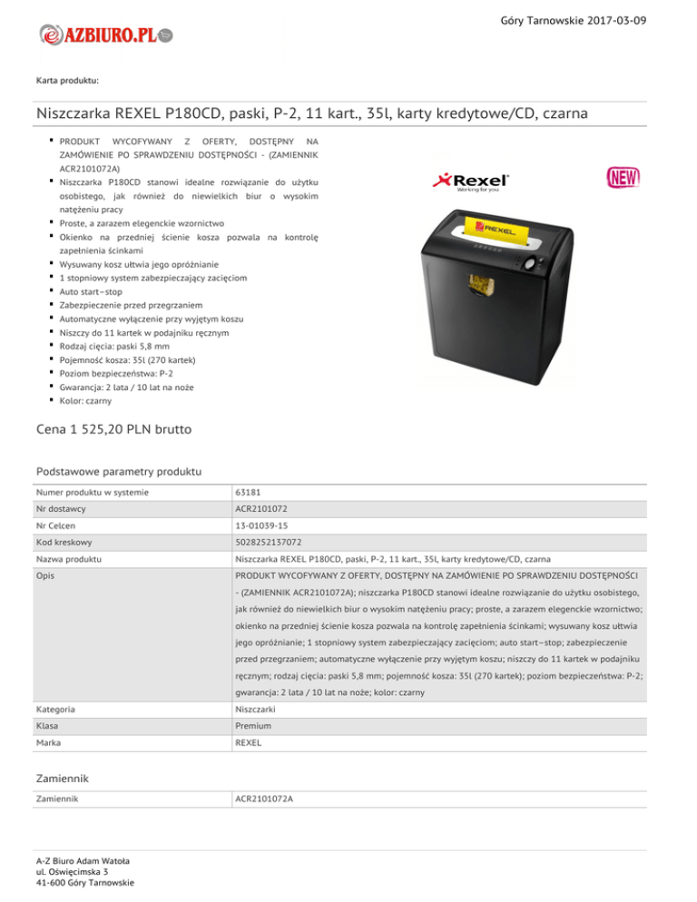 Góry Tarnowskie 2017-03-09 Karta produktu: Niszczarka REXEL P180CD, paski, P-2, 11 kart., 35l, karty kredytowe/CD, czarna PRODUKT WYCOFYWANY Z OFERTY, DOSTĘPNY NA ZAMÓWIENIE PO SPRAWDZENIU DOSTĘPNOŚCI - (ZAMIENNIK ACR2101072A) Niszczarka P180CD stanowi idealne rozwiązanie do użytku osobistego, jak również do niewielkich biur o wysokim natężeniu pracy Proste, a zarazem elegenckie wzornictwo Okienko na przedniej ścienie kosza pozwala na kontrolę zapełnienia ścinkami Wysuwany kosz ułtwia jego opróżnianie 1 stopniowy system zabezpieczający zacięciom Auto start–stop Zabezpieczenie przed przegrzaniem Automatyczne wyłączenie przy wyjętym koszu Niszczy do 11 kartek w podajniku ręcznym Rodzaj cięcia: paski 5,8 mm Pojemność kosza: 35l (270 kartek) Poziom bezpieczeństwa: P-2 Gwarancja: 2 lata / 10 lat na noże Kolor: czarny Cena 1 525,20 PLN brutto Podstawowe parametry produktu Numer produktu w systemie 63181 Nr dostawcy ACR2101072 Nr Celcen 13-01039-15 Kod kreskowy 5028252137072 Nazwa produktu Niszczarka REXEL P180CD, paski, P-2, 11 kart., 35l, karty kredytowe/CD, czarna Opis PRODUKT WYCOFYWANY Z OFERTY, DOSTĘPNY NA ZAMÓWIENIE PO SPRAWDZENIU DOSTĘPNOŚCI - (ZAMIENNIK ACR2101072A); niszczarka P180CD stanowi idealne rozwiązanie do użytku osobistego, jak również do niewielkich biur o wysokim natężeniu pracy; proste, a zarazem elegenckie wzornictwo; okienko na przedniej ścienie kosza pozwala na kontrolę zapełnienia ścinkami; wysuwany kosz ułtwia jego opróżnianie; 1 stopniowy system zabezpieczający zacięciom; auto start–stop; zabezpieczenie przed przegrzaniem; automatyczne wyłączenie przy wyjętym koszu; niszczy do 11 kartek w podajniku ręcznym; rodzaj cięcia: paski 5,8 mm; pojemność kosza: 35l (270 kartek); poziom bezpieczeństwa: P-2; gwarancja: 2 lata / 10 lat na noże; kolor: czarny Kategoria Niszczarki Klasa Premium Marka REXEL Zamiennik Zamiennik A-Z Biuro Adam Watoła ul. Oświęcimska 3 41-600 Góry Tarnowskie ACR2101072A Góry Tarnowskie 2017-03-09 Karta katalogowa produktu cd. Niszczarka REXEL P180CD, paski, P-2, 11 kart., 35l, karty kredytowe/CD, czarna Wymiary Pojemność (ml) 35000 Ilość Ilość arkuszy 11 Cecha Poziom bezpieczeństwa P-2 Rodzaj ścinek Paski Rodzaj Tnie karty kredytowe i CD Produkt Do małych biur W ofercie od 2017-01 Typ Standard Wspólny słownik zamówień CPV 30191400-8 Niszczarki Certyfikaty Ilość lat gwarancji 2 Hit Standard Nowy produkt w ofercie Nowość Kolor Kolor Pozostałe zdjęcia produktu Serdecznie zapraszamy do współpracy A-Z Biuro Adam Watoła zespół. A-Z Biuro Adam Watoła ul. Oświęcimska 3 41-600 Góry Tarnowskie Czarny