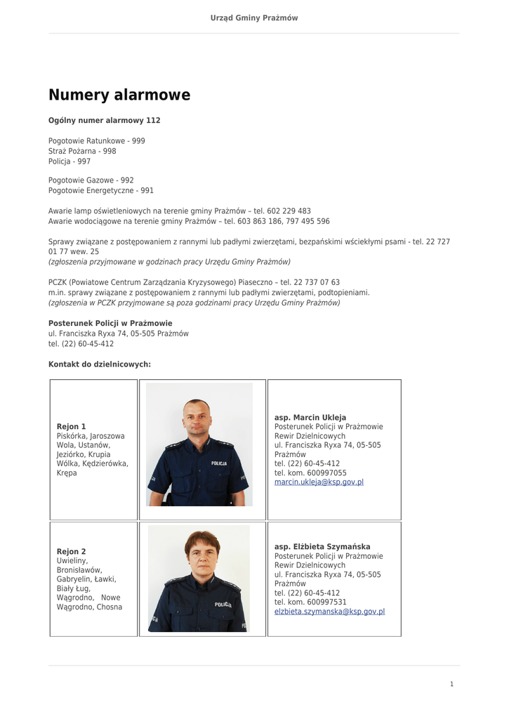 Urząd Gminy Prażmów Numery alarmowe Ogólny numer alarmowy 112 Pogotowie Ratunkowe - 999 Straż Pożarna - 998 Policja - 997 Pogotowie Gazowe - 992 Pogotowie Energetyczne - 991 Awarie lamp oświetleniowych na terenie gminy Prażmów – tel. 602 229 483 Awarie wodociągowe na terenie gminy Prażmów – tel. 603 863 186, 797 495 596 Sprawy związane z postępowaniem z rannymi lub padłymi zwierzętami, bezpańskimi wściekłymi psami - tel. 22 727 01 77 wew. 25 (zgłoszenia przyjmowane w godzinach pracy Urzędu Gminy Prażmów) PCZK (Powiatowe Centrum Zarządzania Kryzysowego) Piaseczno – tel. 22 737 07 63 m.in. sprawy związane z postępowaniem z rannymi lub padłymi zwierzętami, podtopieniami. (zgłoszenia w PCZK przyjmowane są poza godzinami pracy Urzędu Gminy Prażmów) Posterunek Policji w Prażmowie ul. Franciszka Ryxa 74, 05-505 Prażmów tel. (22) 60-45-412 Kontakt do dzielnicowych: Rejon 1 Piskórka, Jaroszowa Wola, Ustanów, Jeziórko, Krupia Wólka, Kędzierówka, Krępa asp. Marcin Ukleja Posterunek Policji w Prażmowie Rewir Dzielnicowych ul. Franciszka Ryxa 74, 05-505 Prażmów tel. (22) 60-45-412 tel. kom. 600997055 [email protected] Rejon 2 Uwieliny, Bronisławów, Gabryelin, Ławki, Biały Ług, Wągrodno, Nowe Wągrodno, Chosna asp. Elżbieta Szymańska Posterunek Policji w Prażmowie Rewir Dzielnicowych ul. Franciszka Ryxa 74, 05-505 Prażmów tel. (22) 60-45-412 tel. kom. 600997531 [email protected] 1 Urząd Gminy Prażmów Rejon 3 Wola Wągrodzka, Zadębie, Wola Prażmowska, Koryta, Ludwików, Prażmów, Błonie, Kolonia Gościeńczyce, Dobrzenica, Wilcza Wólka, Nowy Prażmów, Zawodne, Łoś st. sierż. Malwina Giza Posterunek Policji w Prażmowie Rewir Dzielnicowych ul. Franciszka Ryxa 74, 05-505 Prażmów tel. (22) 60-45-412 tel. kom. 600997054 [email protected] 2