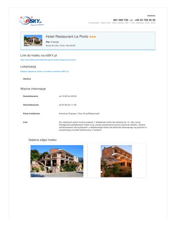 Infolinia 801 080 730 lub +48 32 728 30 30 Poniedziałek - Piątek: 8:00 - 22:00 | Sobota: 9:00 - 17:00 | Niedziela: 12:00 - 20:00 Hotel Restaurant Le Porto Ota, Francja Route de Calvi, Porto, Ota 20150 Link do hotelu na eSKY.pl http://onet.eskyts.pl/hotele/francja/ota-hotel-restaurant-le-porto Lokalizacja Zobacz położenie hotelu na mapie w serwisie eSKY.pl Okolica Ważne informacje Zameldowanie od 15:00 do 22:00 Wymeldowanie od 07:00 do 11:00 Karty kredytowe American Express, Visa, Euro/Mastercard Inne Do niektórych pokoi można wstawić 1 dodatkowe łóżko dla dziecka do 12. roku życia. Dostępność dodatkowych łóżek musi zostać potwierdzona przez personel obiektu. Goście zainteresowani skorzystaniem z dodatkowego łóżka lub łóżeczka dziecięcego są proszeni o wcześniejszy kontakt telefoniczny z hotelem. Galeria zdjęć hotelu Hotele – Bilety lotnicze – Tanie linie lotnicze – Ubezpieczenia Podróżne