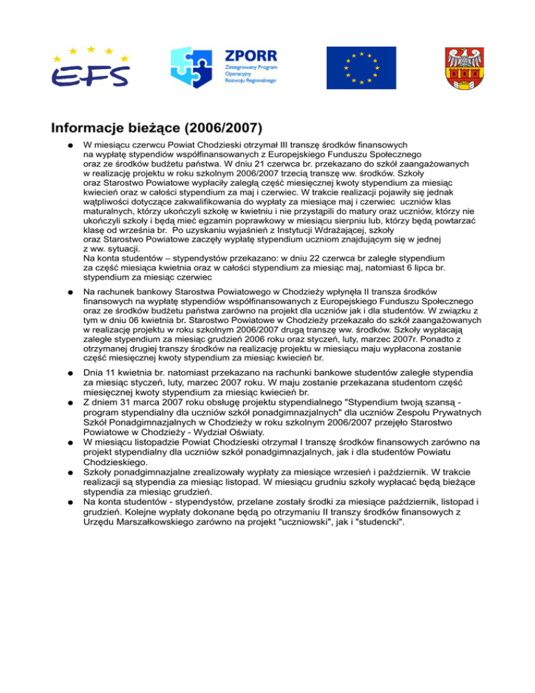Informacje bieżące (2006/2007) ● W miesiącu czerwcu Powiat Chodzieski otrzymał III transzę środków finansowych na wypłatę stypendiów współfinansowanych z Europejskiego Funduszu Społecznego oraz ze środków budżetu państwa. W dniu 21 czerwca br. przekazano do szkół zaangażowanych w realizację projektu w roku szkolnym 2006/2007 trzecią transzę ww. środków. Szkoły oraz Starostwo Powiatowe wypłaciły zaległą część miesięcznej kwoty stypendium za miesiąc kwiecień oraz w całości stypendium za maj i czerwiec. W trakcie realizacji pojawiły się jednak wątpliwości dotyczące zakwalifikowania do wypłaty za miesiące maj i czerwiec uczniów klas maturalnych, którzy ukończyli szkołę w kwietniu i nie przystąpili do matury oraz uczniów, którzy nie ukończyli szkoły i będą mieć egzamin poprawkowy w miesiącu sierpniu lub, którzy będą powtarzać klasę od września br. Po uzyskaniu wyjaśnień z Instytucji Wdrażającej, szkoły oraz Starostwo Powiatowe zaczęły wypłatę stypendium uczniom znajdującym się w jednej z ww. sytuacji. Na konta studentów – stypendystów przekazano: w dniu 22 czerwca br zaległe stypendium za część miesiąca kwietnia oraz w całości stypendium za miesiąc maj, natomiast 6 lipca br. stypendium za miesiąc czerwiec ● Na rachunek bankowy Starostwa Powiatowego w Chodzieży wpłynęła II transza środków finansowych na wypłatę stypendiów współfinansowanych z Europejskiego Funduszu Społecznego oraz ze środków budżetu państwa zarówno na projekt dla uczniów jak i dla studentów. W związku z tym w dniu 06 kwietnia br. Starostwo Powiatowe w Chodzieży przekazało do szkół zaangażowanych w realizację projektu w roku szkolnym 2006/2007 drugą transzę ww. środków. Szkoły wypłacają zaległe stypendium za miesiąc grudzień 2006 roku oraz styczeń, luty, marzec 2007r. Ponadto z otrzymanej drugiej transzy środków na realizację projektu w miesiącu maju wypłacona zostanie część miesięcznej kwoty stypendium za miesiąc kwiecień br. ● Dnia 11 kwietnia br. natomiast przekazano na rachunki bankowe studentów zaległe stypendia za miesiąc styczeń, luty, marzec 2007 roku. W maju zostanie przekazana studentom część miesięcznej kwoty stypendium za miesiąc kwiecień br. Z dniem 31 marca 2007 roku obsługę projektu stypendialnego "Stypendium twoją szansą program stypendialny dla uczniów szkół ponadgimnazjalnych" dla uczniów Zespołu Prywatnych Szkół Ponadgimnazjalnych w Chodzieży w roku szkolnym 2006/2007 przejęło Starostwo Powiatowe w Chodzieży - Wydział Oświaty. W miesiącu listopadzie Powiat Chodzieski otrzymał I transzę środków finansowych zarówno na projekt stypendialny dla uczniów szkół ponadgimnazjalnych, jak i dla studentów Powiatu Chodzieskiego. Szkoły ponadgimnazjalne zrealizowały wypłaty za miesiące wrzesień i październik. W trakcie realizacji są stypendia za miesiąc listopad. W miesiącu grudniu szkoły wypłacać będą bieżące stypendia za miesiąc grudzień. Na konta studentów - stypendystów, przelane zostały środki za miesiące październik, listopad i grudzień. Kolejne wypłaty dokonane będą po otrzymaniu II transzy środków finansowych z Urzędu Marszałkowskiego zarówno na projekt "uczniowski", jak i "studencki". ● ● ● ●