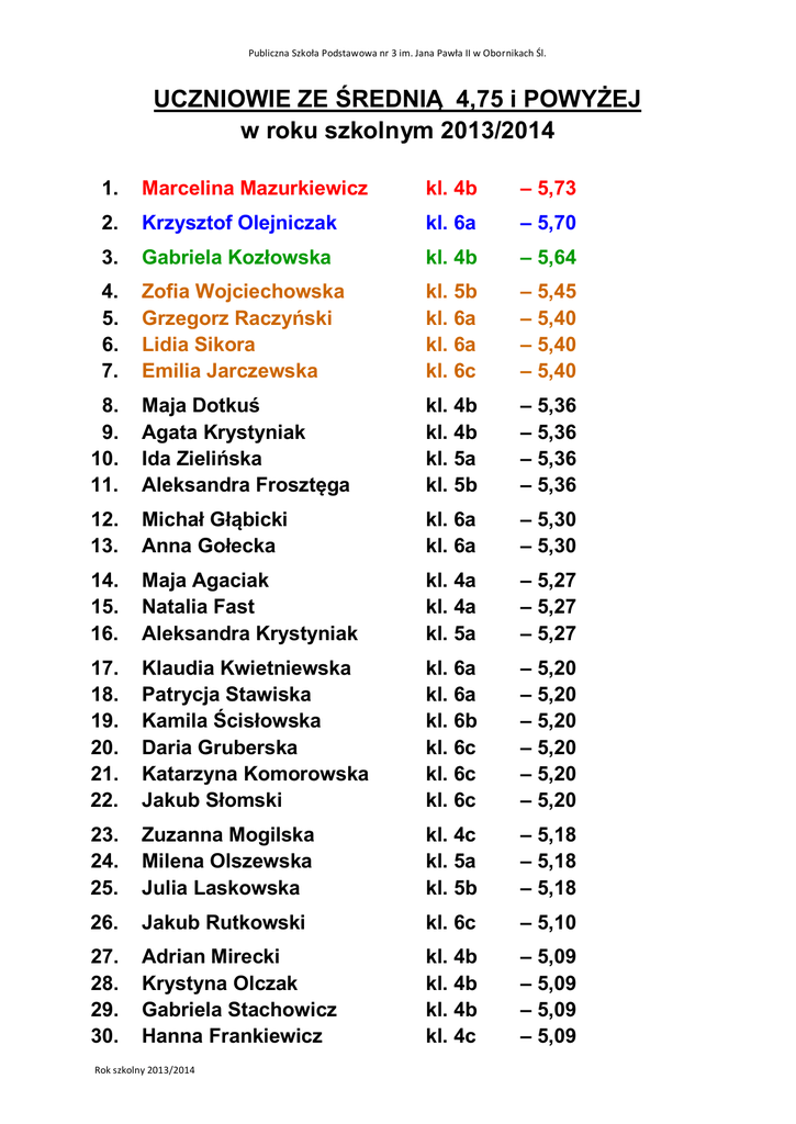 UCZNIOWIE ZE ŚREDNIĄ 4,75 i POWYŻEJ w roku szkolnym 2013