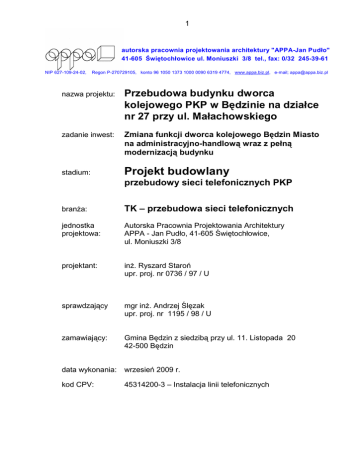 1 autorska pracownia projektowania architektury "APPA-Jan Pudło" 41-605 Świętochłowice ul. Moniuszki 3/8 tel., fax: 0/32 245-39-61 NIP 627-109-24-02, Regon P-270729105, konto 96 1050 1373 1000 0090 6319 4774, www.appa.biz.pl, e-mail; [email protected] nazwa projektu: Przebudowa budynku dworca kolejowego PKP w Będzinie na działce nr 27 przy ul. Małachowskiego zadanie inwest: Zmiana funkcji dworca kolejowego Będzin Miasto na administracyjno-handlową wraz z pełną modernizacją budynku stadium: Projekt budowlany przebudowy sieci telefonicznych PKP branŜa: TK – przebudowa sieci telefonicznych jednostka projektowa: Autorska Pracownia Projektowania Architektury APPA - Jan Pudło, 41-605 Świętochłowice, ul. Moniuszki 3/8 projektant: inŜ. Ryszard Staroń upr. proj. nr 0736 / 97 / U sprawdzający mgr inŜ. Andrzej Ślęzak upr. proj. nr 1195 / 98 / U zamawiający: Gmina Będzin z siedzibą przy ul. 11. Listopada 20 42-500 Będzin data wykonania: wrzesień 2009 r. kod CPV: 45314200-3 – Instalacja linii telefonicznych Przebudowa budynku dworca PKP w Będzinie przy ul. Małachowskiego w ramach zadania inwestycyjnego „Zmiana funkcji dworca kolejowego Będzin Miasto na administracyjno-handlową wraz z pełną modernizacją budynku Opis techn. str.1 Projekt budowlany przebudowy sieci TK SPIS TREŚCI OPISU TECHNICZNEGO 1. PRZEDMIOT OPRACOWANIA 2. INWESTOR 3. DANE OGÓLNE 3.1. Przedmiot i cel opracowania 3.2. Podstawa opracowania 3.3. Zakres opracowania 4. OPIS TECHNICZNY 4.1. Stan istniejący 4.2. Stan projektowany 4.3. Pomiary kabli TKD 5. UWAGI REALIZACYJNE i OGÓLNE 6. PRZEPISY I NORMY 7. INFORMACJE DOTYCZĄCE BEZPIECZEŃSTWA I OCHRONY ZDROWIA 7.1. Zakres robót zamierzenia budowlanego i kolejność realizacji obiektów 7.2. Elementy zagospodarowania działki stanowiące zagroŜenie bezpieczeństwa i zdrowia 7.3. Przewidywane zagroŜenia 7.4. InstruktaŜ pracowników 7.5. Środki techniczne i organizacyjne 8. ZAŁĄCZNIKI 9. KOSZTORYS Przebudowa budynku dworca PKP w Będzinie przy ul. Małachowskiego w ramach zadania inwestycyjnego „Zmiana funkcji dworca kolejowego Będzin Miasto na administracyjno-handlową wraz z pełną modernizacją budynku Opis techn. str.2 Projekt budowlany przebudowy sieci TK 1. PRZEDMIOT OPRACOWANIA Przedmiotem opracowania są urządzenia teletechniczne własności TK Telekom w rejonie przystanku osobowego Będzin Miasto przy ul. Sienkiewicza w Będzinie. 2. INWESTOR Inwestorem planowanych robót jest Urząd Miejski w Będzinie. 3. DANE OGÓLNE 3. 1. Przedmiot i cel opracowania Celem opracowania jest określenie zakresu rzeczowego i kosztowego przebudowa urządzeń telekomunikacyjnych własności TK Telekom posadowionych w sąsiedztwie linii PKP nr 001 Warszawa - Katowice na przystanku osobowym Będzin Miasto. Przedmiotem dokumentacji jest więc przebudowa urządzeń infrastruktury kolejowej w terenie na którym planowana jest budowa parkingu i chodnika. 3.2. Podstawa opracowania Podstawę opracowania niniejszej dokumentacji stanowią : 3.3. - umowa nr ZP.34221-47/08 z dnia 12.11.2008 r.; - zaktualizowana mapa zasadnicza w skali 1:1000; - plan zagospodarowania terenu - budowa parkingu i chodnika; - notatka słuŜbowa, która jest dołączona do projektu; - dane inwentaryzacyjne zebrane w czasie wizji lokalnej w terenie. Zakres opracowania Przedmiotowe opracowanie przebudowy urządzeń telekomunikacyjnych własności TK Telekom obejmuje tylko i wyłącznie utrzymanie dostępu oraz zabezpieczenie pierwotnych parametrów kabli i urządzeń telekomunikacyjnych w obszarze objętym dokumentacją. Przebudowa budynku dworca PKP w Będzinie przy ul. Małachowskiego w ramach zadania inwestycyjnego „Zmiana funkcji dworca kolejowego Będzin Miasto na administracyjno-handlową wraz z pełną modernizacją budynku Opis techn. str.3 Projekt budowlany przebudowy sieci TK 4. Opis techniczny 4.1. Stan istniejący. Aktualnie wzdłuŜ linii kolejowej nr 001 Warszawa - Katowice na szlaku Dąbrowa Górnicza – Będzin w obrębie przystanku osobowego Będzin Miasto przy ul. Sienkiewicza ułoŜone są dwa magistralne kable teletechniczne : typu TKDFtA 78x2 relacji Katowice - Częstochowa oraz TKD 28x2 Katowice - Zawiercie. Naprzeciw budynku stacyjnego w km 304,355 usytuowane są złącza odgałęźne wraz z odgałęzieniami kablowymi do budynku stacyjnego. Odgałęzienia wykonane są z obu kabli. W kablach tych przebiegają telefoniczne łącza zapowiadacze, blokady liniowej srk oraz sterowania odłącznikami trakcyjnymi na podstacjach trakcyjnych i w kabinach sekcyjnych, których uszkodzenie spowoduje zagroŜenie bezpieczeństwa prowadzenia ruchu pociągów na szlaku kolejowym. Ponadto w kablach tych realizowane są łącza: telefoniczne, internetowe, transmisji danych o duŜych przepływnościach oraz informacyjne do klientów TK Telekom, których uszkodzenie spowodowałoby znaczne straty, a tym samym groziłoby powaŜnymi konsekwencjami finansowymi i prawnymi. Planowana budowa parkingu oraz krawęŜnika w miejscu ich przebiegu moŜe spowodować ich uszkodzenie, a tym samym utratę podstawowych parametrów technicznych w trakcie prowadzenia robót ziemnych oraz skutecznie uniemoŜliwi łatwy i szybki dostęp do tych kabli w przypadku konieczności lokalizacji bądź usuwania awarii ( zaniŜenie izolacji kabli, utrata parametrów transmisyjnych transmisyjnych t.j. zwiększona tłumienność, zwiększony poziom przesłuchów ). W związku z powyŜszym zachodzi konieczność przebudowy tych kabli na kolizyjnym odcinku - objętym planowaną budową parkingu. Zakres przebudowy kabli pokazano na planie sytuacyjnym – rys. nr TK1 ( załącznik nr 8.5. ). 4.2. Stan projektowany. Dla utrzymania pierwotnego stanu i parametrów kabli konieczne jest wykonanie kanalizacji teletechnicznej 3-otworowej w miejscu budowy parkingu. Trasa przebiegu kanalizacji kablowej będzie przebiegać bezpośrednio przy trasie kabli od Przebudowa budynku dworca PKP w Będzinie przy ul. Małachowskiego w