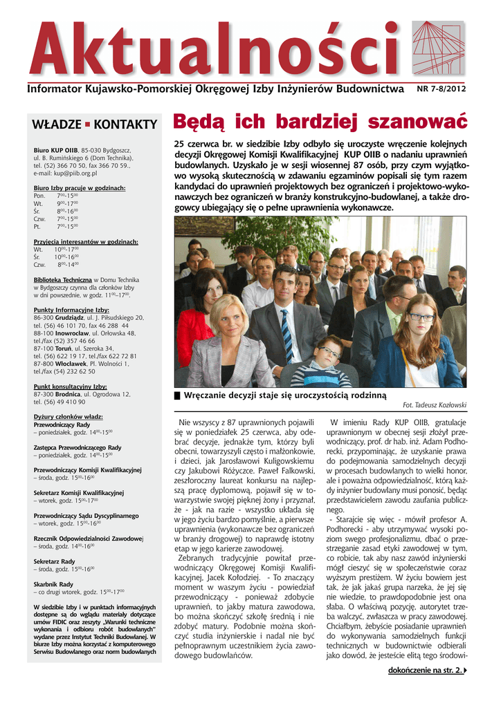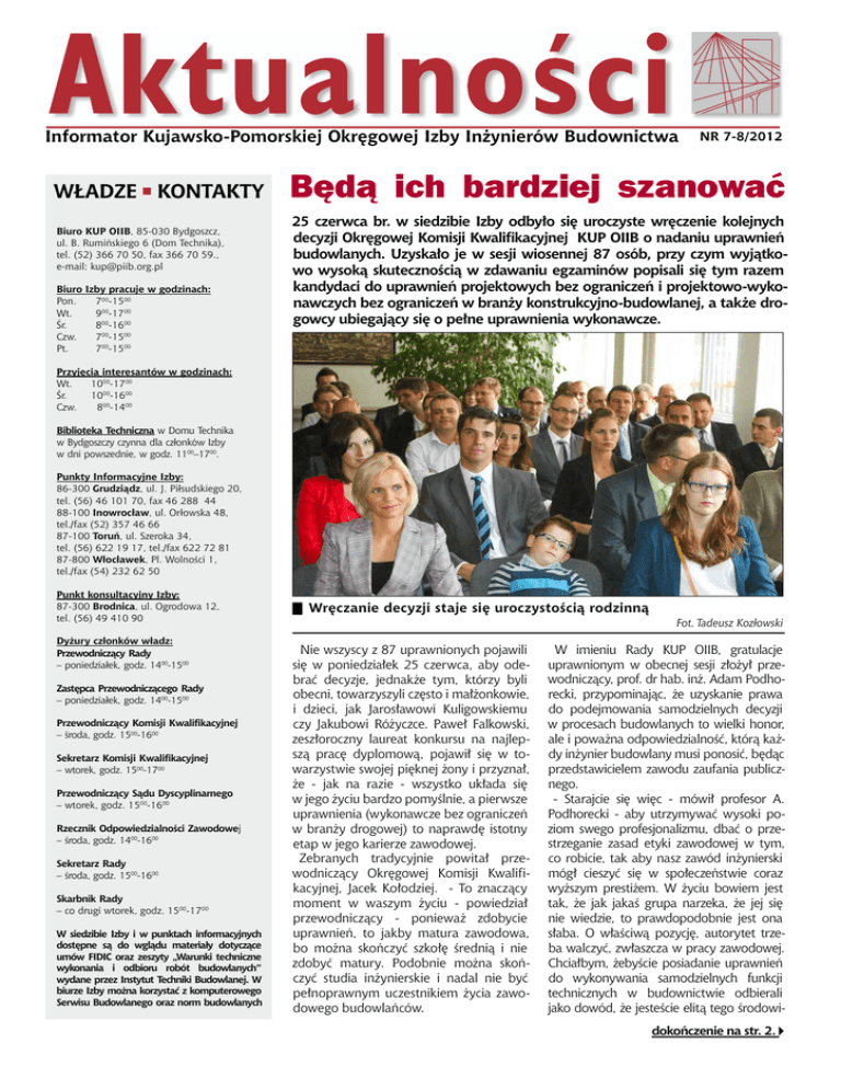 Informator Kujawsko-Pomorskiej Okręgowej Izby Inżynierów Budownictwa WŁADZE KONTAKTY Biuro KUP OIIB, 85-030 Bydgoszcz, ul. B. Rumińskiego 6 (Dom Technika), tel. (52) 366 70 50, fax 366 70 59., e-mail: [email protected] Biuro Izby pracuje w godzinach: Pon. 700-1500 Wt. 900-1700 Śr. 800-1600 Czw. 700-1500 Pt. 700-1500 NR 7-8/2012 Będą ich bardziej szanować 25 czerwca br. w siedzibie Izby odbyło się uroczyste wręczenie kolejnych decyzji Okręgowej Komisji Kwalifikacyjnej KUP OIIB o nadaniu uprawnień budowlanych. Uzyskało je w sesji wiosennej 87 osób, przy czym wyjątkowo wysoką skutecznością w zdawaniu egzaminów popisali się tym razem kandydaci do uprawnień projektowych bez ograniczeń i projektowo-wykonawczych bez ograniczeń w branży konstrukcyjno-budowlanej, a także drogowcy ubiegający się o pełne uprawnienia wykonawcze. Przyjęcia interesantów w godzinach: Wt. 1000-1700 Śr. 1000-1600 Czw. 800-1400 Biblioteka Techniczna w Domu Technika w Bydgoszczy czynna dla członków Izby w dni powszednie, w godz. 1100–1700. Punkty Informacyjne Izby: 86-300 Grudziądz, ul. J. Piłsudskiego 20, tel. (56) 46 101 70, fax 46 288 44 88-100 Inowrocław, ul. Orłowska 48, tel./fax (52) 357 46 66 87-100 Toruń, ul. Szeroka 34, tel. (56) 622 19 17, tel./fax 622 72 81 87-800 Włocławek, Pl. Wolności 1, tel./fax (54) 232 62 50 Punkt konsultacyjny Izby: 87-300 Brodnica, ul. Ogrodowa 12, tel. (56) 49 410 90 Dyżury członków władz: Przewodniczący Rady – poniedziałek, godz. 1400-1500 Zastępca Przewodniczącego Rady – poniedziałek, godz. 1400-1500 Przewodniczący Komisji Kwalifikacyjnej – środa, godz. 1500-1600 Sekretarz Komisji Kwalifikacyjnej – wtorek, godz. 1500-1700 Przewodniczący Sądu Dyscyplinarnego – wtorek, godz. 1500-1600 Rzecznik Odpowiedzialności Zawodowej – środa, godz. 1400-1600 Sekretarz Rady – środa, godz. 1500-1600 Skarbnik Rady – co drugi wtorek, godz. 1500-1700 W siedzibie Izby i w punktach informacyjnych dostępne są do wglądu materiały dotyczące umów FIDIC oraz zeszyty „Warunki techniczne wykonania i odbioru robót budowlanych” wydane przez Instytut Techniki Budowlanej. W biurze Izby można korzystać z komputerowego Serwisu Budowlanego oraz norm budowlanych Wręczanie decyzji staje się uroczystością rodzinną Fot. Tadeusz Kozłowski Nie wszyscy z 87 uprawnionych pojawili się w poniedziałek 25 czerwca, aby odebrać decyzje, jednakże tym, którzy byli obecni, towarzyszyli często i małżonkowie, i dzieci, jak Jarosławowi Kuligowskiemu czy Jakubowi Różyczce. Paweł Falkowski, zeszłoroczny laureat konkursu na najlepszą pracę dyplomową, pojawił się w towarzystwie swojej pięknej żony i przyznał, że - jak na razie - wszystko układa się w jego życiu bardzo pomyślnie, a pierwsze uprawnienia (wykonawcze bez ograniczeń w branży drogowej) to naprawdę istotny etap w jego karierze zawodowej. Zebranych tradycyjnie powitał przewodniczący Okręgowej Komisji Kwalifikacyjnej, Jacek Kołodziej. - To znaczący moment w waszym życiu - powiedział przewodniczący - ponieważ zdobycie uprawnień, to jakby matura zawodowa, bo można skończyć szkołę średnią i nie zdobyć matury. Podobnie można skończyć studia inżynierskie i nadal nie być pełnoprawnym uczestnikiem życia zawodowego budowlańców. W imieniu Rady KUP OIIB, gratulacje uprawnionym w obecnej sesji złożył przewodniczący, prof. dr hab. inż. Adam Podhorecki, przypominając, że uzyskanie prawa do podejmowania samodzielnych decyzji w procesach budowlanych to wielki honor, ale i poważna odpowiedzialność, którą każdy inżynier budowlany musi ponosić, będąc przedstawicielem zawodu zaufania publicznego. - Starajcie się więc - mówił profesor A. Podhorecki - aby utrzymywać wysoki poziom swego profesjonalizmu, dbać o przestrzeganie zasad etyki zawodowej w tym, co robicie, tak aby nasz zawód inżynierski mógł cieszyć się w społeczeństwie coraz wyższym prestiżem. W życiu bowiem jest tak, że jak jakaś grupa narzeka, że jej się nie wiedzie, to prawdopodobnie jest ona słaba. O właściwą pozycję, autorytet trzeba walczyć, zwłaszcza w pracy zawodowej. Chciałbym, żebyście posiadanie uprawnień do wykonywania samodzielnych funkcji technicznych w budownictwie odbierali jako dowód, że jesteście elitą tego środowidokończenie na str. 2. Informator Kujawsko-Pomorskiej Okręgowej Izby Inżynierów Budownictwa lipiec/sierpień 2012 dokończenie ze str. 1. ska. Skoro jednak jesteście już w tej elicie, to warto pamiętać, że studia niczego de facto nie zaczynają i niczego nie kończą. Są tylko jednym z etapów waszej drogi zawodowej, co oznacza, że musicie ciągle wzbogacać swoją wiedzę i doświadczenie w procesach budowlanych, aby zawsze być na bieżąco. Wielu z Was przekonało się, że egzamin na uprawnienia nie jest tak trudny dla kogoś, kto właśnie z wiedzą budowlaną był na bieżąco. Wyniki pokazują, że zdecydowana większość z Was w trakcie egzaminów to udowodniła, z czego należy się cieszyć. Udowodniliście, że dysponujecie odpowiednią do czekających Was zadań dynamiką w myśleniu i działaniu. Profesor A. Podhorecki przypomniał też, że sześcioro z egzaminowanych, którzy uzyskali w czasie sesji najwyższe noty od egzaminatorów, będzie uczestniczyło w plenarnym posiedzeniu Rady Izby, w charakterze obserwatorów. To nowa forma wyróżnienia tych najlepszych w czasie sesji egzaminacyjnej i nowy sposób na zainteresowanie młodych członków Izby bieżącymi jej działaniami i problemami całego środowiska. Być może w przyszłości będą chcieli włączyć się w prace organów statutowych naszej organizacji. Tę wyróżnioną szóstkę stanowią: Jolanta Nowak (specjalność drogowa), Agata Pawlikowska (specjalność instalacyjna sanitarna), Małgorzata Przybylska (specjalność konstrukcyjno-budowlana), Jacek Płaczyński (specjalność instalacyjna elektryczna), Szymon Staszak (sp