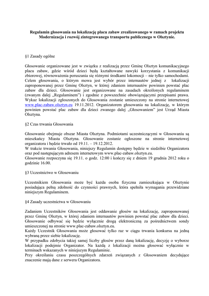 Regulamin głosowania na lokalizację placu zabaw zrealizowanego w ramach projektu Modernizacja i rozwój zintegrowanego transportu publicznego w Olsztynie. §1 Zasady ogólne Głosowanie organizowane jest w związku z realizacją przez Gminę Olsztyn komunikacyjnego placu zabaw, gdzie wśród dzieci będą kształtowane nawyki korzystania z komunikacji zbiorowej, równoważenia poruszania się różnymi środkami lokomocji – nie tylko samochodami. Celem głosowania, o którym mowa jest wybór przez internautów jednej z lokalizacji zaproponowanej przez Gminę Olsztyn, w której zdaniem internautów powinien powstać plac zabaw dla dzieci. Głosowanie jest organizowane na zasadach określonych regulaminem (zwanym dalej „Regulaminem”) i zgodnie z powszechnie obowiązującymi przepisami prawa. Wykaz lokalizacji zgłoszonych do Głosowania zostanie umieszczony na stronie internetowej www.plac-zabaw.olsztyn.eu 19.11.2012. Organizatorem głosowania na lokalizację, w którym powinien powstać plac zabaw dla dzieci zwanego dalej „Głosowaniem” jest Urząd Miasta Olsztyna. §2 Czas trwania Głosowania Głosowanie obejmuje obszar Miasta Olsztyna. Podmiotami uczestniczącymi w Głosowaniu są mieszkańcy Miasta Olsztyna. Głosowanie zostanie ogłoszone na stronie internetowej organizatora i będzie trwało od 19.11. – 19.12.2012. W trakcie trwania Głosowania, niniejszy Regulamin dostępny będzie w siedzibie Organizatora oraz pod następującym adresem internetowym www.plac-zabaw.olsztyn.eu. Glosowanie rozpoczyna się 19.11. o godz. 12:00 i kończy się z dniem 19 grudnia 2012 roku o godzinie 16.00. §3 Uczestnictwo w Głosowaniu Uczestnikiem Głosowania może być każda osoba fizyczna zamieszkująca w Olsztynie posiadająca pełną zdolność do czynności prawnych, która spełniła wymagania przewidziane niniejszym Regulaminem. §4 Zasady uczestnictwa w Głosowaniu Zadaniem Uczestników Głosowania jest oddawanie głosów na lokalizację, zaproponowanej przez Gminę Olsztyn, w której zdaniem internautów powinien powstać plac zabaw dla dzieci. Głosowanie odbywać się będzie wyłącznie drogą elektroniczną za pośrednictwem sondy umieszczonej na stronie www.plac-zabaw.olsztyn.eu. Każdy Uczestnik Głosowania może głosować tylko raz w ciągu trwania konkursu na jedną wybraną przez siebie lokalizację. W przypadku zdobycia takiej samej liczby głosów przez daną lokalizację, decyzję o wyborze lokalizacji podejmie Organizator. Na każdą z lokalizacji można głosować wyłącznie w terminach wskazanych w niniejszym Regulaminie. Przy określaniu czasu poszczególnych zdarzeń związanych z Głosowaniem decydujące znaczenie mają dane z serwera Organizatora. §5 Ogłoszenie wyników Informacja o lokalizacji, która zdobyła największą liczbę głosów zostanie umieszczona na stronie internetowej www.olsztyn.eu w terminie do 21 grudnia 2012: Organizator na warunkach wskazanych w Regulaminie poinformuje o powyższym na stronie internetowej www.olsztyn.eu. Efektem konkursu i głosowania będzie wyłonienie lokalizacji, w której zrealizowany będzie komunikacyjny plac zabaw dla dzieci. §6 Reklamacje Uczestnik Głosowania może informować Organizatora o wszelkich nieprawidłowościach związanych z Glosowaniem za pośrednictwem poczty elektronicznej wysyłając informację na następujący adres e-mail: [email protected]. §8 Postanowienia końcowe Uczestnictwo w Głosowaniu oznacza wyrażenie zgody na warunki niniejszego Regulaminu. Jednocześnie uczestnictwo w Głosowaniu nie powoduje powstania po stronie Uczestnika Głosowania jakichkolwiek roszczeń względem Organizatora lub Fundatora Nagród. Naruszenie jakiegokolwiek postanowienia niniejszego Regulaminu przez Uczestnika Głosowania wyklucza go z Głosowania. W przypadku stwierdzenia przez Organizatora Konkursu wystąpienia okoliczności uprawdopodabniających naruszenie postanowień niniejszego Regulaminu, w tym zasad głosowania, Organizatorowi przysługuje prawo do wykluczenia takiego Uczestnika Głosowania z Głosowania, w tym prawo do unieważnienia oddanych przez niego głosów w ramach Głosowania. Organizator nie ponosi odpowiedzialności za działania osób trzecich, uniemożliwiające wzięcie udziału w Głosowaniu. Organizator nie ponosi odpowiedzialności za ewentualne problemy techniczne, mające wpływ na wypełnienie warunków uczestnictwa w Głosowaniu.. Organizator nie ponosi odpowiedzialności za nieprawidłowości związane z działaniem dostawców usług internetowych. Organizator zastrzega sobie prawo dokonywania zmian w niniejszym Regulaminie nienaruszających podstawowych zasad Głosowania w każdym momencie trwania Glosowania. Głosowanie prowadzone na podstawie niniejszego Regulaminu nie jest grą losową, loterią fantową, zakładem wzajemnym ani loterią promocyjną, których wynik zależy od przypadku w rozumieniu art. 2 ustawy z dnia 19 listopada 2009 roku o grach hazardowych (Dz.U. z 2009 nr 201 poz. 1540).