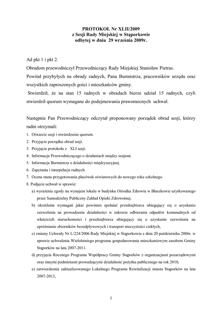 PROTOKOŁ Nr XLII/2009 z Sesji Rady Miejskiej w Stąporkowie odbytej w dniu 29 września 2009r. Ad pkt 1 i pkt 2. Obradom przewodniczył Przewodniczący Rady Miejskiej Stanisław Pietras. Powitał przybyłych na obrady radnych, Pana Burmistrza, pracowników urzędu oraz wszystkich zaproszonych gości i mieszkańców gminy. Stwierdził, że na stan 15 radnych w obradach bierze udział 15 radnych, czyli stwierdził quorum wymagane do podejmowania prawomocnych uchwał. Następnie Pan Przewodniczący odczytał proponowany porządek obrad sesji, którzy radni otrzymali: 1. Otwarcie sesji i stwierdzenie quorum. 2. Przyjęcie porządku obrad sesji. 3. Przyjęcie protokołu z XLI sesji. 4. Informacja Przewodniczącego o działaniach między sesjami. 5. Informacja Burmistrza o działalności międzysesyjnej. 6. Zapytania i interpelacje radnych. 7. Ocena stanu przygotowania placówek oświatowych do nowego roku szkolnego. 8. Podjęcie uchwał w sprawie: a) wyrażenia zgody na wynajem lokalu w budynku Ośrodka Zdrowia w Błaszkowie użytkowanego przez Samodzielny Publiczny Zakład Opieki Zdrowotnej. b) określenia wymagań jakie powinien spełniać przedsiębiorca ubiegający się o uzyskanie zezwolenia na prowadzenie działalności w zakresie odbierania odpadów komunalnych od właścicieli nieruchomości i przedsiębiorca ubiegający się o uzyskanie zezwolenia na opróżnianie zbiorników bezodpływowych i transport nieczystości ciekłych, c) zmiany Uchwały Nr L/224/2006 Rady Miejskiej w Stąporkowie z dnia 20 października 2006r. w sprawie uchwalenia Wieloletniego programu gospodarowania mieszkaniowym zasobem Gminy Stąporków na lata 2007-2011. d) przyjęcia Rocznego Programu Współpracy Gminy Stąporków z organizacjami pozarządowymi oraz innymi podmiotami prowadzącymi działalność pożytku publicznego na rok 2010, e) zatwierdzenia zaktualizowanego Lokalnego Programu Rewitalizacji miasta Stąporków na lata 2007-2013, 1 f) wyrażenia zgody na wspólne ubieganie się o środki finansowe w ramach porozumienia samorządowego gmin g) zabezpieczenia środków finansowych na przygotowanie i realizację zadania planowanego do współfinansowania w ramach „Narodowego Programu Przebudowy Dróg Lokalnych 20082011”. h) uchylenia uchwały Nr XL/231/2009 Rady Miejskiej w Stąporkowie z dnia 5 sierpnia 2009r. w sprawie zmian w budżecie Gminy Stąporków na 2009r. i) uchylenia uchwały Nr XL/233/2009 Rady Miejskiej w Stąporkowie z dnia 5 sierpnia 2009r. w sprawie zmian w budżecie Gminy Stąporków na 2009r. j) uchylenia uchwały Nr XL/234/2009 Rady Miejskiej w Stąporkowie z dnia 5 sierpnia 2009r. w sprawie zmian w budżecie Gminy Stąporków na 2009r. k) zmian w budżecie Gminy Stąporków na 2009r. l) zmian w budżecie Gminy Stąporków na 2009r. ł) udzielenia pomocy finansowej Powiatowi Koneckiemu na realizację zadania bieżącego pn. „ Wykonanie remontów na dwóch odcinkach dróg powiatowych na terenie Gminy Stąporków”, m) zmian w budżecie Gminy Stąporków na 2009r. n) zmian w budżecie Gminy Stąporków na 2009r. o) zmian w budżecie Gminy Stąporków na 2009r. p) emisji obligacji Miasta i Gminy Stąporków oraz zasad ich zbywania, nabywania i wykupu, r) zmian w budżecie Gminy Stąporków na 2009r. s) zmian w budżecie Gminy Stąporków na 2009r. t) zmian w budżecie Gminy Stąporków na 2009r. 9. Odpowiedzi na zapytania i interpelacje radnych. 10. Sprawy różne. 11. Zamknięcie obrad sesji. Pan Przewodniczący spytał, czy są jakieś uwagi bądź propozycje do odczytanego przez niego proponowanego porządku obrad. Radna Agnieszka Jedynak zgłosiła wniosek, aby z porządku obrad wykreślić z punktu 8 podpunkt „c” tj. projekt uchwały w sprawie zmiany Uchwały Nr L/224/2006 Rady Miejskiej w Stąporkowie z dnia 20 października 2006r. w sprawie uchwalenia Wieloletniego programu gospodarowania mieszkaniowym zasobem Gminy Stąporków na lata 2007-2011. Poinformowała, że mieszkańcy lokali z Błaszkowa 1/2 otrzymali proponowane umowy od Pani Dyrektor SP ZOZ które dla nich są niejasne. Sytuacja ich jest zupełnie 2 inna niż mieszkańców lokali z Odrowąża i Niekłania. Dlatego też złożyli oni wniosek o wykup tych mieszkań. Otrzymali odpowiedź, że Rada Miejska w Stąporkowie w dniu 31 sierpnia 2009r. podjęła uchwałę w sprawie przekazania nieruchomości lokalowych stanowiących własność gminy na rzecz SP ZOZ w Stąporkowie. W związku z tym prosi o odpowiedź, czy w dalszym ciągu jest możliwość wykupu tych mieszkań przez zamieszkujących tam lokatorów i w jakiej sytuacji pozostają mieszkańcy . Pani Naczelnik Nowakowska wyjaśniła, że w momencie kiedy Pani Dyrektor da im nakaz opuszczenia mieszkań ponieważ będzie je chciała wykorzystać do innych celów oni zostają wyrzuceni na bruk. W przypadku gdyby były to rodziny patologiczne wówczas należałyby im się mieszkania zastępcze w przeciwnym wypadku nie. We wstępnej umowie nie ma żadnych zabezpieczeń dla tych lokatorów. Dlatego uważa, że radni nie muszą podejmować tej uchwały ponieważ nie gonią ich żadne terminy. Pan Przewodniczący wyjaśnił, że uchwała została podjęta, żeby ustalić jednego zarządcę dla budynków ośrodków zdrowia i mieszkań lokatorskich. Mieszkania były pod zarządem ZGKiM, a ośrodki SP ZOZ. W przeciwnym wypadku gminie groziły kary. Uchwała ta została dlatego podjęta. Jeśli projekt umowy z lokatorami jest wadliwy to należy go przedyskutować. Pan Burmistrz w uzupełnieniu stwierdził, że uchwałą z dnia 31 sierpnia budynki zostały oddane w zarząd SP ZOZ. Obliguje nas do tego prawo budowlane. Pani Dyrektor SP ZOZ musi zawrzeć z lokatorami umowy najmu. Propozycja umowy została przedstawiona do dyskusji i nie rozumie emocji związanych z tą sprawą. Nikt jeszcze żadnej umowy nie podpisał, nikt nikogo nie sprzedał z mieszkaniami. Dyskusja na ten temat jest jałowa. Pan Przewodniczący uzupełnił, że jeżeli Pani Dyrektor będzie chci