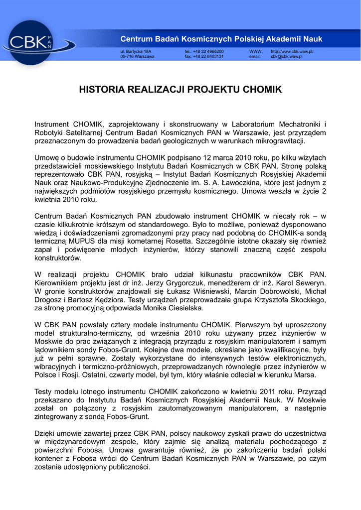 Centrum Badań Kosmicznych Polskiej Akademii Nauk ul. Bartycka 18A 00-716 Warszawa tel.: +48 22 4966200 fax: +48 22 8403131 WWW: email: http://www.cbk.waw.pl/ [email protected] HISTORIA REALIZACJI PROJEKTU CHOMIK Instrument CHOMIK, zaprojektowany i skonstruowany w Laboratorium Mechatroniki i Robotyki Satelitarnej Centrum Badań Kosmicznych PAN w Warszawie, jest przyrządem przeznaczonym do prowadzenia badań geologicznych w warunkach mikrograwitacji. Umowę o budowie instrumentu CHOMIK podpisano 12 marca 2010 roku, po kilku wizytach przedstawicieli moskiewskiego Instytutu Badań Kosmicznych w CBK PAN. Stronę polską reprezentowało CBK PAN, rosyjską – Instytut Badań Kosmicznych Rosyjskiej Akademii Nauk oraz Naukowo-Produkcyjne Zjednoczenie im. S. A. Ławoczkina, które jest jednym z największych podmiotów rosyjskiego przemysłu kosmicznego. Umowa weszła w życie 2 kwietnia 2010 roku. Centrum Badań Kosmicznych PAN zbudowało instrument CHOMIK w niecały rok – w czasie kilkukrotnie krótszym od standardowego. Było to możliwe, ponieważ dysponowano wiedzą i doświadczeniami zgromadzonymi przy pracy nad podobną do CHOMIK-a sondą termiczną MUPUS dla misji kometarnej Rosetta. Szczególnie istotne okazały się również zapał i poświęcenie młodych inżynierów, którzy stanowili znaczną część zespołu konstruktorów. W realizacji projektu CHOMIK brało udział kilkunastu pracowników CBK PAN. Kierownikiem projektu jest dr inż. Jerzy Grygorczuk, menedżerem dr inż. Karol Seweryn. W gronie konstruktorów znajdowali się Łukasz Wiśniewski, Marcin Dobrowolski, Michał Drogosz i Bartosz Kędziora. Testy urządzeń przeprowadzała grupa Krzysztofa Skockiego, za stronę promocyjną odpowiada Monika Ciesielska. W CBK PAN powstały cztery modele instrumentu CHOMIK. Pierwszym był uproszczony model strukturalno-termiczny, od września 2010 roku używany przez inżynierów w Moskwie do prac związanych z integracją przyrządu z rosyjskim manipulatorem i samym lądownikiem sondy Fobos-Grunt. Kolejne dwa modele, określane jako kwalifikacyjne, były już w pełni sprawne. Zostały wykorzystane do intensywnych testów elektronicznych, wibracyjnych i termiczno-próżniowych, przeprowadzanych równolegle przez inżynierów w Polsce i Rosji. Ostatni, czwarty model, był tym, który właśnie odleciał w kierunku Marsa. Testy modelu lotnego instrumentu CHOMIK zakończono w kwietniu 2011 roku. Przyrząd przekazano do Instytutu Badań Kosmicznych Rosyjskiej Akademii Nauk. W Moskwie został on połączony z rosyjskim zautomatyzowanym manipulatorem, a następnie zintegrowany z sondą Fobos-Grunt. Dzięki umowie zawartej przez CBK PAN, polscy naukowcy zyskali prawo do uczestnictwa w międzynarodowym zespole, który zajmie się analizą materiału pochodzącego z powierzchni Fobosa. Umowa gwarantuje również, że po zakończeniu badań polski kontener z Fobosa wróci do Centrum Badań Kosmicznych PAN w Warszawie, po czym zostanie udostępniony publiczności. Budowę instrumentu CHOMIK sfinansowało Ministerstwo Nauki i Szkolnictwa Wyższego w ramach projektu międzynarodowego niewspółfinansowanego „Instrument 'CHOMIK' misji Phobos Sample Return – badania naukowe i eksploatacyjne”, obejmującego także wykonanie przez CBK PAN kolejnego instrumentu geologicznego większej mocy. Informacja jest częścią pakietu prasowego „Instrument CHOMIK” przygotowanego przez Centrum Badań Kosmicznych PAN.