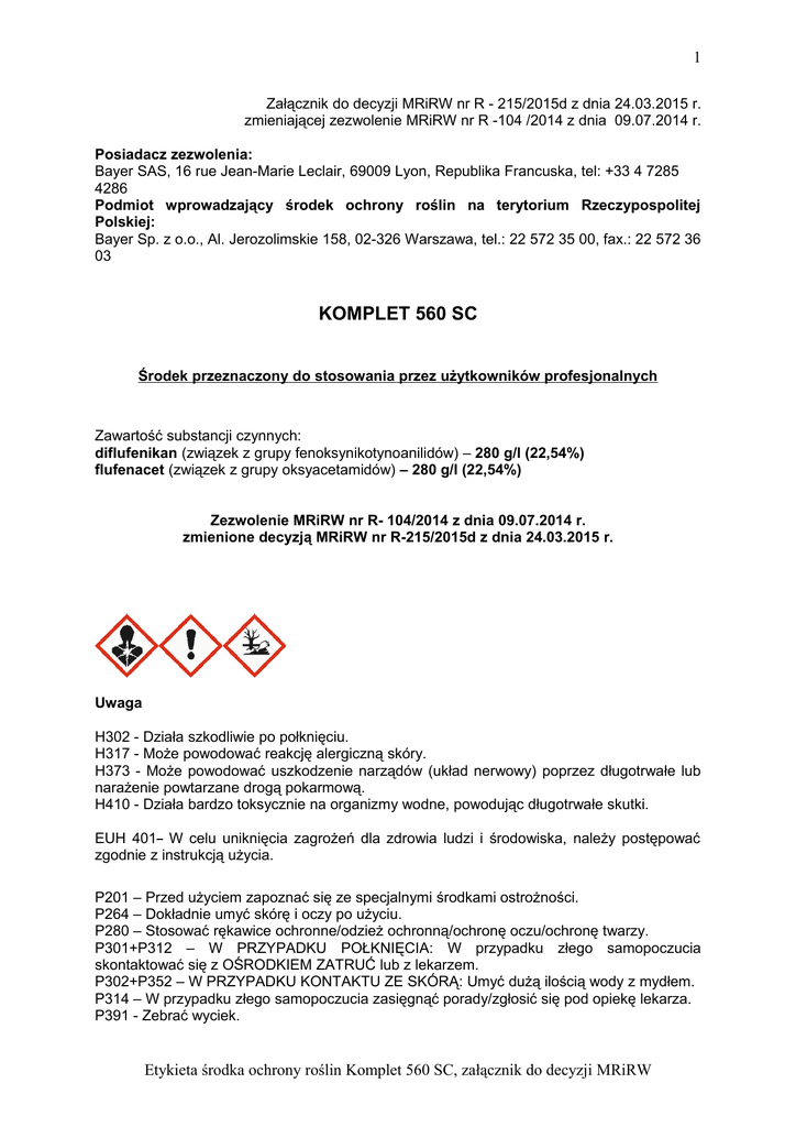 1 Załącznik do decyzji MRiRW nr R - 215/2015d z dnia 24.03.2015 r. zmieniającej zezwolenie MRiRW nr R -104 /2014 z dnia 09.07.2014 r. Posiadacz zezwolenia: Bayer SAS, 16 rue Jean-Marie Leclair, 69009 Lyon, Republika Francuska, tel: +33 4 7285 4286 Podmiot wprowadzający środek ochrony roślin na terytorium Rzeczypospolitej Polskiej: Bayer Sp. z o.o., Al. Jerozolimskie 158, 02-326 Warszawa, tel.: 22 572 35 00, fax.: 22 572 36 03 KOMPLET 560 SC Środek przeznaczony do stosowania przez użytkowników profesjonalnych Zawartość substancji czynnych: diflufenikan (związek z grupy fenoksynikotynoanilidów) – 280 g/l (22,54%) flufenacet (związek z grupy oksyacetamidów) – 280 g/l (22,54%) Zezwolenie MRiRW nr R- 104/2014 z dnia 09.07.2014 r. zmienione decyzją MRiRW nr R-215/2015d z dnia 24.03.2015 r. Uwaga H302 - Działa szkodliwie po połknięciu. H317 - Może powodować reakcję alergiczną skóry. H373 - Może powodować uszkodzenie narządów (układ nerwowy) poprzez długotrwałe lub narażenie powtarzane drogą pokarmową. H410 - Działa bardzo toksycznie na organizmy wodne, powodując długotrwałe skutki. EUH 401 W celu uniknięcia zagrożeń dla zdrowia ludzi i środowiska, należy postępować zgodnie z instrukcją użycia. P201 – Przed użyciem zapoznać się ze specjalnymi środkami ostrożności. P264 – Dokładnie umyć skórę i oczy po użyciu. P280 – Stosować rękawice ochronne/odzież ochronną/ochronę oczu/ochronę twarzy. P301+P312 – W PRZYPADKU POŁKNIĘCIA: W przypadku złego samopoczucia skontaktować się z OŚRODKIEM ZATRUĆ lub z lekarzem. P302+P352 – W PRZYPADKU KONTAKTU ZE SKÓRĄ: Umyć dużą ilością wody z mydłem. P314 – W przypadku złego samopoczucia zasięgnąć porady/zgłosić się pod opiekę lekarza. P391 - Zebrać wyciek. Etykieta środka ochrony roślin Komplet 560 SC, załącznik do decyzji MRiRW 2 OPIS DZIAŁANIA Komplet 560 SC jest środkiem chwastobójczym, koncentratem w formie stężonej zawiesiny do rozcieńczania wodą, stosowanym doglebowo lub nalistnie, przeznaczonym do jesiennego zwalczania miotły zbożowej i chwastów dwuliściennych w zbożach ozimych. Środek zawiera dwie wzajemnie uzupełniające się substancje aktywne o różnym sposobie działania. Diflufenikan pobierany jest przez korzenie kiełkujących chwastów, a zastosowany po wschodach chwastów wchłaniany jest także przez ich liście, natomiast flufenacet pobierany jest głównie przez korzenie i hypokotyl kiełkujących chwastów. Diflufenikan i flufenacet pozostają aktywne w glebie przez wiele tygodni po zabiegu co powoduje utrzymanie wysokiej skuteczności chwastobójczej również w późniejszym okresie. Wysokiej skuteczności środka sprzyja optymalna wilgotność gleby. Najlepszy efekt chwastobójczy uzyskuje się stosując środek we wczesnych fazach rozwojowych chwastów, to jest w czasie kiełkowania lub krótko po ich wschodach, w fazie siewek. Środek przeznaczony do stosowania przy użyciu opryskiwaczy polowych. DZIAŁANIE NA CHWASTY Chwasty wrażliwe np.: chaber bławatek, dymnica pospolita, fiołek polny, gwiazdnica pospolita, jasnota purpurowa, komosa biała, mak polny, maruna bezwonna, miotła zbożowa, niezapominajka polna, poziewnik szorstki, przetacznik perski, przetacznik polny, przetacznik trójlistkowy, przytulia czepna, rdest powojowy, rumian polny, rzodkiew świrzepa, samosiewy rzepaku (jesienne wschody), tasznik pospolity, tobołki polne, wyka kosmata. Chwasty średnio wrażliwe np.: bodziszek drobny, przetacznik bluszczykowy. STOSOWANIE ŚRODKA Pszenica ozima, pszenżyto ozime, jęczmień ozimy, żyto. Termin stosowania: Środek stosować jesienią, jednorazowo w okresie wegetacji roślin, po wschodach zbóż - od fazy szpilkowania do końca wegetacji jesiennej (BBCH 10 - 25). Zabieg wykonać na chwasty znajdujące się we wczesnych fazach rozwojowych, to jest w okresie kiełkowania lub krótko po ich wschodach (w fazie siewek), na dobrze uprawioną (bez grud) glebę. Maksymalna dawka dla jednorazowego zastosowania: 0,5 l/ha Zalecana dawka dla jednorazowego zastosowania: 0,4-0,5 l/ha Wyższą z zalecanych dawek środka stosować na glebach torfowych, czarnoziemach i glebach ciężkich oraz na stanowiskach silnie zachwaszczonych. Łagodna zima wpływa na przyspieszenie rozkładu substancji aktywnych, co skraca okres działania środka wiosną. Zalecana ilość wody: 200-300 l/ha. Zalecane opryskiwanie: średniokropliste Maksymalna liczba zabiegów w sezonie wegetacyjnym: 1 NASTĘPSTWO ROŚLIN Środek rozkłada się w ciągu okresu wegetacji nie stwarzając zagrożenia dla roślin następczych. W przypadku konieczności wcześniejszego zlikwidowania plantacji w wyniku uszkodzenia roślin przez mrozy, szkodniki lub choroby na polu tym, po upływie minimum Etykieta środka ochrony roślin Komplet 560 SC, załącznik do decyzji MRiRW 3 3 miesięcy, wiosną po wykonaniu orki można uprawiać pszenicę jarą, jęczmień jary, ziemniaki, kukurydzę. ŚRODKI OSTROŻNOŚCI PRAKTYKĄ ROLNICZĄ I ZALECENIA STOSOWANIA ZWIĄZANE Z DOBRĄ Zboża wysiewać na jednakową głębokość (3-4 cm) przykrywając ziarno dokładnie ziemią. Na glebach próchniczych i czarnoziemach środek może wykazywać obniżoną skuteczność chwastobójczą. Środka nie stosować: - na rośliny osłabione lub uszkodzone przez choroby, szkodniki, przymrozki lub suszę, - w zbożach z wsiewką roślin motylkowych. Podczas stosowania środka nie dopuścić do: - znoszenia cieczy użytkowej na sąsiednie plantacje roślin uprawnych, - nakładania się cieczy użytkowej na stykach pasów zabiegowych i uwrociach. SPORZĄDZANIE CIECZY UŻYTKOWEJ Przed przystąpieniem do sporządzania cieczy użytkowej dokładnie ustalić potrzebną jej ilość. Zawartością opakowania przed użyciem wstrząsnąć. Odmierzoną ilość środka wlać do zbiornika opryskiwacza napełnionego częściowo wodą (zabiegów uprawowych z włączonym mieszadłem) i uzupełnić wodą do potrze