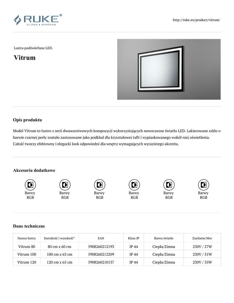 http://ruke.eu/product/vitrum/ Lustra podświetlane LED. Vitrum Opis produktu Model Vitrum to lustro z serii dwuwarstwowych kompozycji wykorzystujących nowoczesne światło LED. Lakierowane szkło o barwie czarnej perły zostało zastosowane jako podkład dla kryształowej tafli i wypiaskowanego wokół niej oświetlenia. Całość tworzy efektowny i elegacki look odpowiedni dla wnętrz wymagających wyrazistego akcentu. Akcesoria dodatkowe Barwy RGB Barwy RGB Barwy RGB Barwy RGB Barwy RGB Barwy RGB Dane techniczne Nazwa lustra Szerokość i wysokość* EAN Klasa IP Barwa światła Zasilanie/Moc Vitrum 80 80 cm x 60 cm 5908260212193 IP 44 Ciepła/Zimna 230V / 27W Vitrum 100 100 cm x 63 cm 5908260212209 IP 44 Ciepła/Zimna 230V / 31W Vitrum 120 120 cm x 65 cm 5908260210137 IP 44 Ciepła/Zimna 230V / 35W *Istnieje możliwość wykonania lustra na dowolny wymiar.