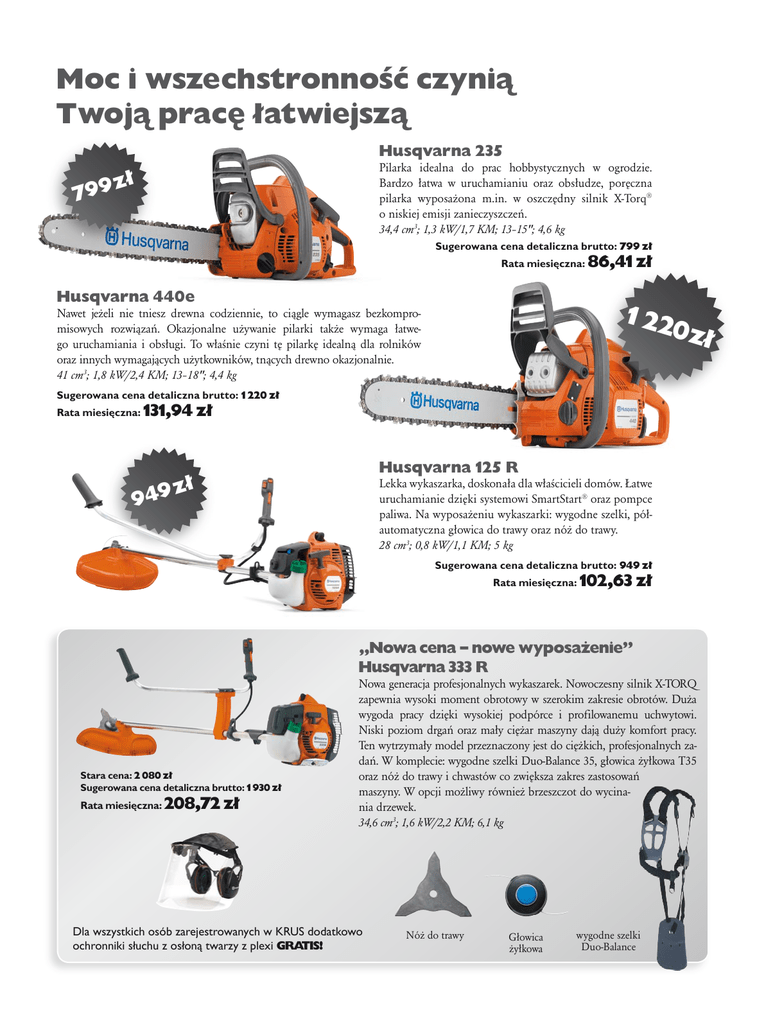 Moc i wszechstronność czynią Twoją pracę łatwiejszą Husqvarna 235 Pilarka idealna do prac hobbystycznych w ogrodzie. Bardzo łatwa w uruchamianiu oraz obsłudze, poręczna pilarka wyposażona m.in. w oszczędny silnik X-Torq® o niskiej emisji zanieczyszczeń. 34,4 cm3; 1,3 kW/1,7 KM; 13–15"; 4,6 kg zł 799 Sugerowana cena detaliczna brutto: 799 zł Rata miesięczna: Husqvarna 440e 86,41 zł 1 22 0 zł Nawet jeżeli nie tniesz drewna codziennie, to ciągle wymagasz bezkompromisowych rozwiązań. Okazjonalne używanie pilarki także wymaga łatwego uruchamiania i obsługi. To właśnie czyni tę pilarkę idealną dla rolników oraz innych wymagających użytkowników, tnących drewno okazjonalnie. 41 cm3; 1,8 kW/2,4 KM; 13–18"; 4,4 kg Sugerowana cena detaliczna brutto: 1 220 zł Rata miesięczna: 131,94 zł Husqvarna 125 R zł 949 Lekka wykaszarka, doskonała dla właścicieli domów. Łatwe uruchamianie dzięki systemowi SmartStart® oraz pompce paliwa. Na wyposażeniu wykaszarki: wygodne szelki, półautomatyczna głowica do trawy oraz nóż do trawy. 28 cm3; 0,8 kW/1,1 KM; 5 kg Sugerowana cena detaliczna brutto: 949 zł Rata miesięczna: 102,63 zł „Nowa cena – nowe wyposażenie” Husqvarna 333 R Stara cena: 2 080 zł Sugerowana cena detaliczna brutto: 1 930 zł Rata miesięczna: 208,72 zł Nowa generacja profesjonalnych wykaszarek. Nowoczesny silnik X-TORQ zapewnia wysoki moment obrotowy w szerokim zakresie obrotów. Duża wygoda pracy dzięki wysokiej podpórce i profilowanemu uchwytowi. Niski poziom drgań oraz mały ciężar maszyny dają duży komfort pracy. Ten wytrzymały model przeznaczony jest do ciężkich, profesjonalnych zadań. W komplecie: wygodne szelki Duo-Balance 35, głowica żyłkowa T35 oraz nóż do trawy i chwastów co zwiększa zakres zastosowań maszyny. W opcji możliwy również brzeszczot do wycinania drzewek. 34,6 cm3; 1,6 kW/2,2 KM; 6,1 kg Dla wszystkich osób zarejestrowanych w KRUS dodatkowo ochronniki słuchu z osłoną twarzy z plexi GRATIS! Nóż do trawy Głowica żyłkowa wygodne szelki Duo-Balance