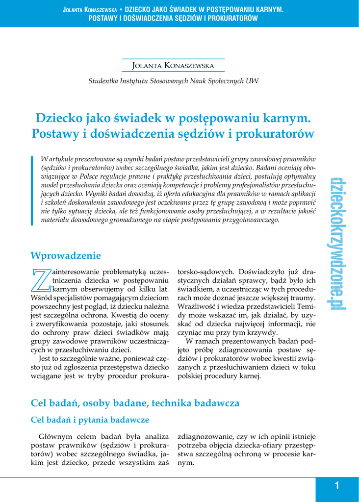 Jolanta Konaszewska • dziecko jako świadek w postępowaniu karnym. Postawy i doświadczenia sędziów i prokuratorów Jolanta Konaszewska Studentka Instytutu Stosowanych Nauk Społecznych UW Dziecko jako świadek w postępowaniu karnym. Postawy i doświadczenia sędziów i prokuratorów W artykule prezentowane są wyniki badań postaw przedstawicieli grupy zawodowej prawników (sędziów i prokuratorów) wobec szczególnego świadka, jakim jest dziecko. Badani oceniają obowiązujące w Polsce regulacje prawne i praktykę przesłuchiwania dzieci, postulują optymalny model przesłuchania dziecka oraz oceniają kompetencje i problemy profesjonalistów przesłuchujących dziecko. Wyniki badań dowodzą, iż oferta edukacyjna dla prawników w ramach aplikacji i szkoleń doskonalenia zawodowego jest oczekiwana przez tę grupę zawodową i może poprawić nie tylko sytuację dziecka, ale też funkcjonowanie osoby przesłuchującej, a w rezultacie jakość materiału dowodowego gromadzonego na etapie postępowania przygotowawczego. Wprowadzenie ainteresowanie problematyką uczestniczenia dziecka w postępowaniu karnym obserwujemy od kilku lat. Wśród specjalistów pomagającym dzieciom powszechny jest pogląd, iż dziecku należna jest szczególna ochrona. Kwestią do oceny i zweryfikowania pozostaje, jaki stosunek do ochrony praw dzieci świadków mają grupy zawodowe prawników uczestniczących w przesłuchiwaniu dzieci. Jest to szczególnie ważne, ponieważ często już od zgłoszenia przestępstwa dziecko wciągane jest w tryby procedur prokura- torsko-sądowych. Doświadczyło już drastycznych działań sprawcy, bądź było ich świadkiem, a uczestnicząc w tych procedurach może doznać jeszcze większej traumy. Wrażliwość i wiedza przedstawicieli Temidy może wskazać im, jak działać, by uzyskać od dziecka najwięcej informacji, nie czyniąc mu przy tym krzywdy. W ramach prezentowanych badań podjęto próbę zdiagnozowania postaw sędziów i prokuratorów wobec kwestii związanych z przesłuchiwaniem dzieci w toku polskiej procedury karnej. Cel badań, osoby badane, technika badawcza Cel badań i pytania badawcze Głównym celem badań była analiza postaw prawników (sędziów i prokuratorów) wobec szczególnego świadka, jakim jest dziecko, przede wszystkim zaś zdiagnozowanie, czy w ich opinii istnieje potrzeba objęcia dziecka-ofiary przestępstwa szczególną ochroną w procesie karnym. 1 Jolanta Konaszewska • dziecko jako świadek w postępowaniu karnym. Postawy i doświadczenia sędziów i prokuratorów W ramach tak określonego celu sformułowano następujące pytania badawcze: – Jak sędziowie i prokuratorzy postrzegają możliwości rozwojowe dzieci? Czy widzą różnice w funkcjonowaniu poznawczym dziecka i osoby dorosłej? – Jak zdaniem badanych funkcjonuje dziecko w trakcie przesłuchania? – Jak badani oceniają kompetencje swoje i swoich kolegów w kontakcie z dzieckiem świadkiem? – Jakie problemy – zarówno proceduralne, jak i techniczne – związane z czynnością przesłuchania dziecka dostrzegają badani? – Jakie są opinie badanych na temat op- tymalnych warunków i sposobów przesłuchania dziecka świadka? – Jak badani oceniają praktykę przesłuchiwania dzieci w trybie art. 185a i 185b k.p.k.? – Jak badani oceniają możliwość przygotowania dziecka do uczestnictwa w procedurach sądowych przez kompetentne osoby? – Jaką rolę w zakresie ochrony dziecka i jakości materiału dowodowego pełni, zdaniem badanych, przygotowanie dziecka do przesłuchania? – Czy badani widzą potrzebę funkcjonowania programu Opiekun dziecka – ofiary przestępstwa? Technika badawcza. Osoby badane W maju 2007 r. Fundacja Dzieci Niczyje zorganizowała szkolenie w zakresie przyjaznego przesłuchiwania dzieci świadków dla sędziów wydziałów karnych i prokuratorów z terenu sądów okręgowych w Szczecinie, Grudziądzu oraz Białegostoku. Na początku szkolenia w około 20-osobowych grupach uczestników przeprowadzono badania techniką ankiety audytoryjnej. Kwestionariusz anonimowej ankiety składał się z 17 pytań zamkniętych oraz 3 otwartych. W badaniu uczestniczyło 61 sędziów i prokuratorów (35 kobiet, 26 mężczyzn). Ponad połowa respondentów (54,1%, 33 osoby) wykonywała zawód sędziego, 36,1% badanych (22 osoby) było prokuratorami, 9,8% nie udzieliło odpowiedzi na pytanie o wykonywany zawód. Prawnicy objęci niniejszym badaniem, to w większości osoby stosunkowo młode: 65,6% to osoby między 30.–40. rokiem życia, 11,5% wieku 41–50 lat, a po 6,6% – osoby do 30. roku życia oraz powyżej 51. roku życia. Ze względu na stosunkowo młody wiek respondentów staż zawodowy blisko połowy badanej grupy nie przekraczał 10 lat. Niemal wszyscy badani, bo aż 95,1%, uczestniczyli w sprawach karnych, w których przesłuchiwane były pokrzywdzone dzieci. Wyniki badań Postawy sędziów i prokuratorów wobec dziecka świadka Rozwojowe uwarunkowania funkcjonowania poznawczego, emocjonalnego i społecznego dzieci Dziecko uczestniczące w procedurach bardzo ważny czynnik warunkujący przekarnych jest szczególnym świadkiem ze bieg przesłuchania małoletniego świadka względu na specyfikę swojego rozwoju (Teoplitz-Winiewska 2004). w zakresie poznawczym, emocjonalnym W celu zdiagnozowania opinii badanych i społecznym. Świadomość przesłuchują- na temat rozwojowych uwarunkowań cych co do możliwości dziecka w wymie- funkcjonowania świadków zapytano renionych aspektach stanowi niewątpliwie spondentów, czy widzą różnice w funkcjo- 2 Jolanta Konaszewska • dziecko jako świadek w postępowaniu karnym. Postawy i doświadczenia sędziów i prokuratorów nowaniu dziecka w zakresie umiejętności komunikacji, spostrzegania i odtwarzania informacji, kontroli emocji, rozumienia sytuacji, w której się znajduje, podatności na sugestię oraz skłonności do konfabulacji. Pytania sformułowano w kontekście odmienności mał