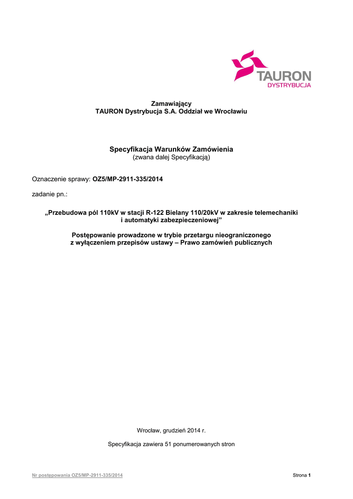 Zamawiający TAURON Dystrybucja S.A. Oddział we Wrocławiu Specyfikacja Warunków Zamówienia (zwana dalej Specyfikacją) Oznaczenie sprawy: OZ5/MP-2911-335/2014 zadanie pn.: „Przebudowa pól 110kV w stacji R-122 Bielany 110/20kV w zakresie telemechaniki i automatyki zabezpieczeniowej” Postępowanie prowadzone w trybie przetargu nieograniczonego z wyłączeniem przepisów ustawy – Prawo zamówień publicznych Sporządził Przewodniczący Komisji ZATWIERDZAM ........................................... ........................................... data i podpis data i podpis Dział Przetargów ........................................... Dyrektor Pionu data i podpis ........................................... ........................................... data i podpis data i podpis Wrocław, grudzień 2014 r. Specyfikacja zawiera 51 ponumerowanych stron Nr postępowania OZ5/MP-2911-335/2014 Strona 1 SPIS TREŚCI 1. OPIS PRZEDMIOTU ZAMÓWIENIA ...................................................................................................... 3 2. OPIS PRZYGOTOWANIA OFERTY ....................................................................................................... 3 3. WARUNKI UDZIAŁU W POSTĘPOWANIU ............................................................................................ 5 4. WYMAGANE DOKUMENTY ................................................................................................................... 6 5. ZASADY DOTYCZĄCE WYKLUCZENIA WYKONAWCÓW, ODRZUCENIA OFERT I UNIEWAŻNIENIA POSTĘPOWANIA. .................................................................................................... 6 6. OPIS SPOSOBU OBLICZANIA CENY OFERTY.................................................................................... 6 7. KRYTERIA OCENY OFERT I ZASADY ICH OCENY............................................................................. 7 8. WADIUM ................................................................................................................................................. 7 9. ZABEZPIECZENIE NALEŻYTEGO WYKONANIA UMOWY .................................................................. 8 10. ZMIANA I UDZIELANIE WYJAŚNIEŃ DOTYCZĄCYCH SPECYFIKACJI ............................................. 8 11. TERMIN I MIEJSCE SKŁADANIA OFERT ............................................................................................. 8 13. TERMIN ZWIĄZANIA OFERTĄ .............................................................................................................. 9 14. POSTANOWIENIA KOŃCOWE .............................................................................................................. 9 Załącznik nr 1 do Specyfikacji .................................................................................................................. 10 Załącznik nr 2 do Specyfikacji .................................................................................................................. 12 Załącznik nr 3 do Specyfikacji .................................................................................................................. 13 Załącznik nr 4 do Specyfikacji .................................................................................................................. 14 Załącznik nr 5 do Specyfikacji .................................................................................................................. 15 Załącznik nr 6 do Specyfikacji .................................................................................................................. 17 Załącznik nr 7 do Specyfikacji .................................................................................................................. 38 Nr postępowania OZ5/MP-2911-335/2014 Strona 2 SPECYFIKACJA TAURON Dystrybucja Spółka Akcyjna Oddział we Wrocławiu, tel. 71/ 889-21-33 faks 71/ 88921-26, zwana dalej Zamawiającym, zaprasza do udziału w postępowaniu o udzielenie zamówienia w trybie przetargu nieograniczonego na realizację zadania pn.: Przebudowa pól 110kV w stacji R-122 Bielany 110/20kV w zakresie telemechaniki i automatyki zabezpieczeniowej na zasadach opisanych w niniejszej Specyfikacji oraz Zasadach udzielania zamówień w TAURON Dystrybucja S.A. (dalej: Zasady), udostępnionym na stronie internetowej Zamawiającego. 1. OPIS PRZEDMIOTU ZAMÓWIENIA Przedmiotem zamówienia jest wykonanie dokumentacji projektowej i przebudowa pól 110kV w stacji R-122 Bielany 110/20kV w zakresie telemechaniki i automatyki zabezpieczeniowej. Szczegółowy opis przedmiotu zamówienia zawiera załącznik nr 7 do SWZ. Zamawiający nie dopuszcza możliwości składania ofert częściowych. Zamawiający nie dopuszcza możliwości składania ofert wariantowych. Szczegółowe zasady realizacji przedmiotu zamówienia zawarte są w projekcie umowy (zał. nr 6 do SWZ). 2. OPIS PRZYGOTOWANIA OFERTY 1. Oferta musi zawierać: 1.1 Wypełniony formularz ofertowy (wg wzoru w załączniku nr 1 do SWZ). 1.2 Dokumenty i oświadczenia potwierdzające spełnienie przez Wykonawców warunków udziału w postępowaniu określone w pkt. 4 Specyfikacji. 1.3 Pełnomocnictwo lub inny dokument, z którego wynika, że Wykonawcy ubiegający się wspólnie o udzielenie zamówienia ustanowili pełnomocnika do reprezentowania ich w postępowaniu o udzielenie niniejszego zamówienia lub do reprezentowania ich w postępowaniu oraz zawarcia umowy o udzielenie przedmiotowego zamówienia (o ile taka sytuacja występuje). 1.4 Pełnomocnictwo do podpisania oferty (w przypadku, gdy upoważnienie do podpisania oferty nie wynika bezpośrednio ze złożonego w ofercie odpisu z właściwego rejestru albo nie wynika z Centralnej Ewidencji i Informacji o Działalności Gospodarczej). 2. Przygotowanie oferty 2.1 Wykonawca powinien zapoznać się ze wszystkimi wymaganiami określonymi w niniejszej Specyfikacji i zdobyć wszelkie informacje, które mogą być przydatne do przygotowan