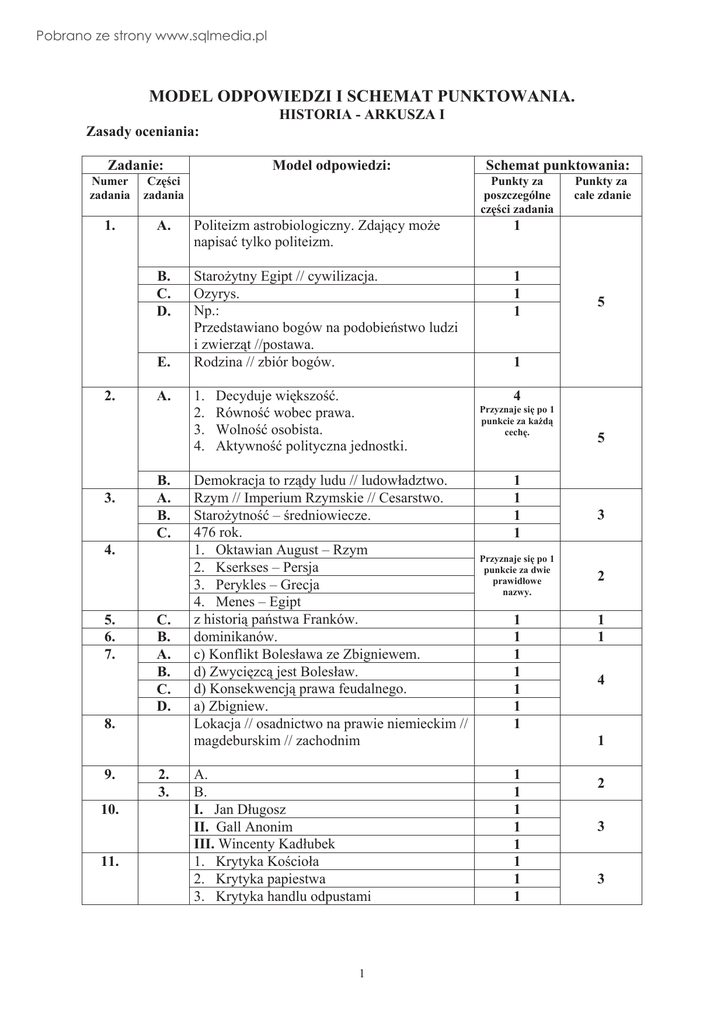 Pobrano ze strony www.sqlmedia.pl MODEL ODPOWIEDZI I SCHEMAT PUNKTOWANIA. HISTORIA - ARKUSZA I Zasady oceniania: Zadanie: Model odpowiedzi: Schemat punktowania: Numer zadania CzĊĞci zadania 1. A. Politeizm astrobiologiczny. Zdający moĪe napisaü tylko politeizm. 1 B. C. D. StaroĪytny Egipt // cywilizacja. Ozyrys. Np.: Przedstawiano bogów na podobieĔstwo ludzi i zwierząt //postawa. Rodzina // zbiór bogów. 1 1 1 E. 2. 3. A. B. A. B. C. 4. 5. 6. 7. C. B. A. B. C. D. 8. 9. 10. 11. 2. 3. Punkty za poszczególne czĊĞci zadania 1. 2. 3. 4. Decyduje wiĊkszoĞü. RównoĞü wobec prawa. WolnoĞü osobista. AktywnoĞü polityczna jednostki. Demokracja to rządy ludu // ludowáadztwo. Rzym // Imperium Rzymskie // Cesarstwo. StaroĪytnoĞü – Ğredniowiecze. 476 rok. 1. Oktawian August – Rzym 2. Kserkses – Persja 3. Perykles – Grecja 4. Menes – Egipt z historią paĔstwa Franków. dominikanów. c) Konflikt Bolesáawa ze Zbigniewem. d) ZwyciĊzcą jest Bolesáaw. d) Konsekwencją prawa feudalnego. a) Zbigniew. Lokacja // osadnictwo na prawie niemieckim // magdeburskim // zachodnim A. B. I. Jan Dáugosz II. Gall Anonim III. Wincenty Kadáubek 1. Krytyka KoĞcioáa 2. Krytyka papiestwa 3. Krytyka handlu odpustami 1 Punkty za caáe zdanie 5 1 4 Przyznaje siĊ po 1 punkcie za kaĪdą cechĊ. 1 1 1 1 Przyznaje siĊ po 1 punkcie za dwie prawidáowe nazwy. 1 1 1 1 1 1 1 5 3 2 1 1 4 1 1 1 1 1 1 1 1 1 2 3 3 Pobrano ze strony www.sqlmedia.pl 12. A. B. C. 13 A. B. C. D. E. 14. 15. 16. 17. 18. D. A. B. C. D. E. F. C. Dualizm gospodarczy doprowadziá do podziaáu Europy pod wzglĊdem tempa rozwoju gospodarczego na obszar rozwoju elementów kapitalizmu i obszar, w którym nastĊpowaáy procesy refeudalizacji. Np.: 1. Rozwój paĔszczyzny. 2. Rozwój folwarku szlacheckiego. àaba stanowiáa granicĊ podziaáu Europy pod wzglĊdem gospodarczym Ameryka Póánocna, ĝrodkowa, Poáudniowa Cel doraĨny eksploatacja bogactw. Cel dalekosiĊĪny trwaáe opanowanie kontynentu. Europejczyków cechowaá brak tolerancji, w drodze podboju i terroru eliminowali Indian. Np.: Dla Indian kolonializm byá podbojem i zagáadą, dla Europejczyków Ĩródáem bogactw i rozwoju. Np.; Proces ten odbywaá siĊ... Stryjkowski przedstawia odwieczny dylemat historyka, Īe krytyka wspóáczesnych moĪe byü dla badacza niebezpieczna. Demokracja szlachecka. ħródáo ikonograficzne. Leonardo da Vinci Dama z gronostajem (áasiczką). Renesans. Np.: Anatomia, czáowiek, proporcje. Polska. Artykuáy Henrykowskie. Trzy stany sejmujące - król, senatorowie, posáowie szlacheccy. 1 4 2 1 1 1 1 5 1 1 1 1 1 1 1 1 1 1 1 1 6 1 3 Przyznaje siĊ 1 punkt za kaĪde prawidáowe wskazanie. 19. A B 3 C 20. C. Uchwalenie Konstytucji 3 Maja. 2 1 1 Pobrano ze strony www.sqlmedia.pl 21. 22. A. B. C. 23. 24. 25. 26. 27. 28. 1. 2. 3. 4. A. B. C. D. A. B. C. D. E. F. 29. A. B. C. Tradycja, wiara w autorytety, ewolucja polit. WieĪa Eiffla ParyĪ Np.: 1. Konstrukcja stalowa. 2. Rozmiary // wysokoĞü. Zdający powinien kolejno uzupeániü: styczniowe, XIX, branka, wojska rosyjskiego // wojska, Aleksander Wielopolski // Wielopolski. 1. Katolicy // katolicyzm. 2. ĩydzi // judaizm. 3. Prawosáawni // prawosáawie. Np.: 1. ZróĪnicowany rozwój demograficzny. 2. ZróĪnicowany rozwój gospodarczy. 3. ZróĪnicowany poziom analfabetyzmu. P F F P 4. 1. 3. 2. Wschodnia. Centralna i wschodnia. A. Statystyczne. B. Kartograficzne. 1. Polacy. 2. Rusini // UkraiĔcy. 3. Biaáorusini. 4. Niemcy. 5. Litwini. a) Īyáa w rozproszeniu gáównie w miastach Np.: 1. Spadek po rozbiorach. 2. Wáączenie do Polski Kresów. 3. Wáączenie do Polski Pomorza. 1. Attlee. 2. Truman. 3. Stalin. Stalin przywódca // dyktator, Moáotow minister spraw zagranicznych. Churchill 3 1 1 1 1 Przyznaje siĊ 1 punkt dwa elementy. 3 Przyznaje siĊ 1 punkt za kaĪde prawidáowe uzupeánienie. Przyznaje siĊ 1 punkt za kaĪde prawidáowe wskazanie. Przyznaje siĊ 1 punkt za kaĪde prawidáowe wskazanie. 1 1 1 1 Przyznaje siĊ po 1 punkcie za dwa wskazania 5 3 3 4 2 1 Przyznaje siĊ 1 punkt za obie nazwy. Przyznaje siĊ po 1 punkcie. Przyznaje siĊ po 1 punkcie. 13 1 Przyznaje siĊ po 1 punkcie. Przyznaje siĊ 1 punkt za trzy nazwiska Przyznaje siĊ 1 punkt. 1 3 Pobrano ze strony www.sqlmedia.pl 30. 31. 32. 33. D. Czesáaw Miáosz Np.: Przywódcy // wáadcy w PRL traktowali spoáeczeĔstwo jako przedmiot manipulacji i wymagali posáuszeĔstwa. Np.: Utworzenie niekomunistycznego rządu Mazowieckiego , poprzedzone legalizacją opozycyjnej SolidarnoĞci, zapoczątkowaáo podobne przemiany // rozkáad komunizmu w Europie Wschodniej. Np.: 1. Pierwszy papieĪ Polak. 2. Twórca niepodlegáej Polski w 1918 roku. 3. Laureat Pokojowej Nagrody Nobla. 4. Przywódca pierwszego zrywu niepodlegáoĞciowego. 5. Wielki astronom odrodzenia. 4 1 1 1 Przyznaje siĊ po 1 punkcie. 5