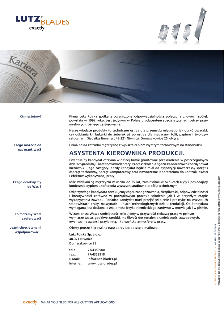 Kim jesteśmy? Firma Lutz Polska spó³ka z ograniczon¹ odpowiedzialności¹ po³¹czona z dwóch spó³ek powsta³a w 1992 roku. Jest jedynym w Polsce producentem specjalistycznych ostrzy przemys³owych ró¿nego zastosowania. Nasze wiod¹ce produkty to techniczne ostrza dla przemys³u miêsnego jak odskórowaczki, czy odb³aniarki, ³uskarki do ¿eberek a¿ po ostrza dla medycyny, folii, papieru i tworzyw sztucznych. Siedzib¹ firmy jest 48-321 Niwnica, Domaszkowice 25 k/Nysy. Firma nasza zatrudni mê¿czyznê z wykszta³ceniem wy¿szym technicznym na stanowisku ASYSTENTA KIEROWNIKA PRODUKCJI. Ewentualny kandydat otrzyma w naszej firmie gruntowne przeszkolenie w poszczególnych dzia³ach produkcji i na stanowiskach pracy. Proces szkolenia bêdzie ka¿dorazowo koordynowa³ kierownik i jego zastêpcy. Ka¿dy kandydat bêdzie mia³ do dyspozycji nowoczesny sprzêt i osprzêt techniczny, sprzêt komputerowy oraz nowoczesne laboratorium do kontroli jakości i efektów wykonywanej pracy. Czego oczekujemy od Was ? Mile widziani s¹ mê¿czyzni w wieku do 35 lat, zamieszkali w okolicach Nysy i posiadaj¹cy koniecznie dyplom ukoñczenia wy¿szych studiów o profilu technicznym. Od przysz³ego kandydata oczekujemy chêci, zaanga¿owania, cierpliwości, odpowiedzialności i kreatywności zarówno w pocz¹tkowym procesie szkolenia jak i w przysz³ym etapie wykonywania zawodu. Ponadto kandydat musi przejśæ szkolenie i praktykê na wszystkich stanowiskach pracy, maszynach i liniach technologicznych dzia³u produkcji. Od kandydata wymagana jest doskona³a znajomośc jezyka niemieckiego zarówno w mowie jak i w piśmie. Co mo¿emy Wam zaoferowaæ? Je¿eli chcecie z nami wspó³pracowaæ... W zamian za Wasze umiejêtności oferujemy w przysz³ości ciekaw¹ pracê w pe³nym wymiarze czasu, godziwe zarobki, mo¿liwośæ doskonalenia umiejêtności zawodowych, ewentualny awans i przyjemn¹, kole¿eñsk¹ atmosferê w pracy. Oferty proszê kierowæ na nasz adres lub pocztê e-mailow¹: Lutz Polska Sp. z o.o. 48-321 Niwnica Domaszkowice 25 tel.: fax.: E-Mail: lnternet: 77/4359900 77/4359918 [email protected] www.lutz-blades.pl WHAT YOU NEED FOR ALL CUTTING APPLICATIONS ASYSTENT KIEROWNIKA PRODUKCJI | WERSJA 07.08.2012 Wszystkie dane w tej publikacji podane s¹ bez rêkojmii. Odsy³amy na nasz¹ stronê www.lutz-blades.com Czego mo¿ecie od nas oczekiwaæ?