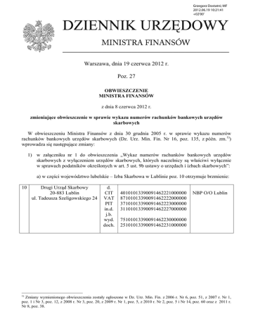 Grzegorz Dostatni; MF 2012.06.19 10:21:41 +02'00' Warszawa, dnia 19 czerwca 2012 r. Poz. 27 OBWIESZCZENIE MINISTRA FINANSÓW z dnia 8 czerwca 2012 r. zmieniające obwieszczenie w sprawie wykazu numerów rachunków bankowych urzędów skarbowych W obwieszczeniu Ministra Finansów z dnia 30 grudnia 2005 r. w sprawie wykazu numerów rachunków bankowych urzędów skarbowych (Dz. Urz. Min. Fin. Nr 16, poz. 135, z późn. zm.1)) wprowadza się następujące zmiany: 1) w załączniku nr 1 do obwieszczenia „Wykaz numerów rachunków bankowych urzędów skarbowych z wyłączeniem urzędów skarbowych, których naczelnicy są właściwi wyłącznie w sprawach podatników określonych w art. 5 ust. 9b ustawy o urzędach i izbach skarbowych”: a) w części województwo lubelskie – Izba Skarbowa w Lublinie poz. 10 otrzymuje brzmienie: 10 1) Drugi Urząd Skarbowy 20-883 Lublin ul. Tadeusza Szeligowskiego 24 d. CIT VAT PIT in.d. j.b. wyd. doch. 40101013390091462221000000 87101013390091462222000000 37101013390091462223000000 31101013390091462227000000 NBP O/O Lublin 75101013390091462230000000 25101013390091462231000000 Zmiany wymienionego obwieszczenia zostały ogłoszone w Dz. Urz. Min. Fin. z 2006 r. Nr 6, poz. 51, z 2007 r. Nr 1, poz. 1 i Nr 3, poz. 12, z 2008 r. Nr 3, poz. 20, z 2009 r. Nr 1, poz. 5, z 2010 r. Nr 2, poz. 5 i Nr 14, poz. 60 oraz z 2011 r. Nr 8, poz. 38. Dziennik Urzędowy Ministra Finansów –2– Poz. 27 b) w części województwo łódzkie – Izba Skarbowa w Łodzi poz. 3 otrzymuje brzmienie: 3 Urząd Skarbowy 95-015 Głowno ul. Ludwika Norblina 2 d. CIT VAT PIT in.d. j.b. wyd. doch. 59101013710004202221000000 NBP O/O Łódź 09101013710004202222000000 56101013710004202223000000 50101013710004202227000000 94101013710004202230000000 44101013710004202231000000 c) w części województwo mazowieckie – Izba Skarbowa w Warszawie: - poz. 15 otrzymuje brzmienie: 15 Urząd Skarbowy 07-300 Ostrów Mazowiecka ul. Duboisa 1 d. CIT VAT PIT in.d. j.b. wyd. doch. 94101010100433422221000000 NBP O/O 44101010100433422222000000 Warszawa 91101010100433422223000000 85101010100433422227000000 32101010100433422230000000 79101010100433422231000000 - poz. 32 otrzymuje brzmienie: 32 Urząd Skarbowy Warszawa-Mokotów 02-676 Warszawa ul. Postępu 16A d. CIT VAT PIT in.d. j.b. wyd. doch. 03101010100165482221000000 NBP O/O 50101010100165482222000000 Warszawa 97101010100165482223000000 91101010100165482227000000 38101010100165482230000000 85101010100165482231000000 2) w załączniku nr 2 do obwieszczenia „Wykaz rachunków bankowych urzędów skarbowych, których naczelnicy są właściwi wyłącznie w zakresie podatników określonych w art. 5 ust. 9b ustawy” w części województwo lubelskie - Izba Skarbowa w Lublinie poz. 3 otrzymuje brzmienie: 3 Lubelski Urząd Skarbowy 20-883 Lublin ul. Tadeusza Szeligowskiego 24 d. CIT VAT PIT in.d. j.b. wyd. doch. 06101013390077512221000000 53101013390077512222000000 03101013390077512223000000 94101013390077512227000000 41101013390077512230000000 88101013390077512231000000 NBP O/O Lublin Dziennik Urzędowy Ministra Finansów –3– Poz. 27 3) załącznik nr 4 do obwieszczenia otrzymuje brzmienie określone w załączniku do niniejszego obwieszczenia. Minister Finansów: wz. M. Grabowski Dziennik Urzędowy Ministra Finansów –4– Poz. 27 Załącznik do obwieszczenia Ministra Finansów z dnia 8 czerwca 2012 r. (poz. 27) Symbole formularza/tytułu płatności Symbol formularza/tytułu płatności*) Opis 1 2 Rodzaj rachunku bankowego (CIT/VAT/PIT/ in.d.)1) 3 CIT*) podatek dochodowy od osób prawnych CIT CIT-10Z**) deklaracja o wysokości pobranego przez płatnika zryczałtowanego podatku dochodowego od osób prawnych od dochodów (przychodów) osiągniętych przez podatników niemających siedziby lub zarządu na terytorium Rzeczypospolitej Polskiej CIT CIT-11R**) deklaracja o wysokości podatku dochodowego od dochodów z dywidend oraz innych przychodów z tytułu udziału w zyskach osób prawnych, wydatkowanych na inne cele niż wymienione w oświadczeniu CIT-5 lub deklaracji CIT-6AR CIT CIT-6R**) deklaracja o wysokości pobranego przez płatnika zryczałtowanego podatku dochodowego od osób prawnych, od dochodów (przychodów) osiągniętych przez podatnika mającego siedzibę lub zarząd na terytorium Rzeczypospolitej Polskiej CIT CIT-6AR**) deklaracja o wysokości podatku dochodowego od dochodów z tytułu udziału w zyskach osób prawnych CIT CIT-8 zeznanie o wysokości osiągniętego dochodu (poniesionej straty) przez podatnika podatku dochodowego od osób prawnych CIT CIT-8A zeznanie o wysokości osiągniętego dochodu (poniesionej straty) przez podatkową grupę kapitałową - podatnika podatku dochodowego od osób prawnych CIT CIT-8B zeznanie o wysokości osiągniętego dochodu (poniesionej straty) przez podatkową grupę kapitałową - podatnika podatku dochodowego od osób prawnych CIT Dziennik Urzędowy Ministra Finansów –5– Poz. 27 CIT-9R**) deklaracja o wysokości przychodu za wywóz ładunków i pasażerów przyjętych do przewozu w porcie polskim, uzyskanego przez zagraniczne przedsiębiorstwo żeglugi handlowej od zagranicznych zleceniodawców DJB**) inne dochody in.d. GK**) grzywny, mandaty i inne kary pieniężne od osób fizycznych grzywny i inne kary pieniężne od osób prawnych i in. jedn. organ. in.d. GKP**) POZOST.*)**) CIT in.d. in.d. KP*) podatek dochodowy opłacany w formie karty podatkowej in.d. NBP wpłaty z zysku NBP in.d. BGK wpłaty z zysku BGK in.d. OPR**) opłata restrukturyzacyjna in.d. podatek od czynności cywilnoprawnych in.d. PCC-2**) deklaracja o wysokości pobranego i wpłaconego podatku przez płatnika in.d. PCC-3**) deklaracja w sprawie podatku od czynności cywilnoprawnych in.d. PIT*) podatek dochodowy od osób fizycznych PIT PIT-23**) deklaracja o osiągniętych przychodach z odpłatnego zbycia nieruchomości lub praw majątkowych, objętych zryczałtowanym podatkiem dochodowym PIT PIT-28 zeznanie o wysoko